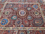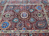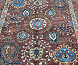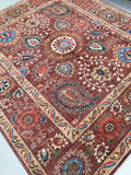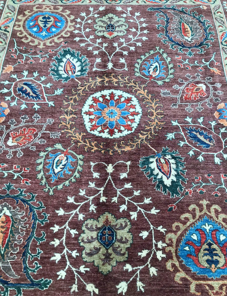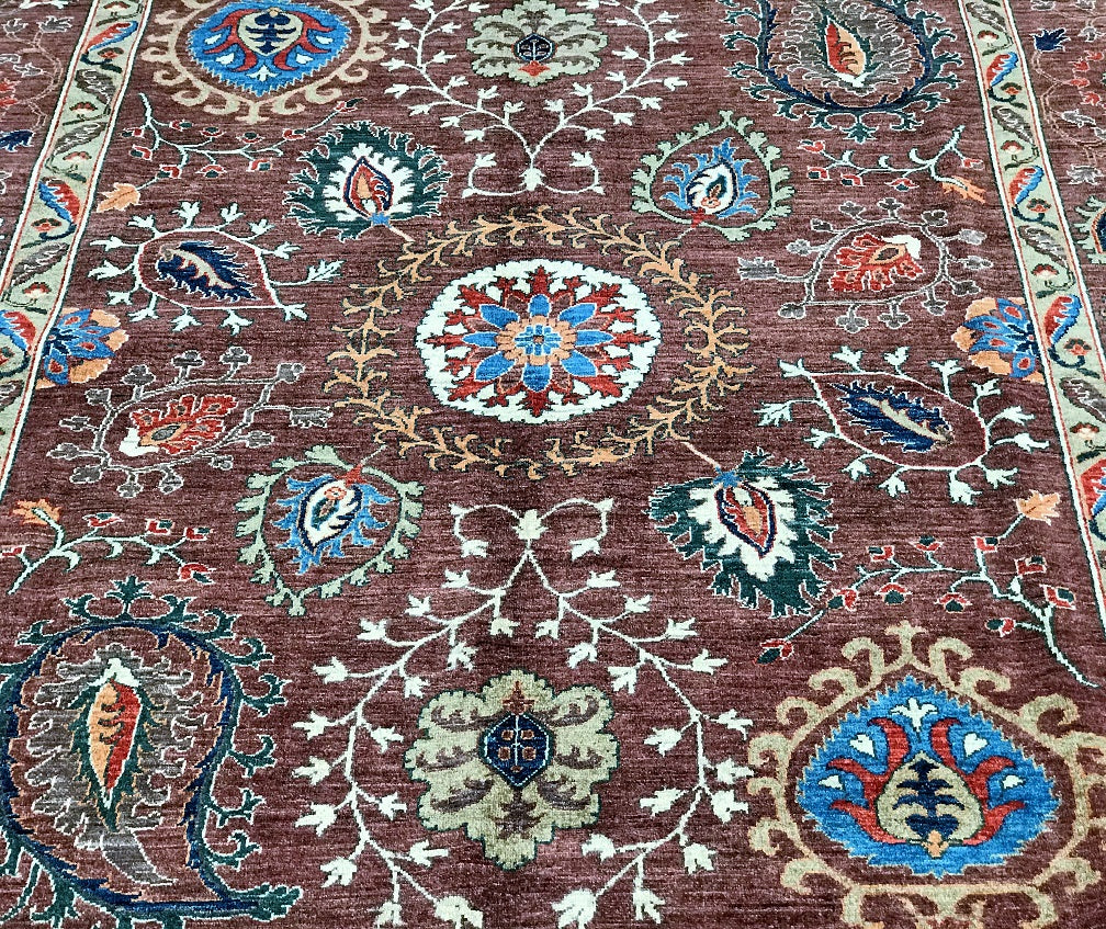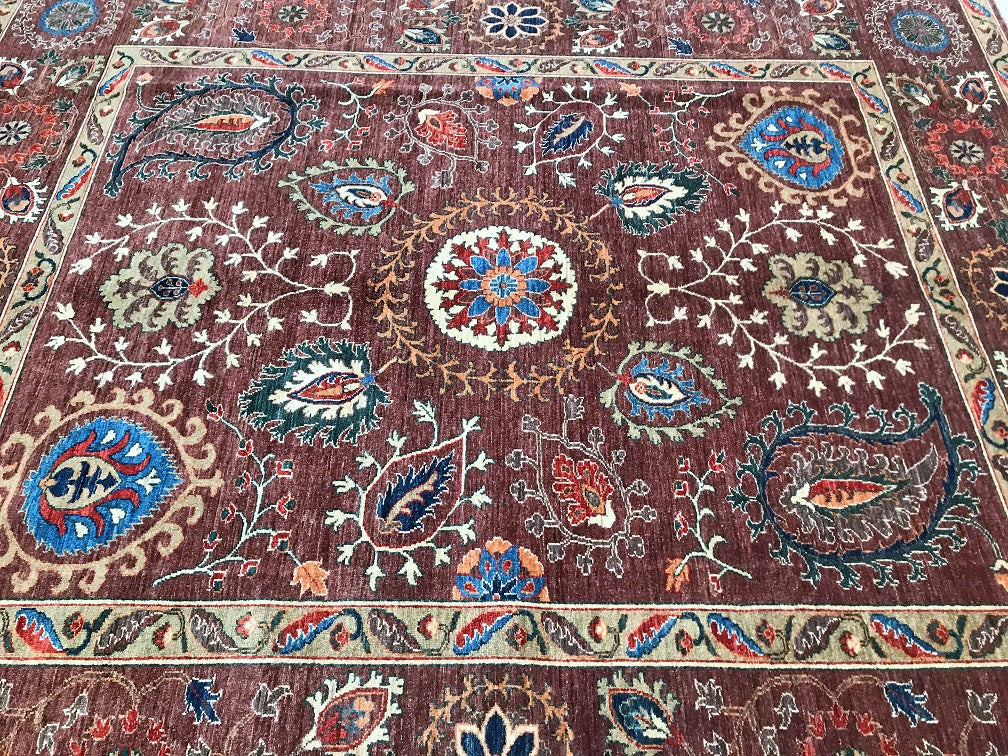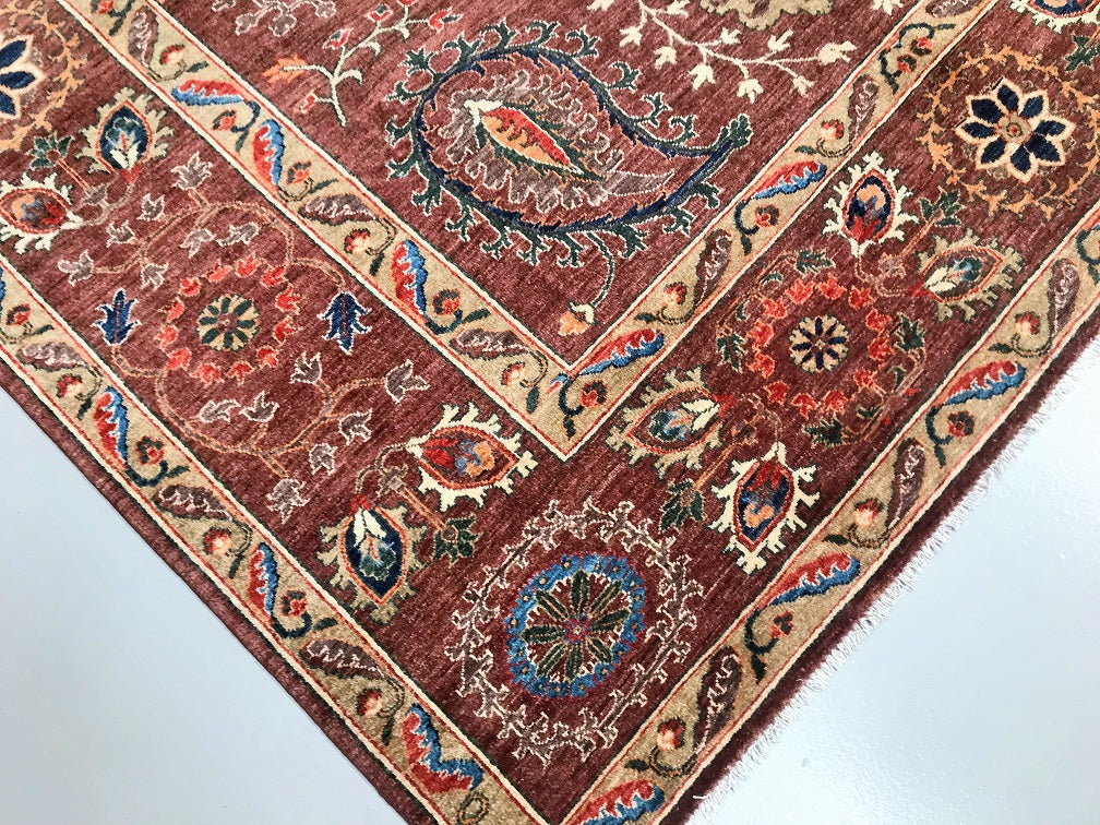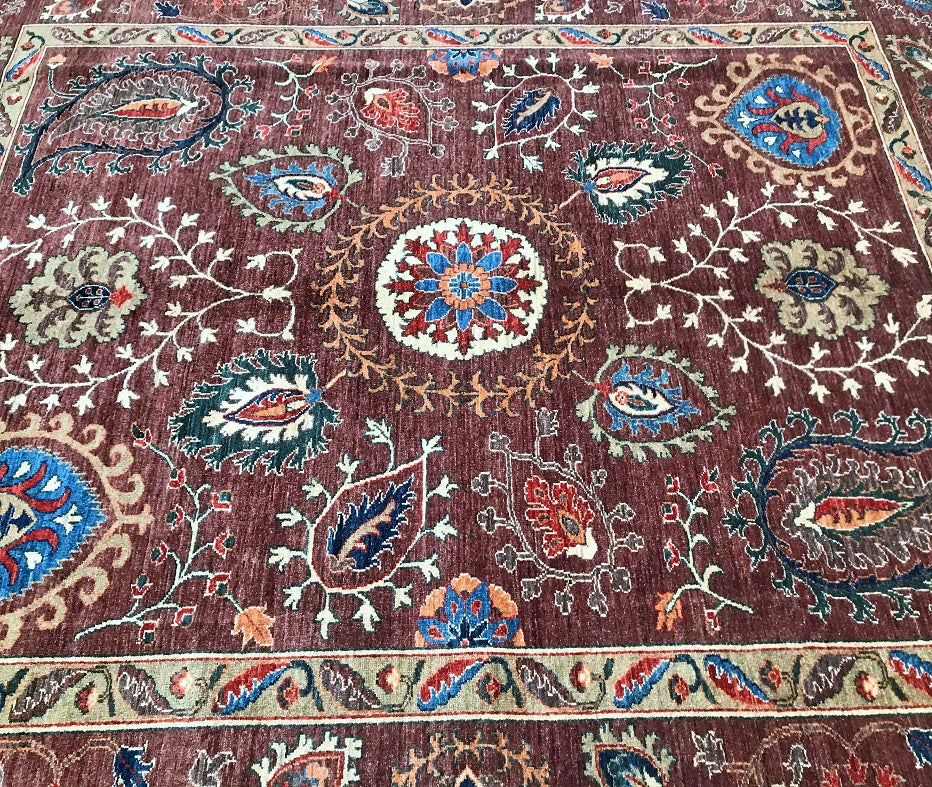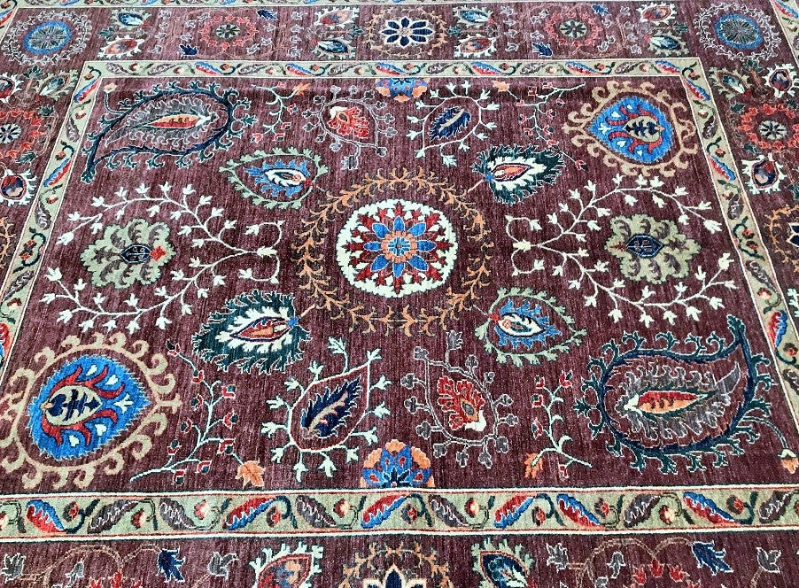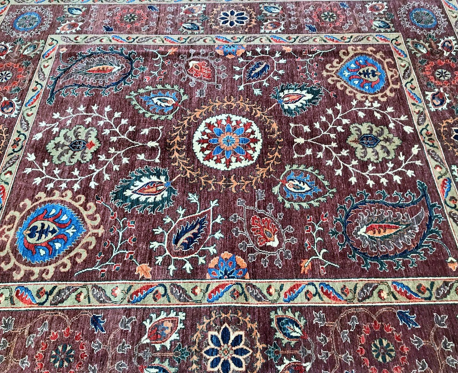 This Afghan Chobi rug is a stunning addition to any large room, showcasing the artistry of hand-knotting. It features a pure hand-spun wool pile meticulously woven onto a cotton base, ensuring both comfort and durability. The color palette is truly unique, with shades of brown, blue, terracotta, beige, and green, all dyed using traditional methods with vegetable dyes. This rug represents the last of true woven nomadic art, preserving a rich cultural heritage. The decorative floral design is a revival of the art deco pattern, adding a touch of elegance to any space. The level of craftsmanship involved is remarkable, as it would have taken two weavers approximately 9-12 months to complete this piece. Hand-woven in Afghanistan, this rug measures 285 x 241 cm and holds a gallery replacement value of $9500.