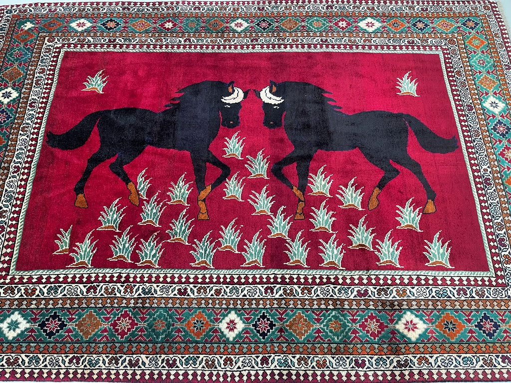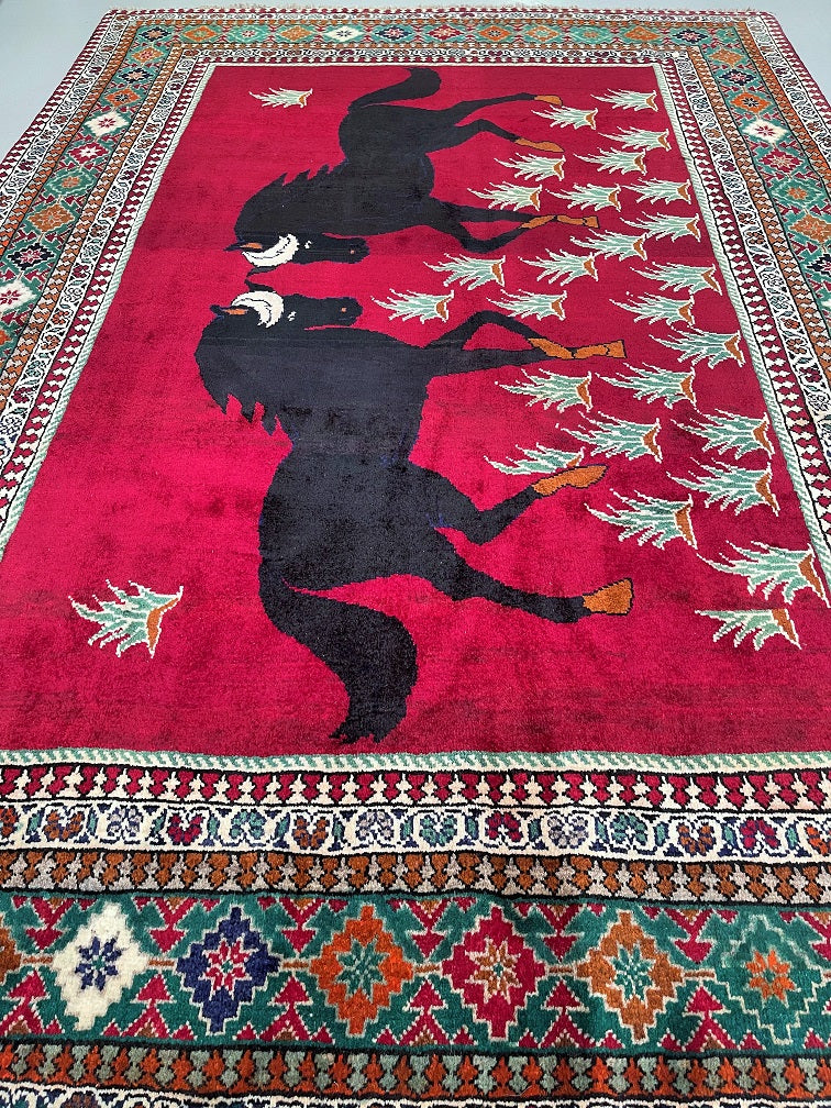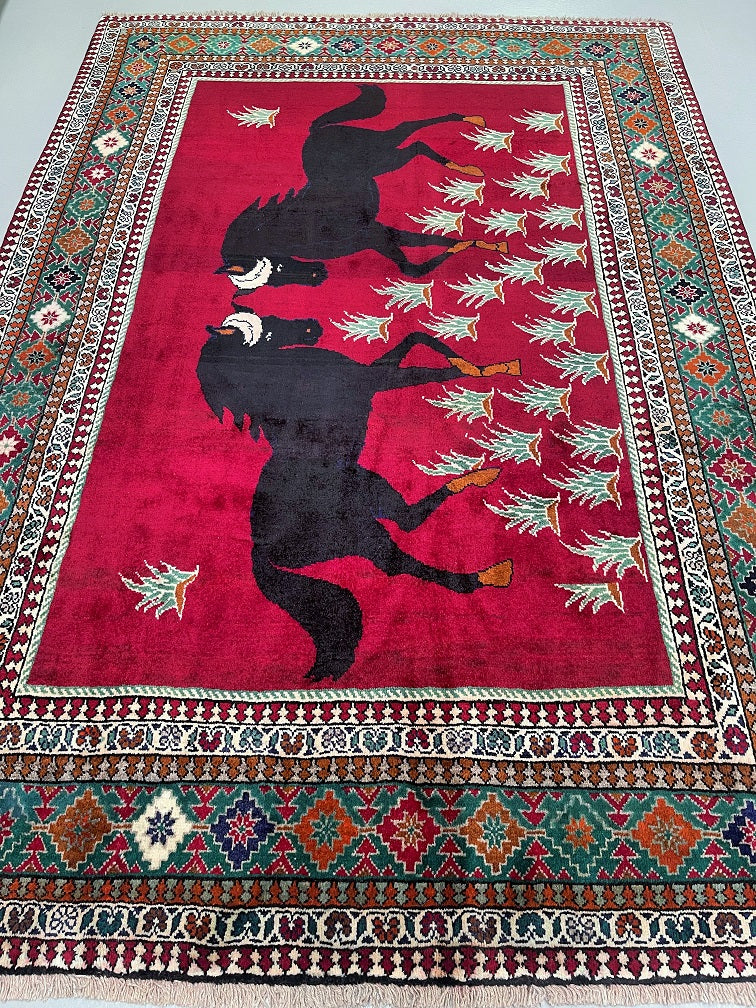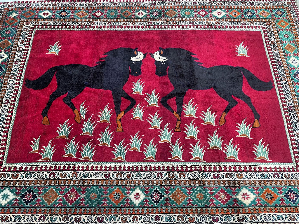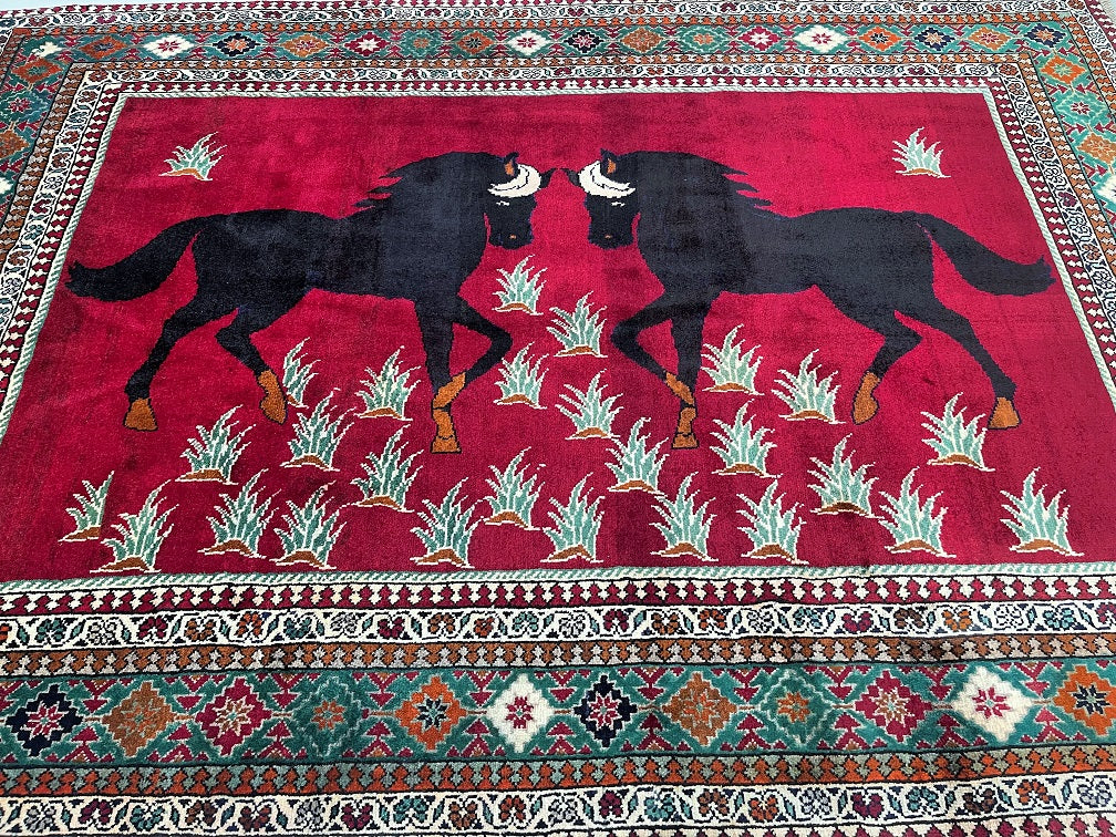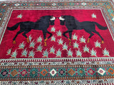 Collectible Full Room Size Handmade Pictorial Design Persian Qashghai Shiraz Rug. Above All It Is Hard To Find This Quality Original Handmade In Larger Sizes. Dense Wool Pile On Wool Base. It Also Has a Deep Red Tone Dyed Using Traditional Methods.