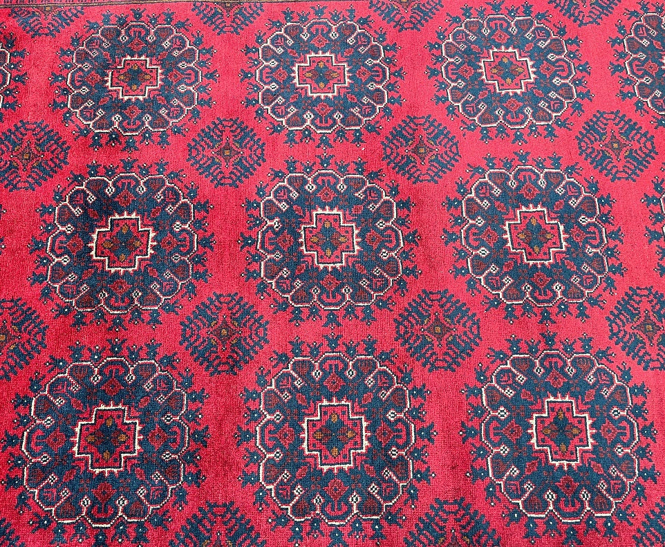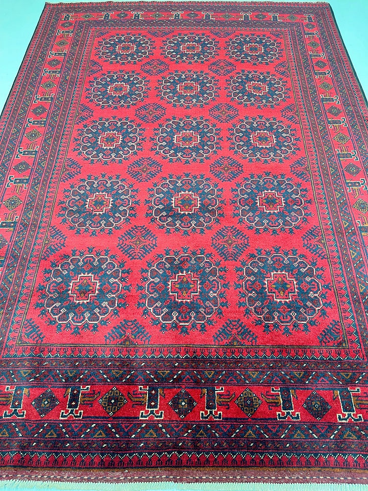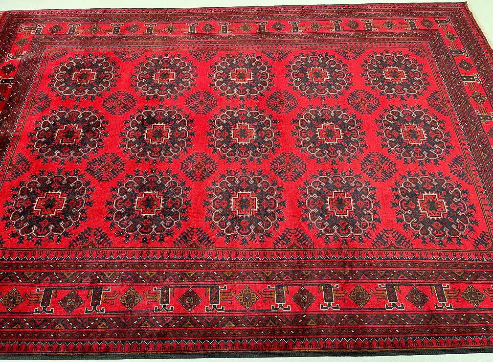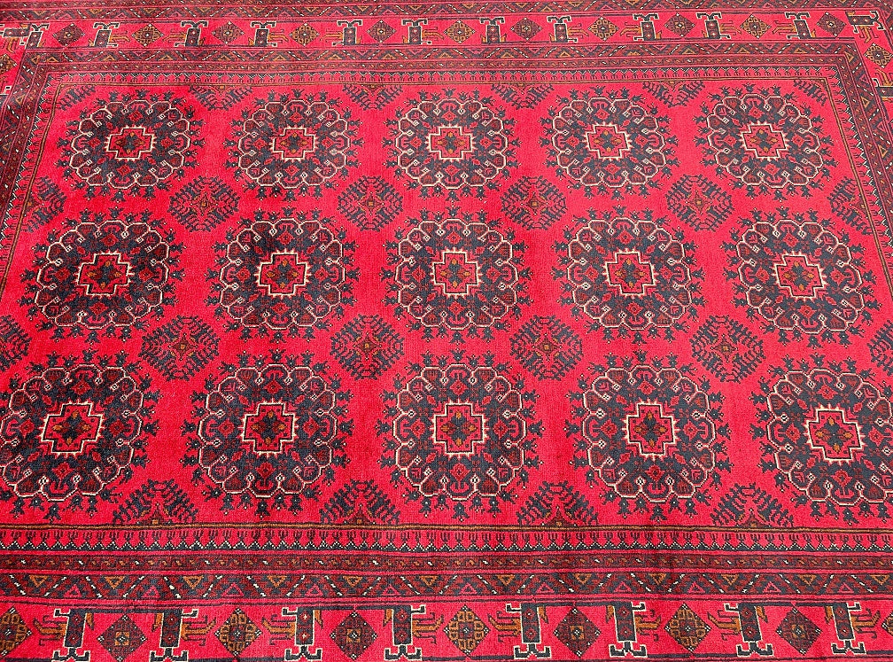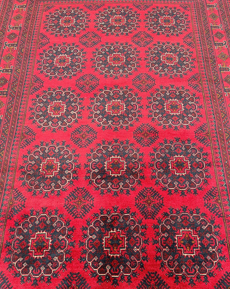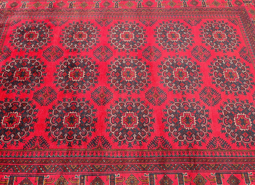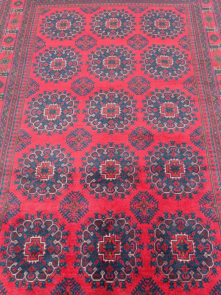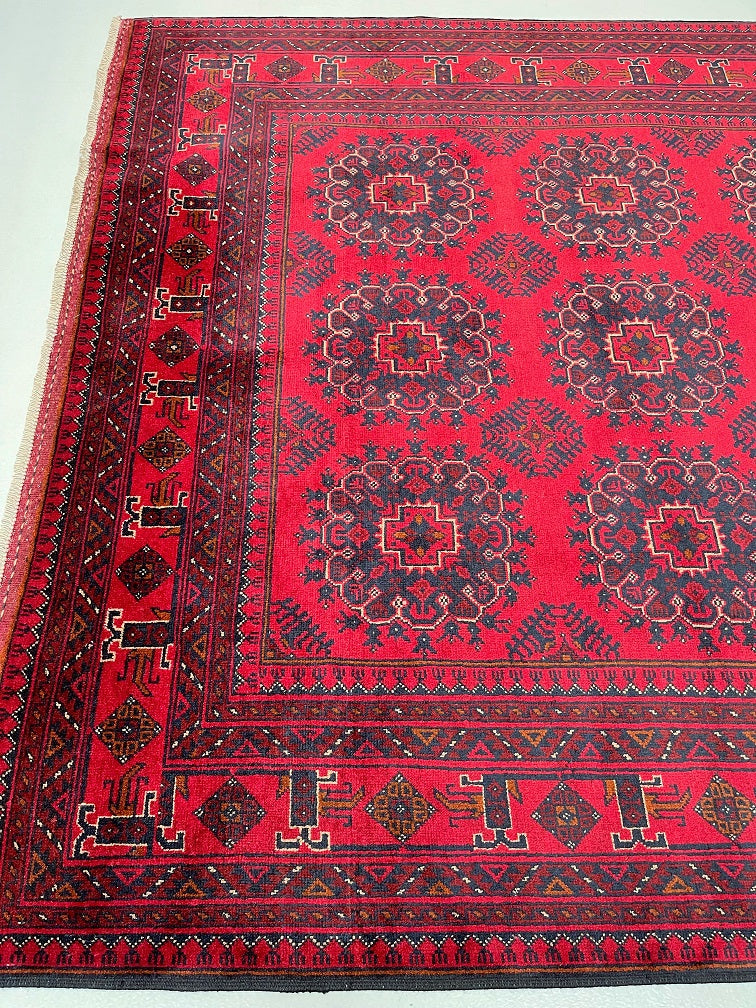 Durable Full Room Size Nomadic Hand Knotted Afghan Kunduz Rug. Above All It Has A Pure Hand Spun Wool Pile On Cotton Base. It Also Has a Burgundy/Maroon Tone Dyed Using Traditional Methods.