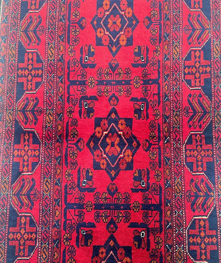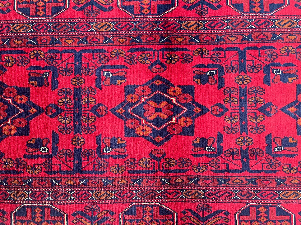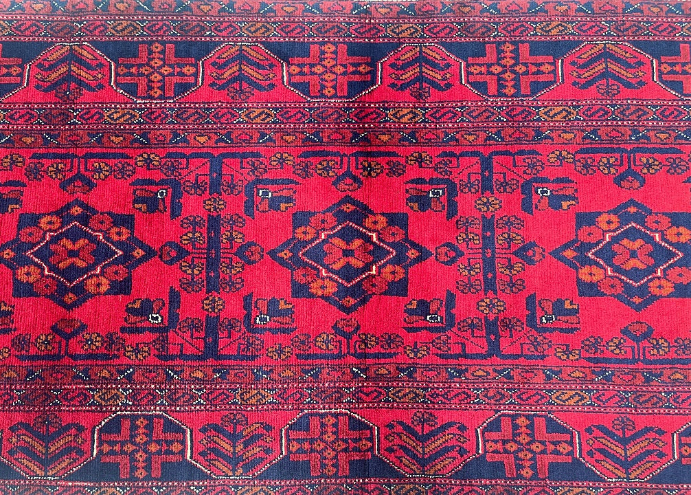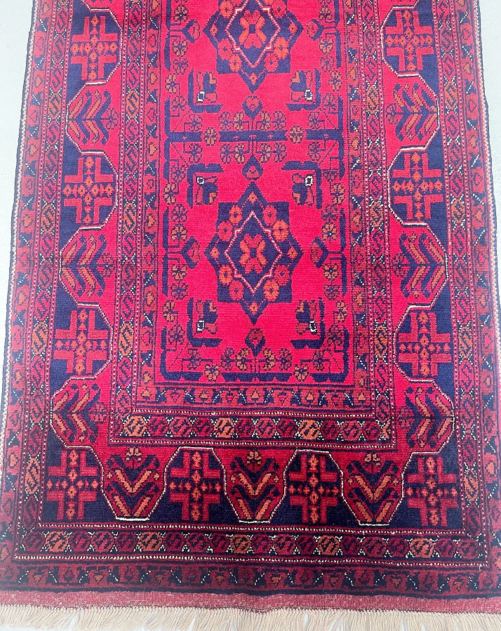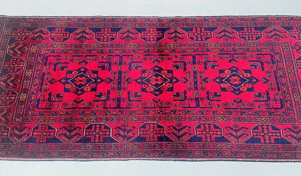 Authentic Hand Knotted Tribal Afghan Kunduz Hall Runner. Above All It Is Lamb’s Wool Pile On Cotton Base. Main Colors are Deep Maroon/Burgundy Terracotta, Indigo Blue, Beige, and Green Dyed Using Traditional Methods. This Runner Would Look Fantastic On Wooden Floor Board.