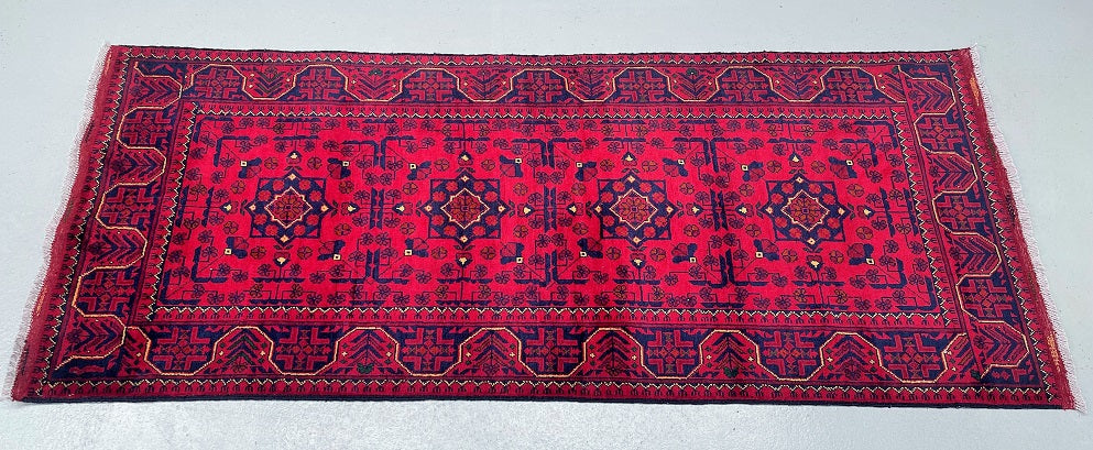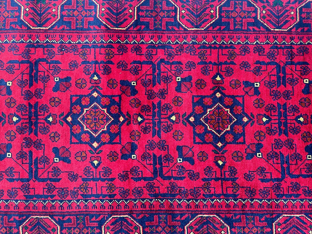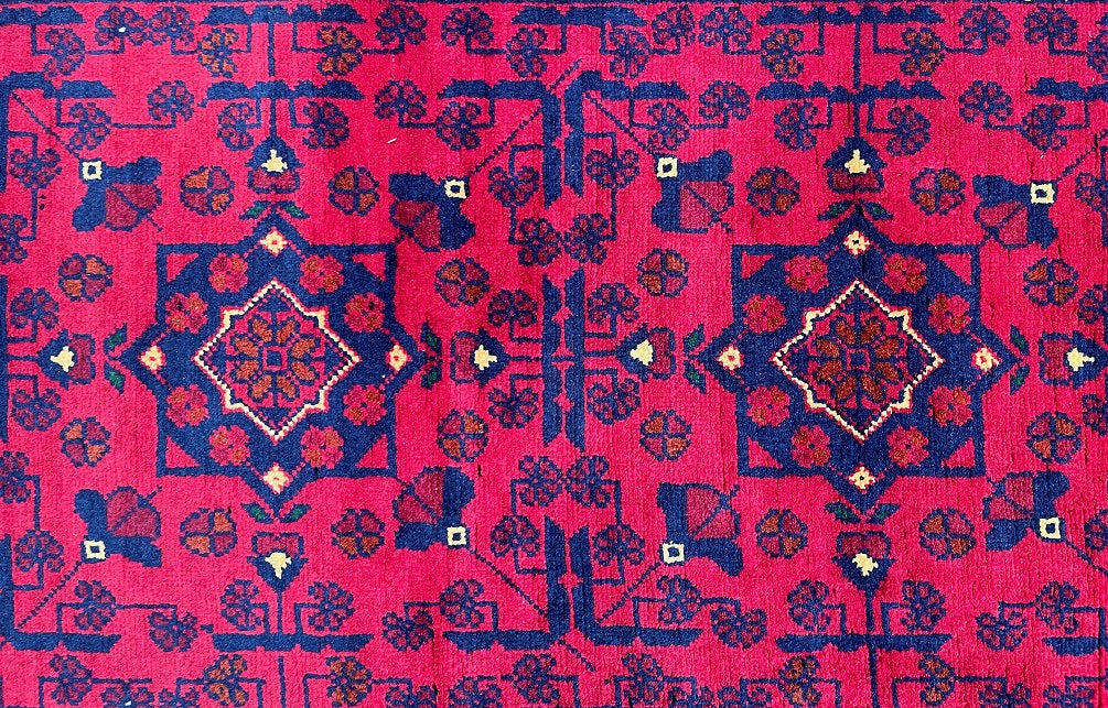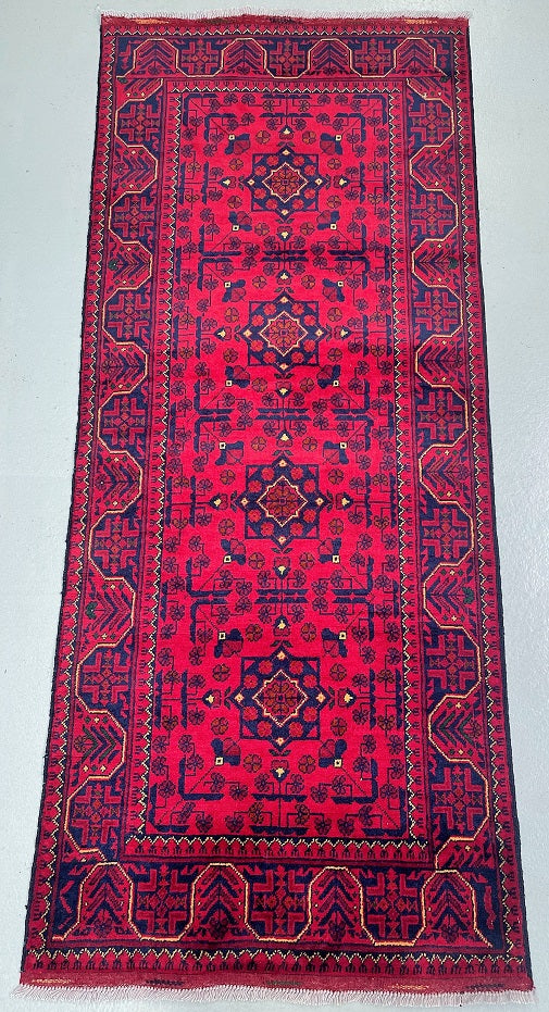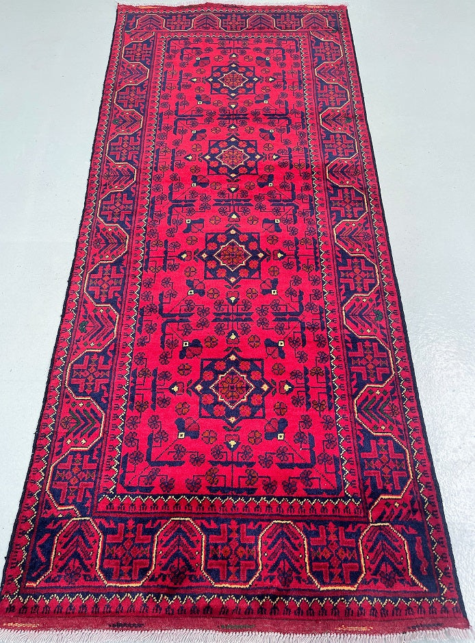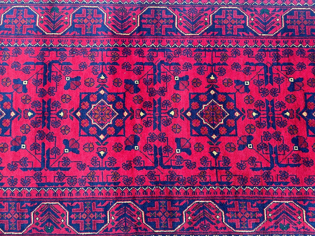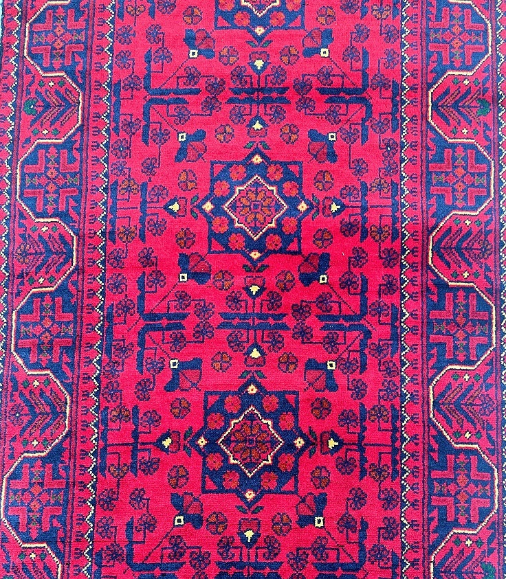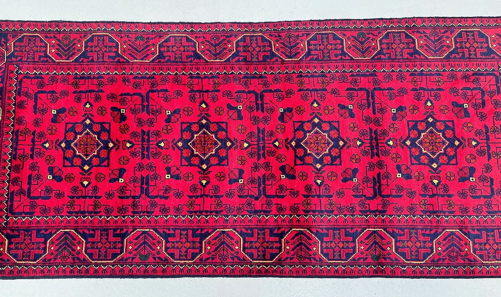 Gorgeous Authentic Hand Knotted Tribal Afghan Kunduz Hall Runner. Above All It Is Lamb’s Wool Pile On Cotton Base. Main Colors are Deep Maroon/Burgundy Terracotta, Indigo Blue And Beige Dyed Using Traditional Methods. This Runner Would Look Fantastic On Wooden Floor Board.