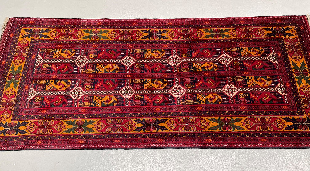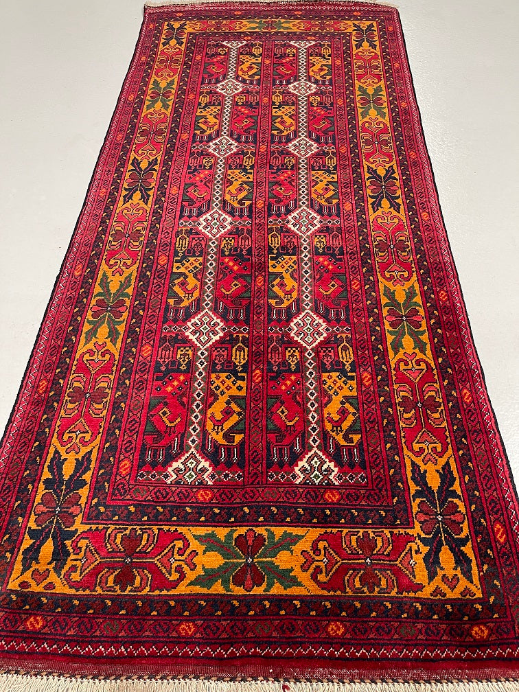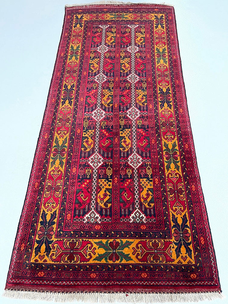 Amazing Authentic Hand Knotted Tribal Afghan Roshnai Hall Runner. It Has a Merino Wool Pile On Cotton Base. Main Colors are Maroon/Burnt Terracotta, Indigo Blue, Brown, Beige, Mustard and Green Dyed Using Traditional Methods. This Runner Would Look Fantastic On Wooden Floor Board.