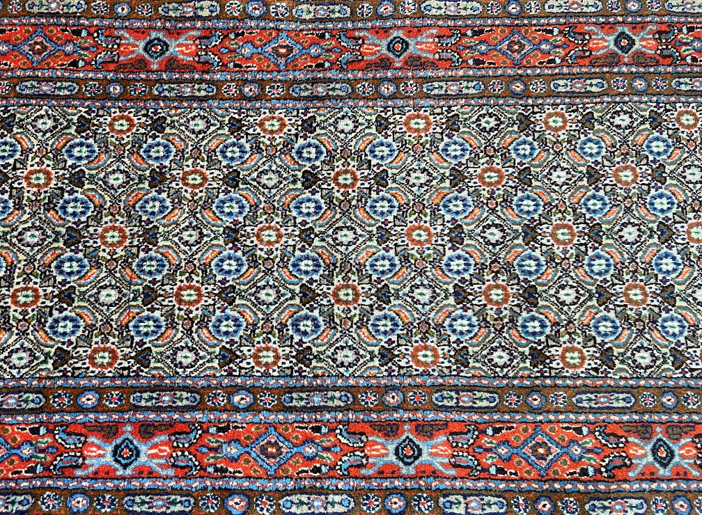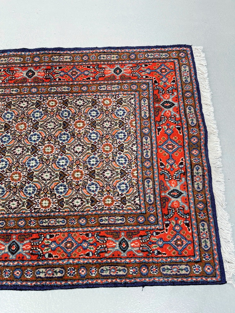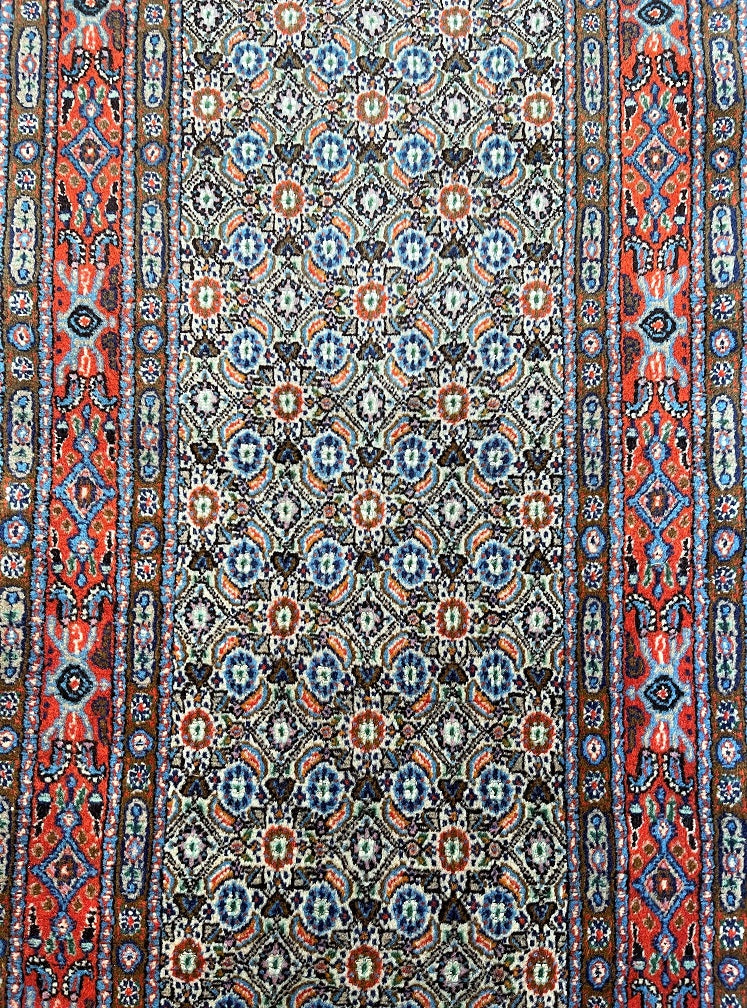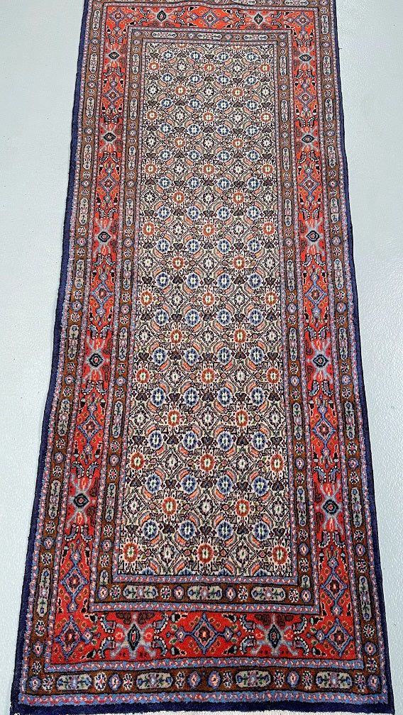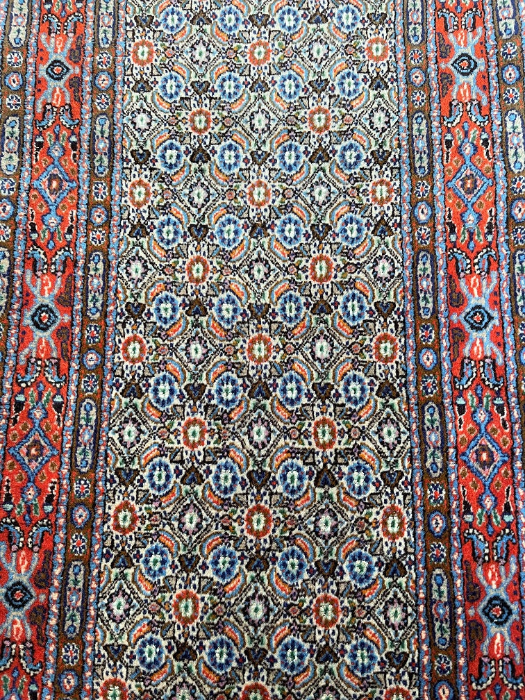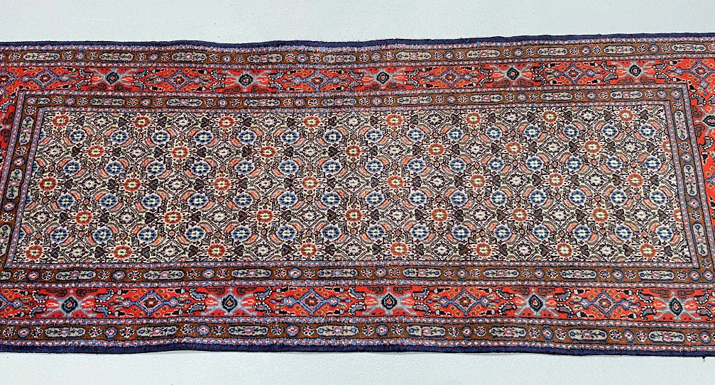 Fine Authentic Handmade Persian Birjand Hall Runner. Above All It Has A Wool With Touch Of Silk Pile on Fine Cotton. It Also Has A Beige, Blue, Red And Orange Tone Dyed Using Traditional Methods. Gorgeous