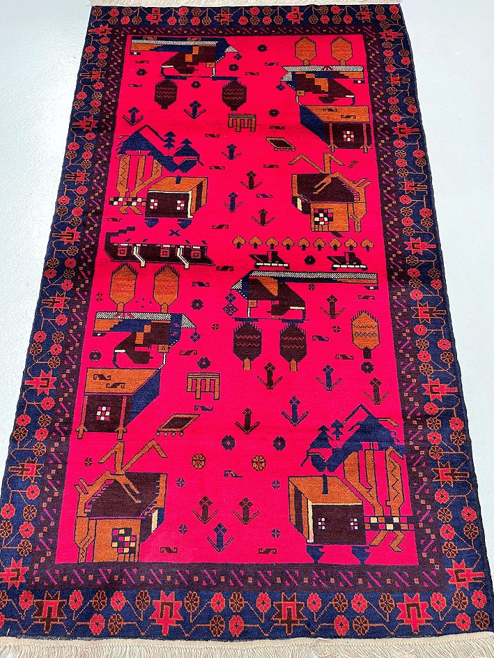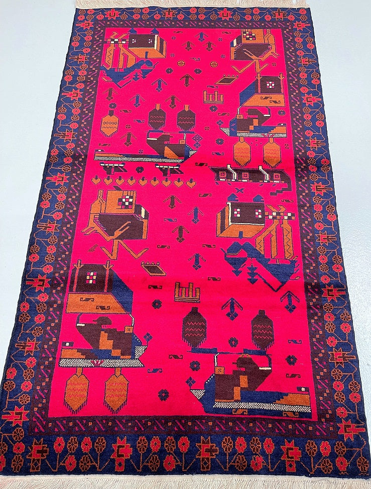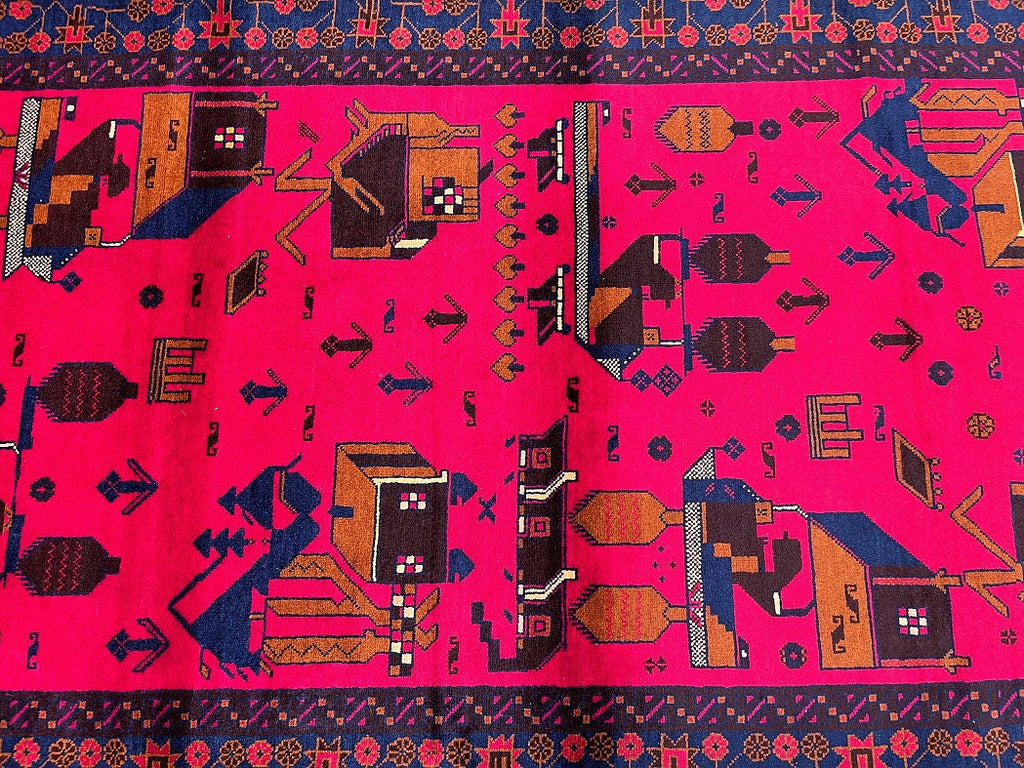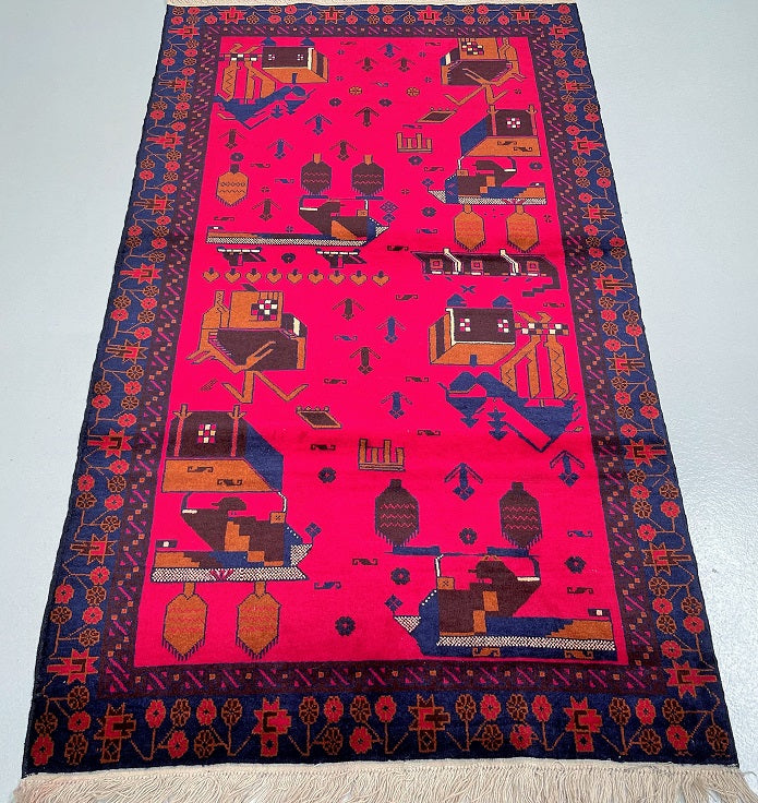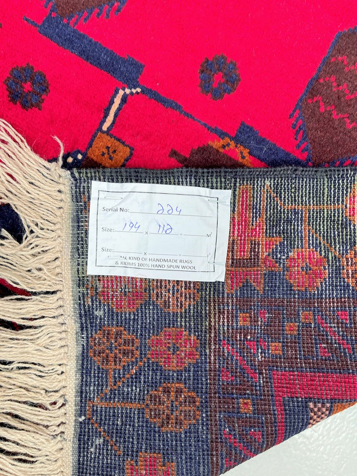 Handmade Afghan Balouchi rug, a versatile piece that can be used as a rug or a short hall runner. This rug showcases a pure hand-spun wool on wool construction, ensuring both quality and authenticity. The vibrant colors of red, indigo blue, mustard, brown, and beige are achieved through traditional dyeing methods. Adorned with a captivating tribal scenery design, this rug is a true testament to Afghan craftsmanship. It's worth noting that a skilled weaver, belonging to the nomadic Balouchi community, dedicated approximately 3-4 months to complete this masterpiece. Hand-woven in Afghanistan, this rug measures 194 x 112 cm and holds a gallery replacement valuation of $1790.