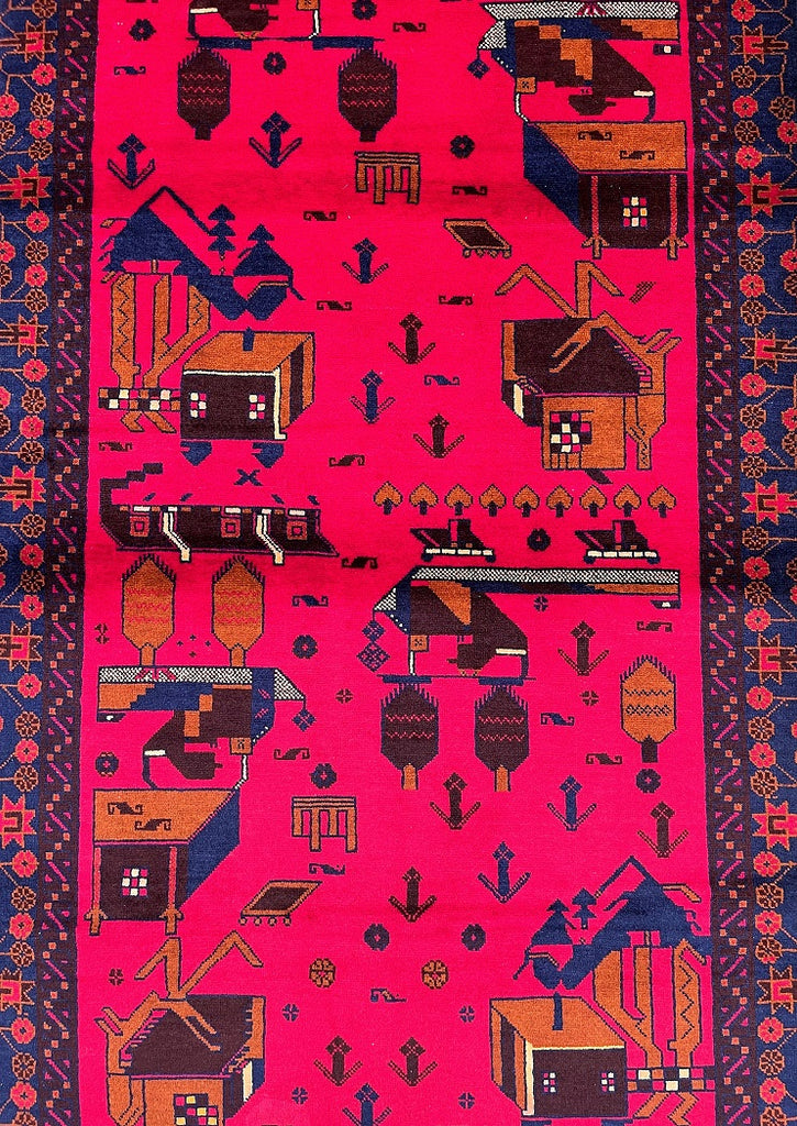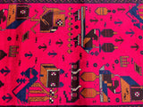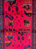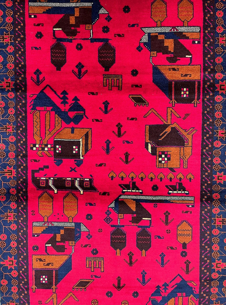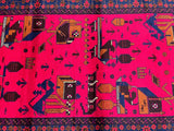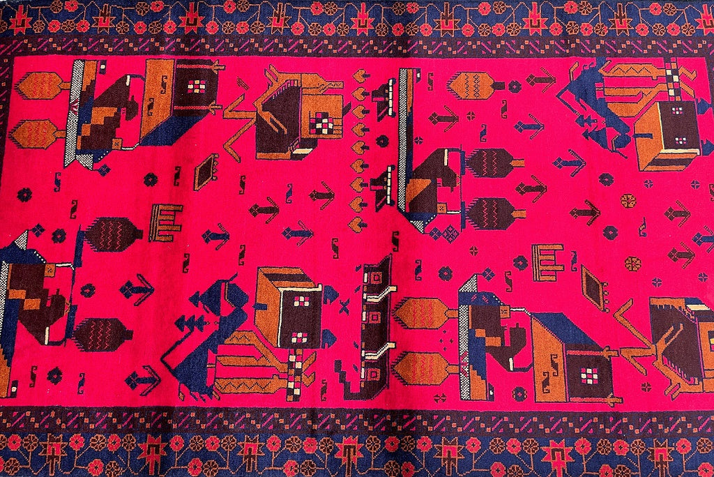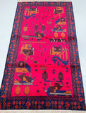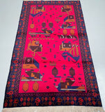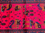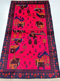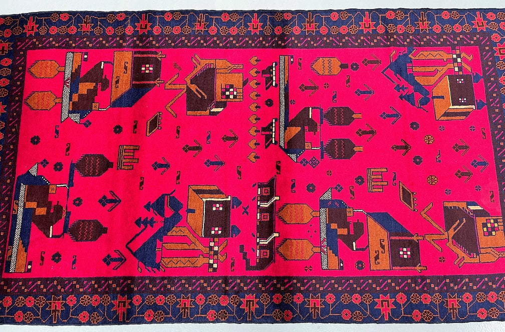 Handmade Afghan Balouchi rug, a versatile piece that can be used as a rug or a short hall runner. This rug showcases a pure hand-spun wool on wool construction, ensuring both quality and authenticity. The vibrant colors of red, indigo blue, mustard, brown, and beige are achieved through traditional dyeing methods. Adorned with a captivating tribal scenery design, this rug is a true testament to Afghan craftsmanship. It's worth noting that a skilled weaver, belonging to the nomadic Balouchi community, dedicated approximately 3-4 months to complete this masterpiece. Hand-woven in Afghanistan, this rug measures 194 x 112 cm and holds a gallery replacement valuation of $1790.