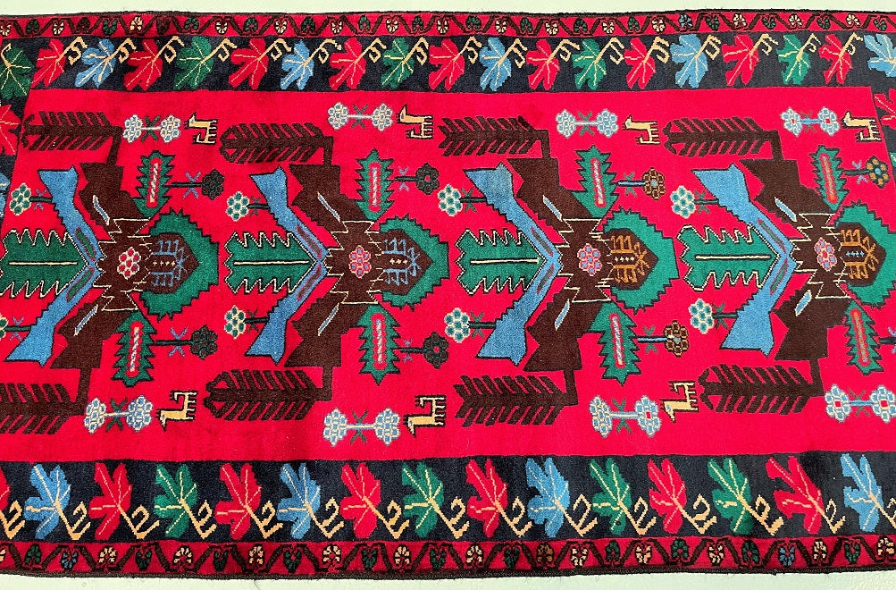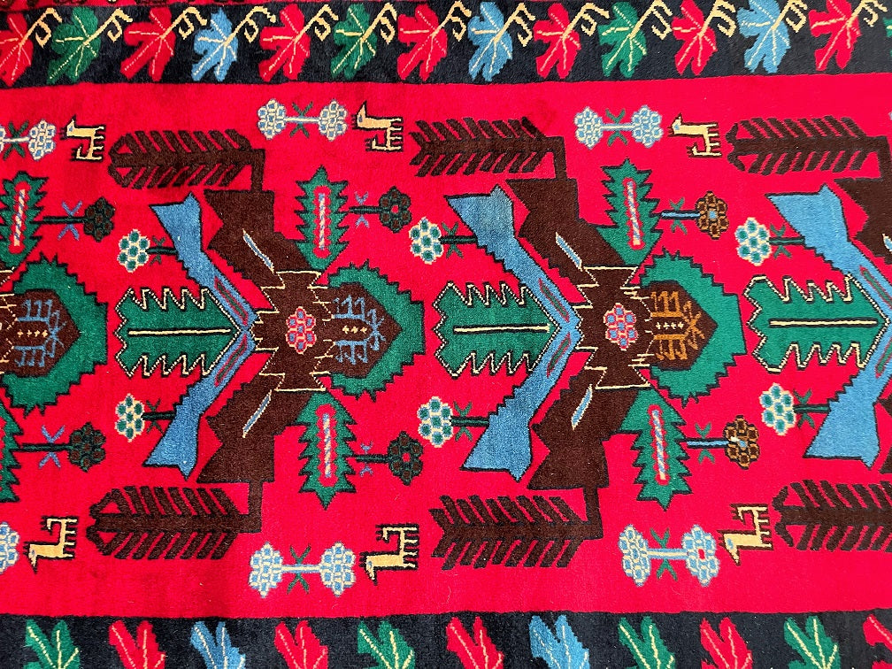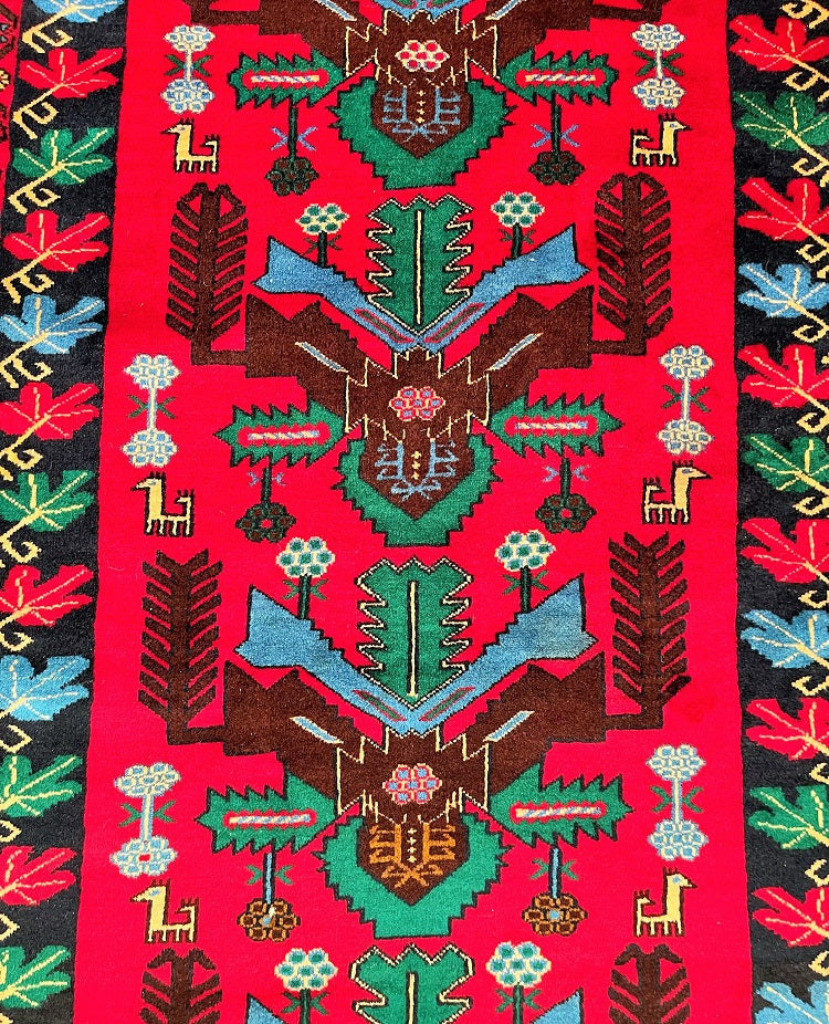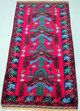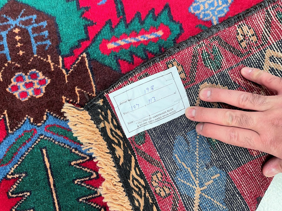 This carpet features pure hand-spun wool on wool construction, ensuring its quality and durability. The vibrant colors of red, brown, beige, green, black, and blue are achieved through traditional dyeing methods. The design consists of vase of flowers, adding an artistic touch to the piece. It is worth noting that it would have taken a skilled weaver approximately 3-4 months to complete this piece. Hand-woven in Afghanistan by a nomadic Balouchi weaver, this carpet reflects the rich cultural heritage of the region. With a size of 197 x 113 cm, it is a versatile piece suitable for various spaces. The gallery replacement valuation for this carpet is estimated at $1,790.