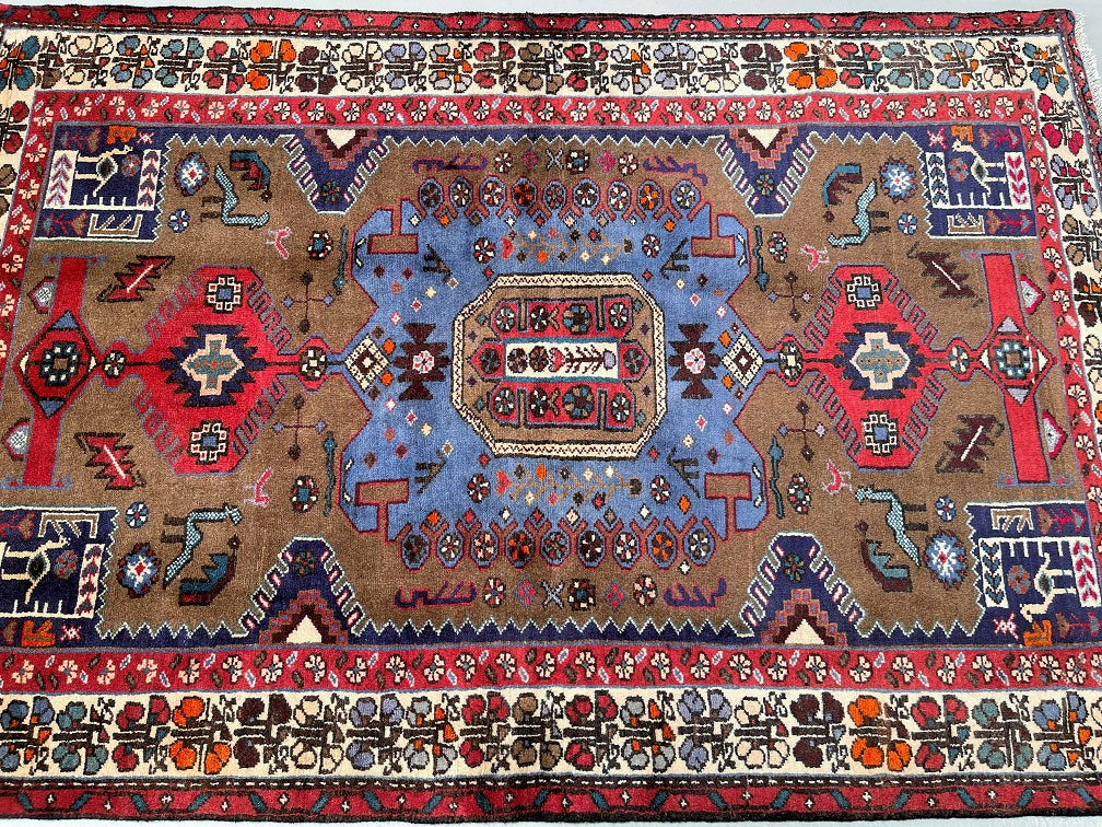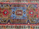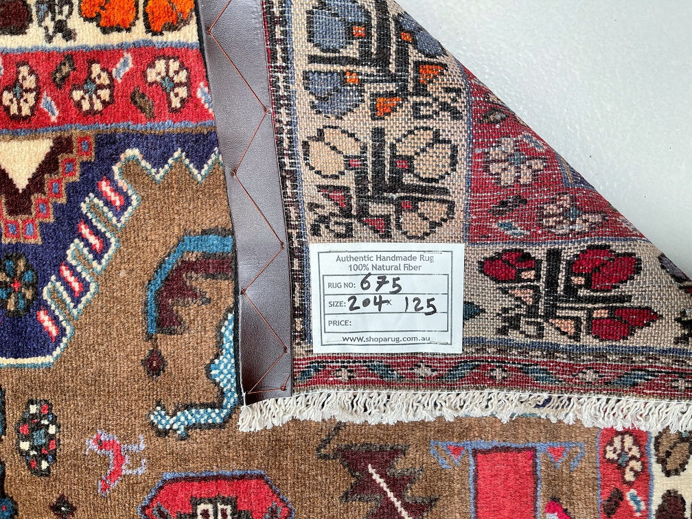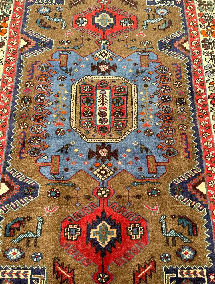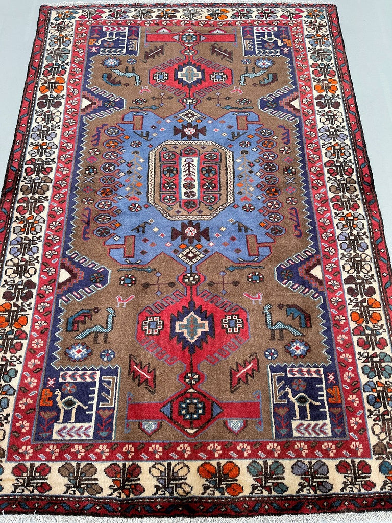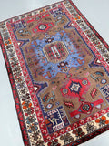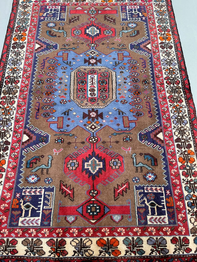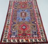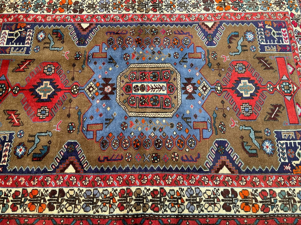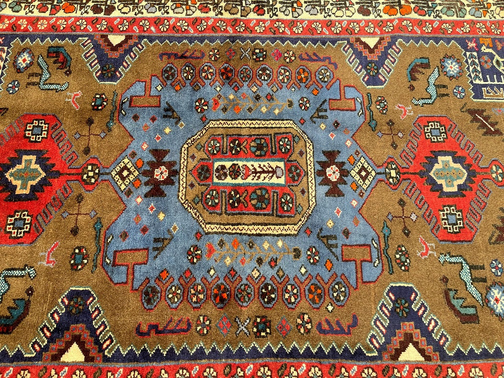 Decorative Nomadic Hand Knotted Persian Khamseh Rug. Above All It Has A Pure Hand Spun Wool Pile On Cotton Base. It Also Has A Caramel/Brown, Indigo Blue, Beige, Burnt Orange, Green, Light Blue And Terracotta Red Tone Dyed Using Traditional Methods.