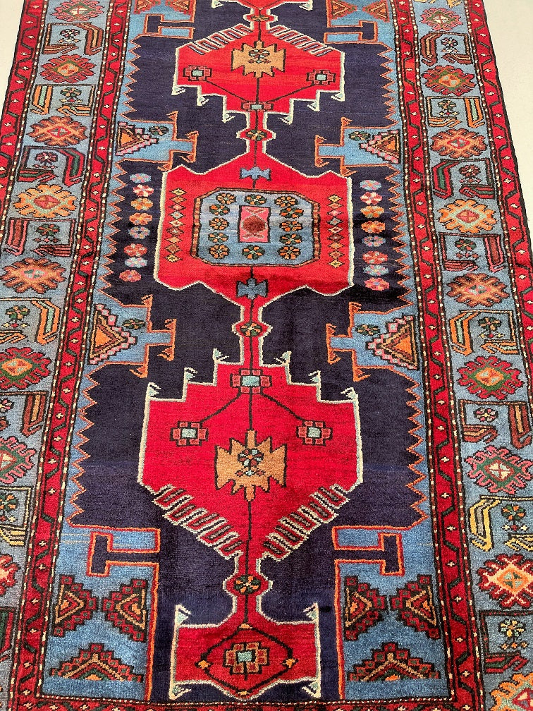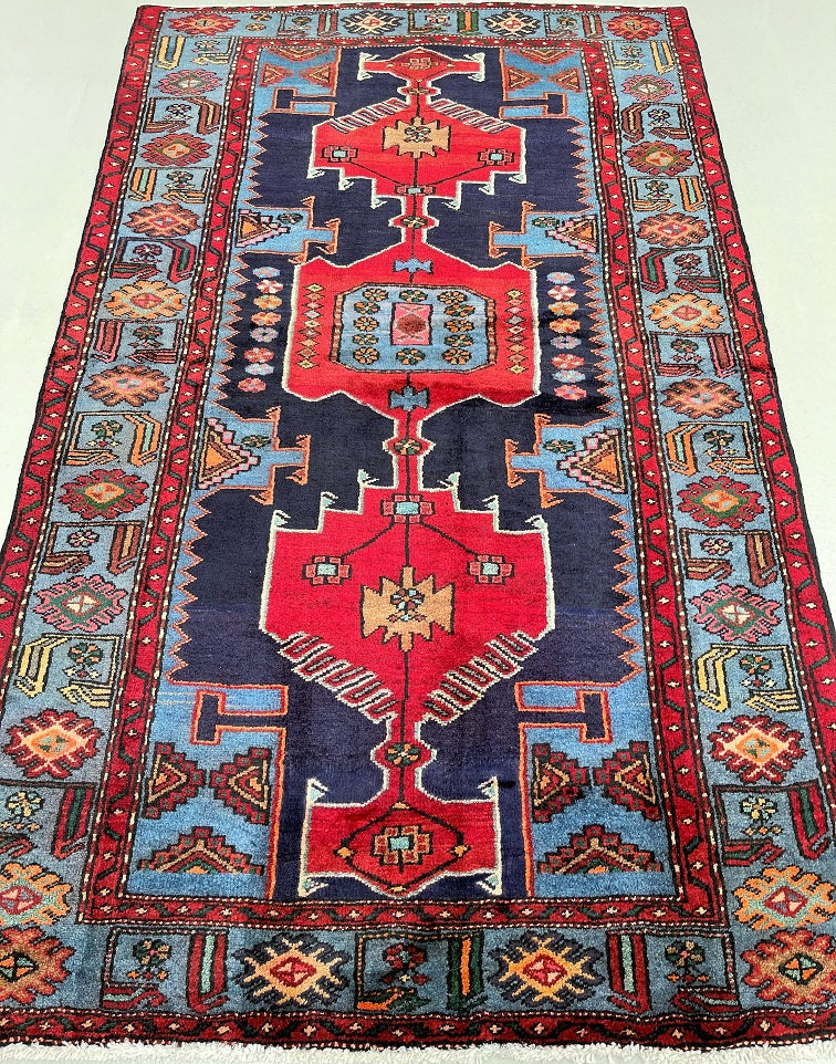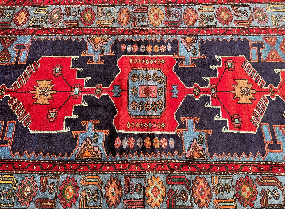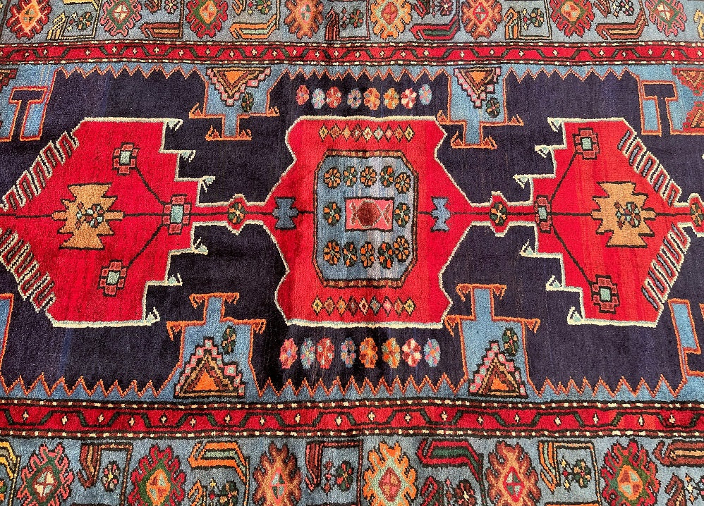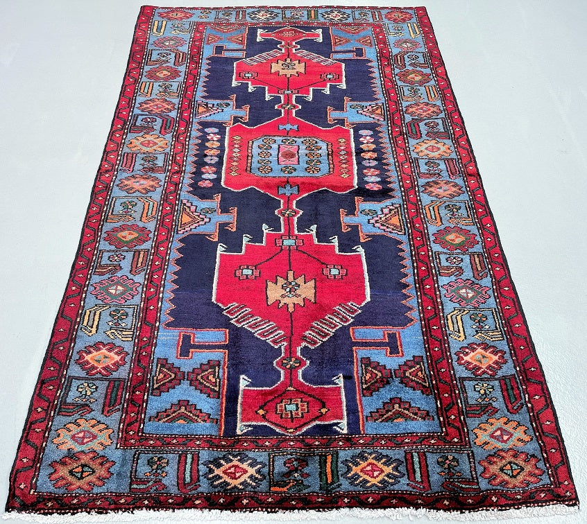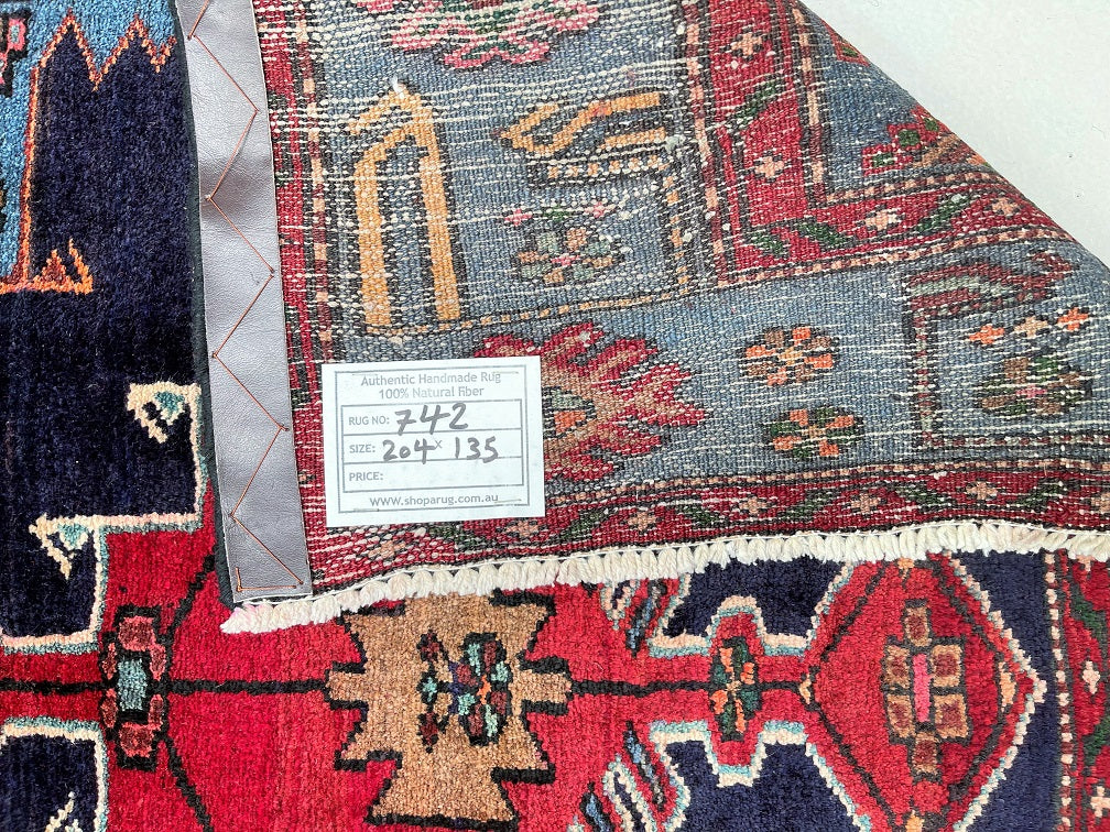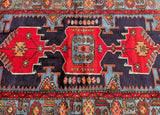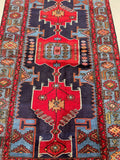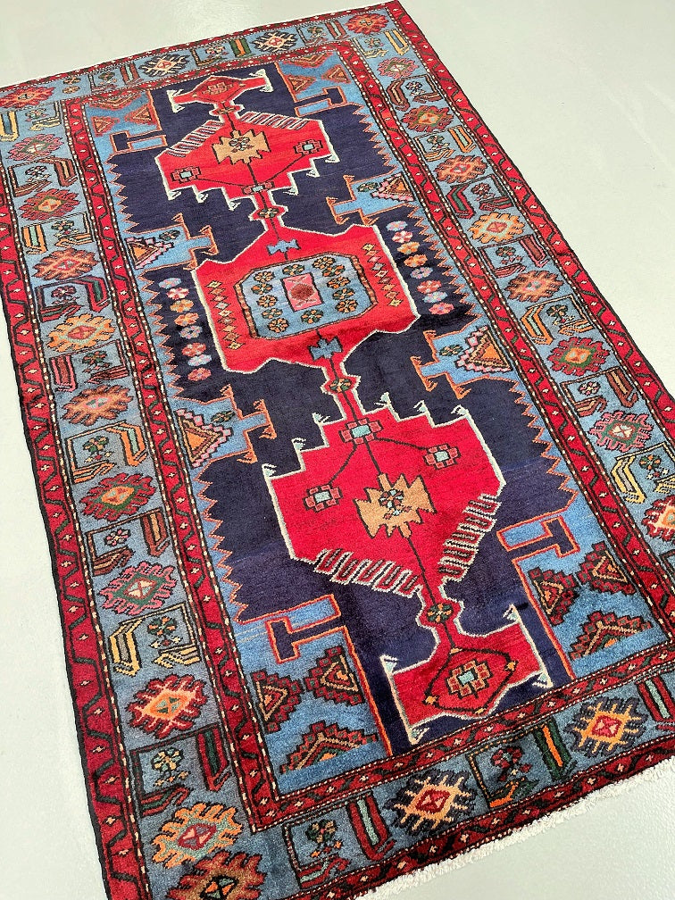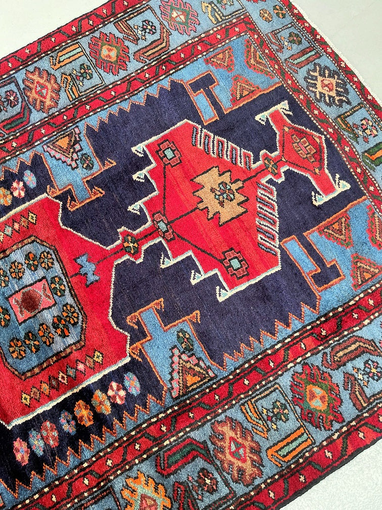 Coffee Table Size Authentic Handmade Village Persian Khamseh Rug. Above All It Is A Very Hard Wearing Rug. Pure Hand Spun Wool Pile On Cotton Base. It Also Has an Indigo Blue, Beige, Maroon Brown And Orange Tone Dyed Using Traditional Methods.