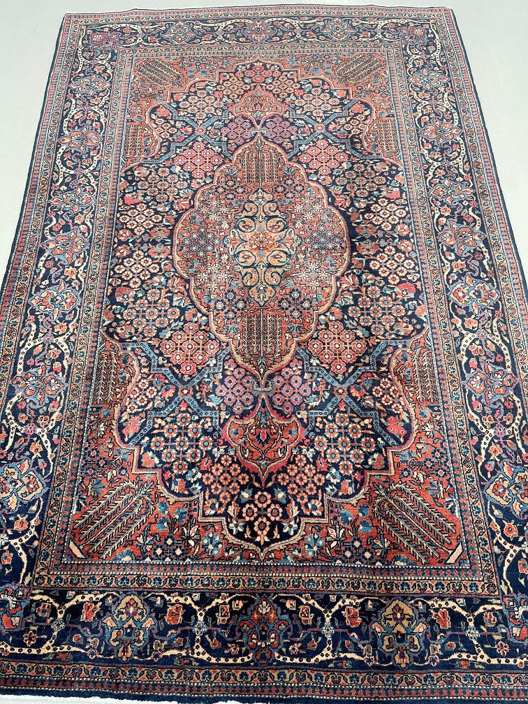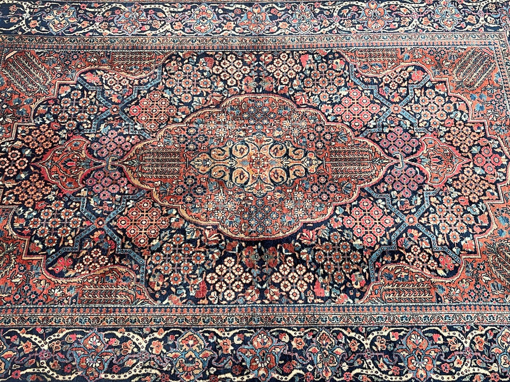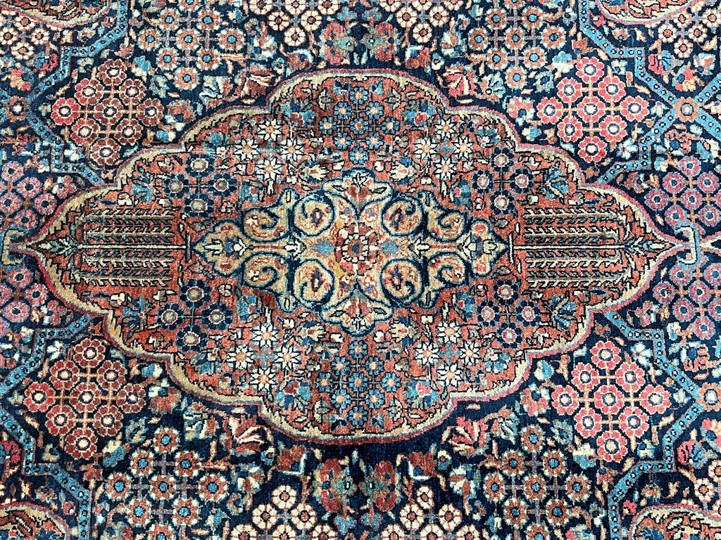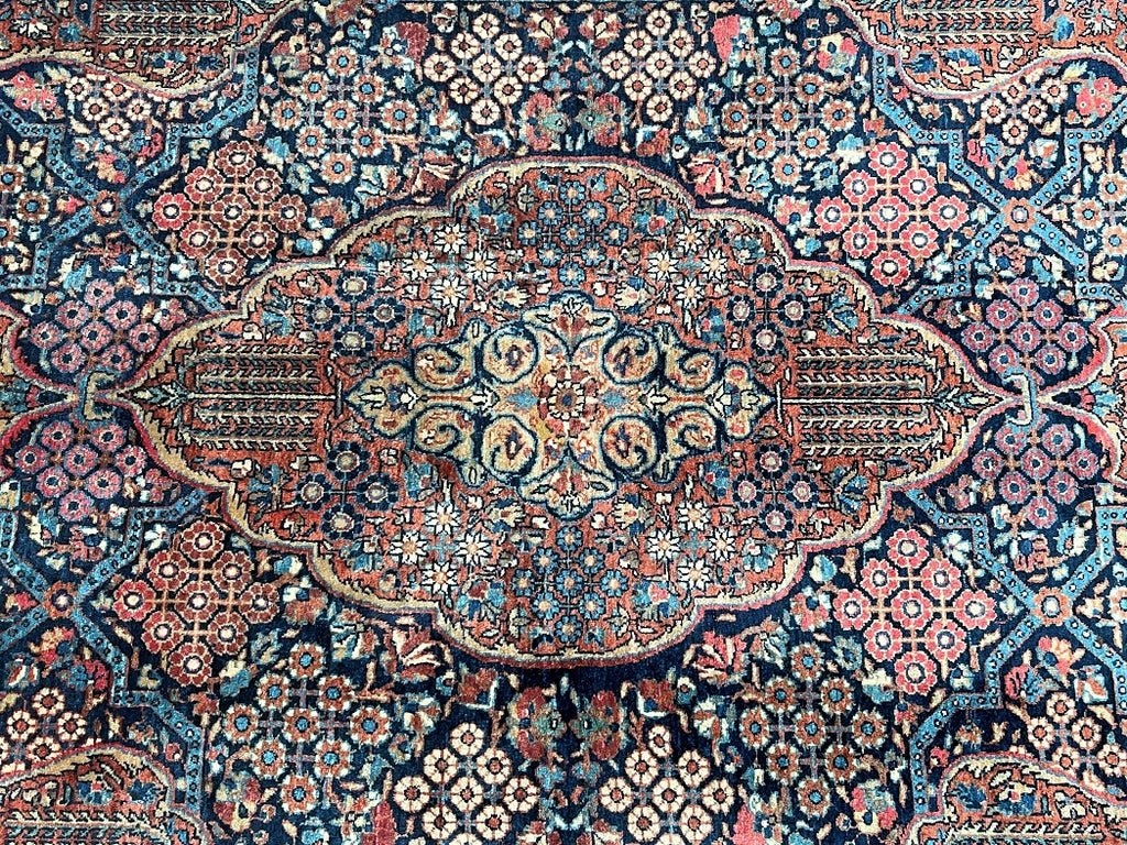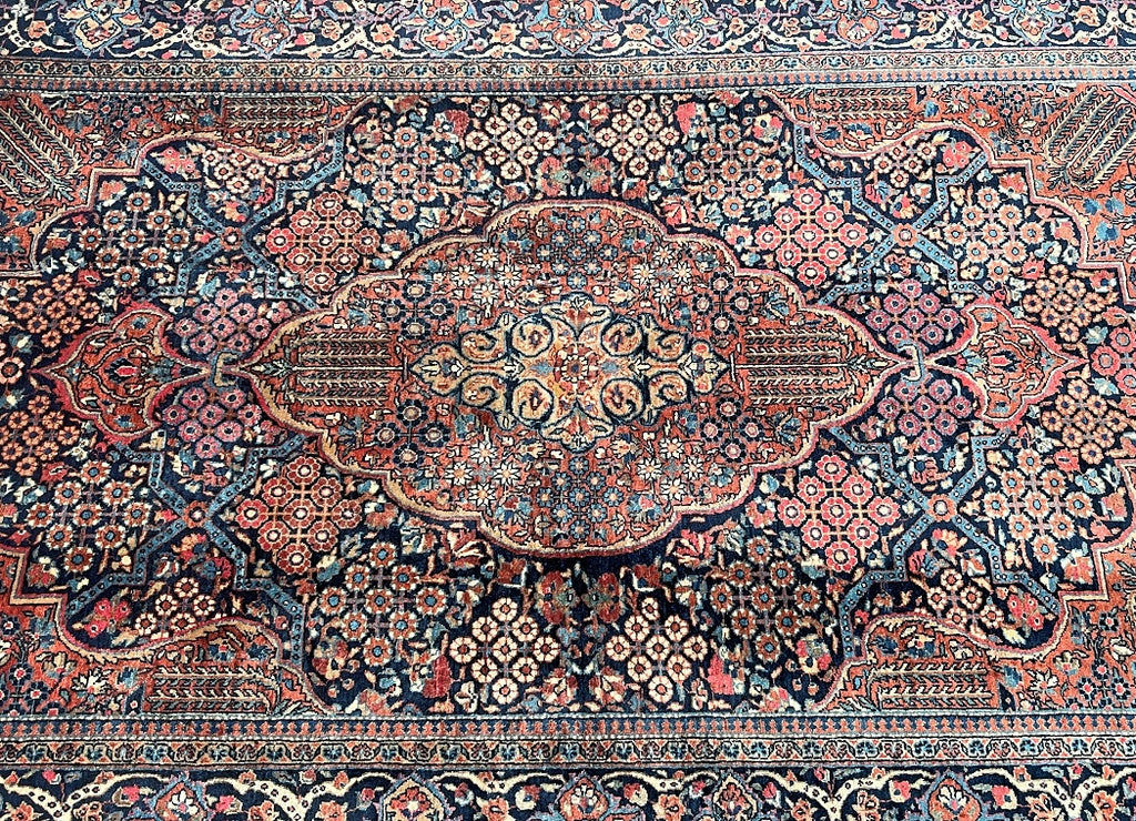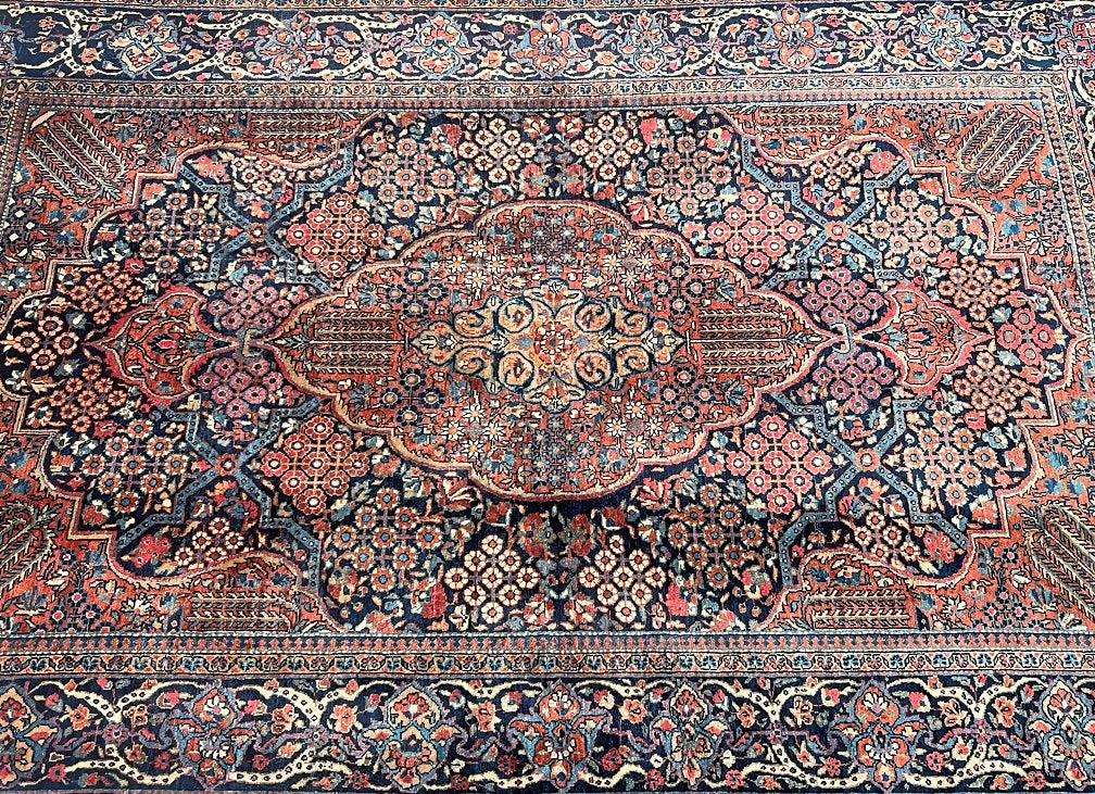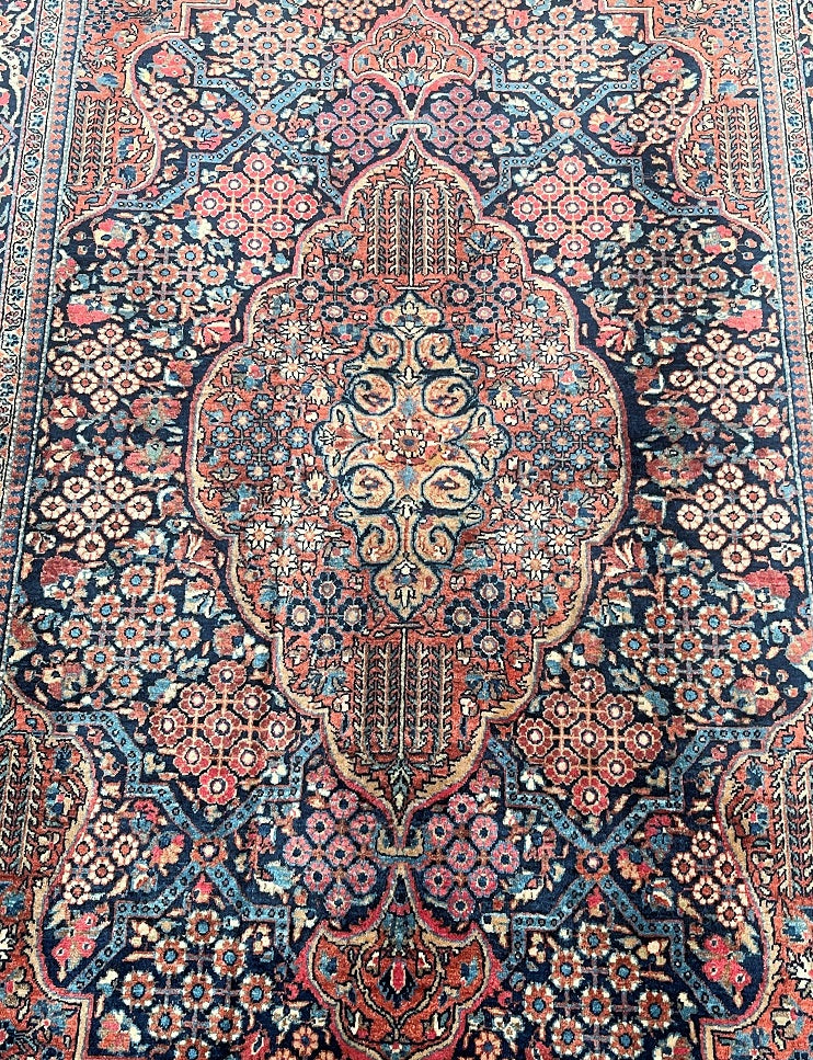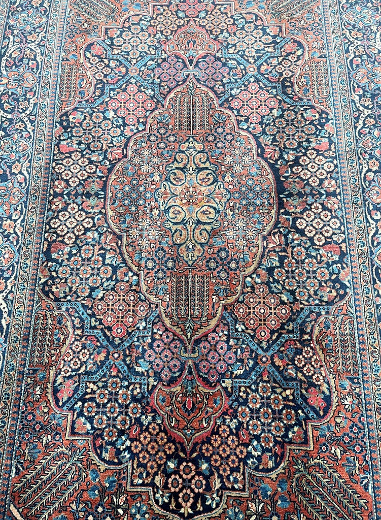Museum Quality Authentic Handmade Persian Kashan Rug Woven Circa 1930’s. Above All This Is A Very Collectable Antique Piece In Mint Condition Renown As Mohtasham Kashan. It Also Has A Pure Lamb’s Wool Pile On Cotton Base. It Also Has An Oxidised Red, Indigo Blue, Beige And Terracotta/Pink Tone Dyed Using Traditional Methods (Vegetable Dyes).