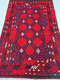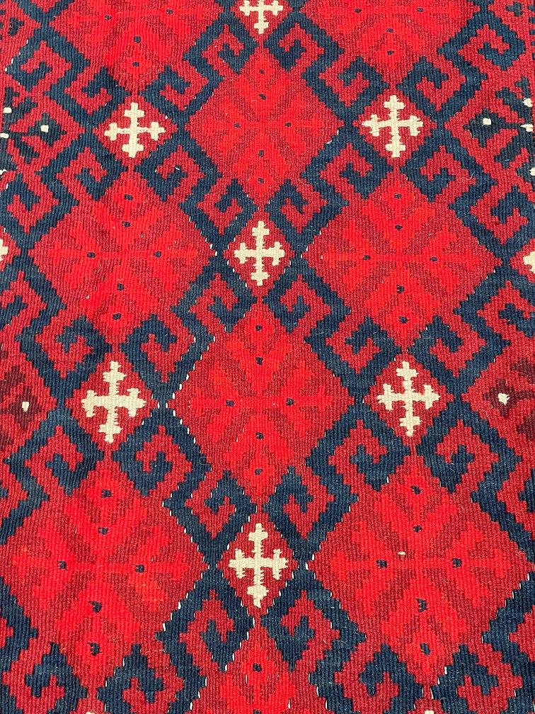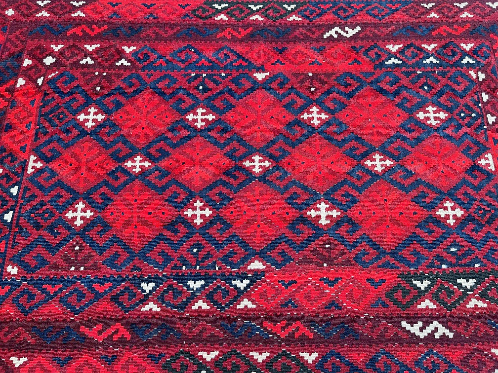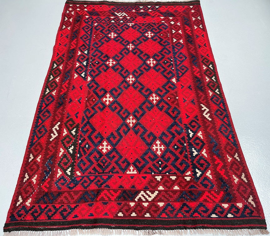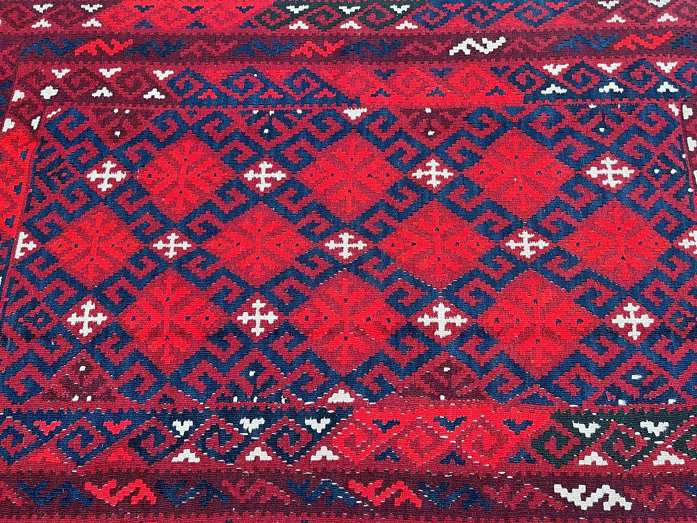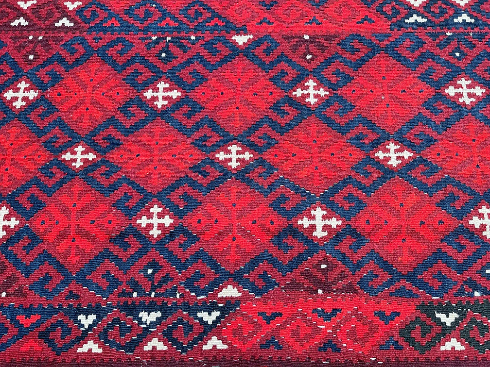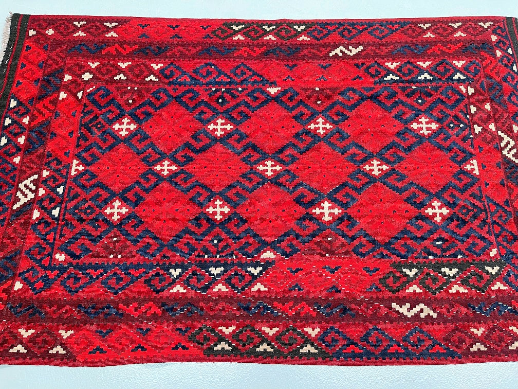 Coffee Table Size Nomadic Hand Woven Afghan Maymaneh Kilim Rug. Above All It Is A Very Versatile Size Which Also Could Be Used As a Runner. It Also Has A Pure Hand Spun Wool Pile On Wool Base. Deep Maroon/Red, Blue, Beige And Black Tone Dyed Using Traditional Methods.
