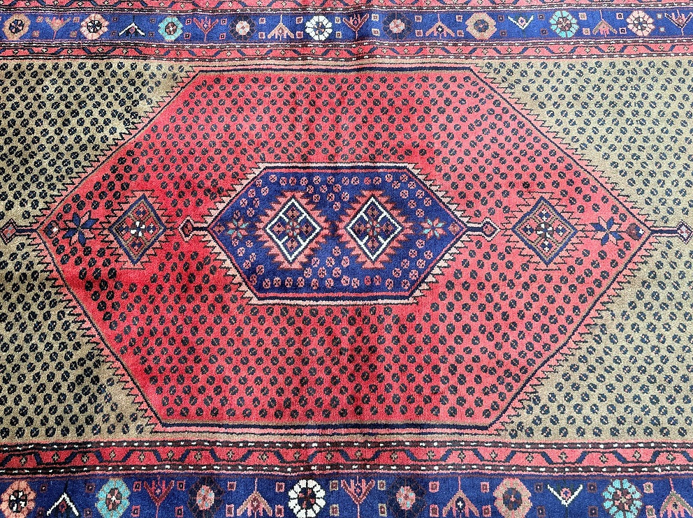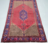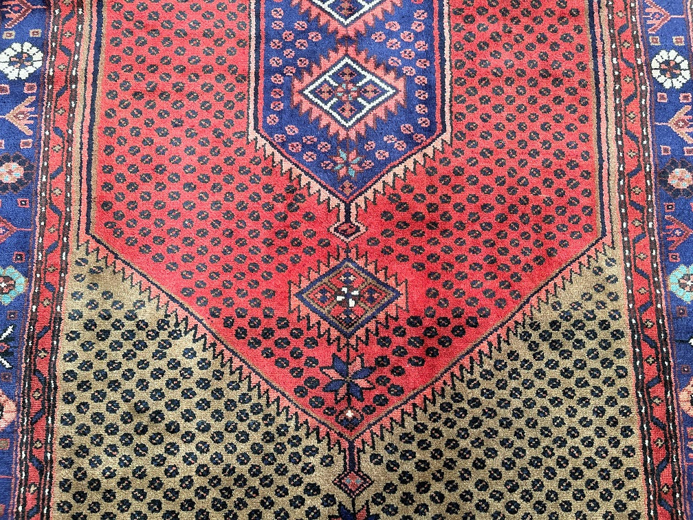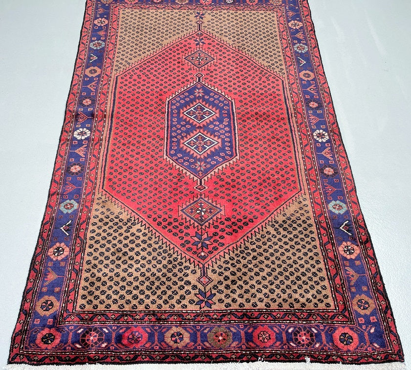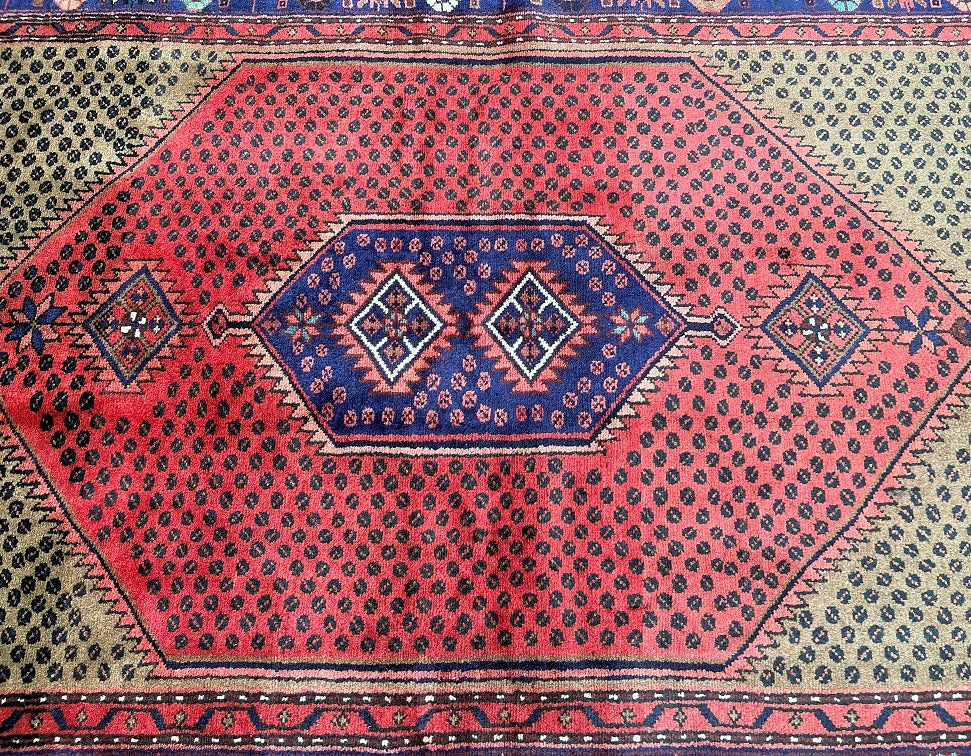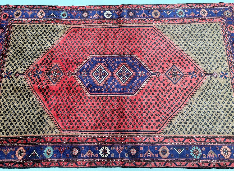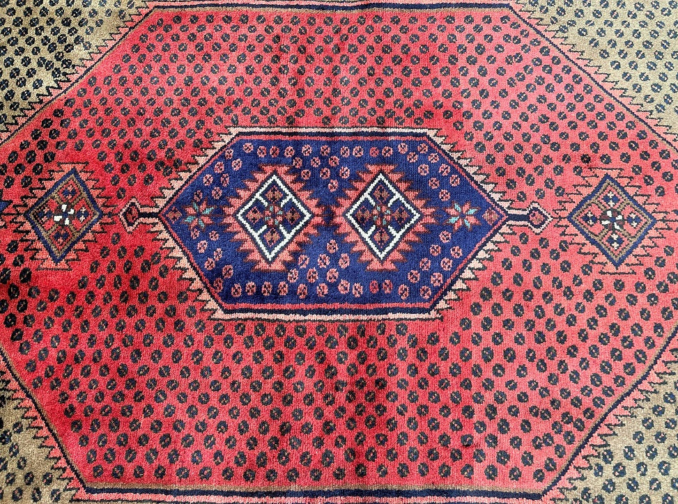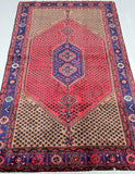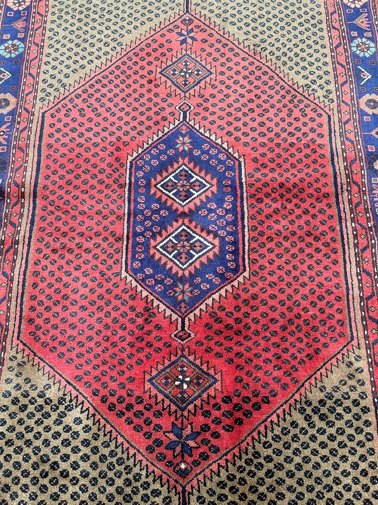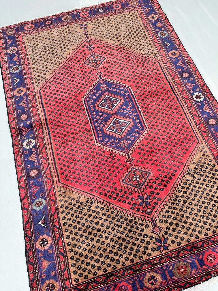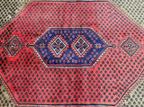 Coffee Table Size Authentic Handmade Persian Khamseh Rug. Above All It Has A Pure Hand Spun Wool Pile On Cotton Base. It Also Has A Pinkish Red/Terracotta, Blue, Beige, Caramel And Green Tone Dyed Using Traditional Methods.