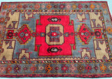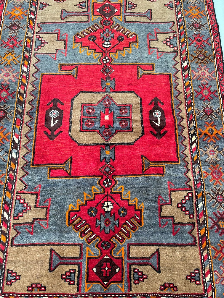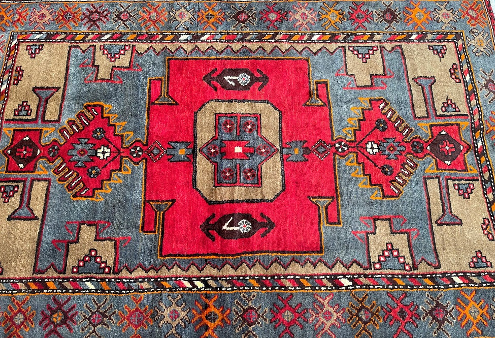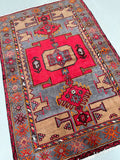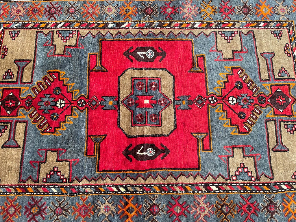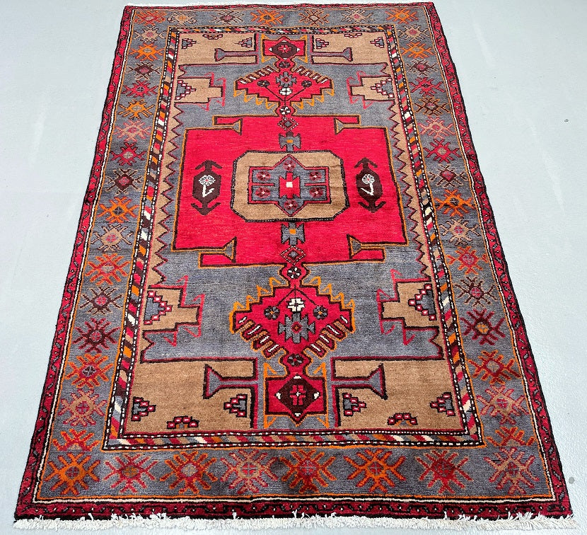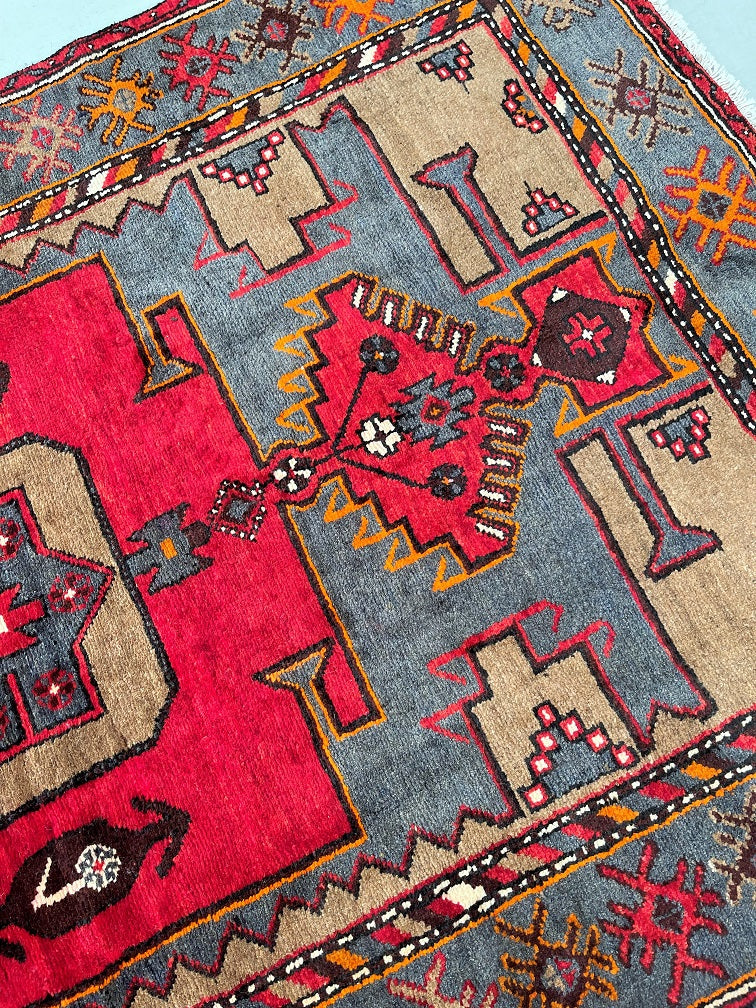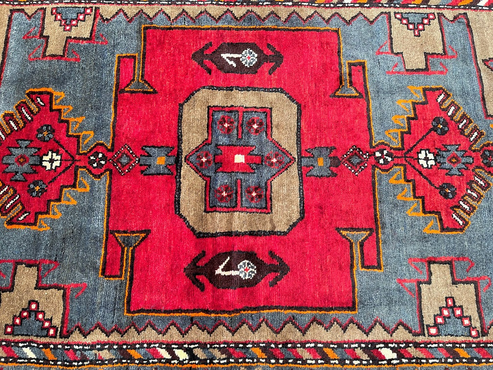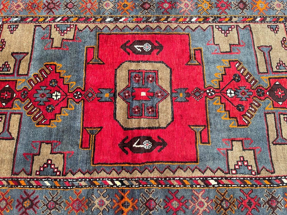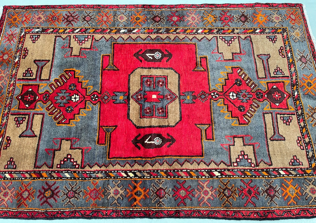 Coffee Table Size Authentic Handmade Persian Village Zanjan Rug. Above All It Is A Very Hard Wearing Rug. Pure Hand Spun Wool Pile On Cotton Base. It Also Has A Rare Grey Blue, Mustard, Orange, Brown And Red Tone Dyed Using Traditional Methods.