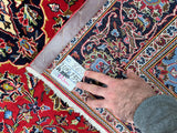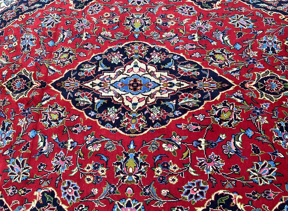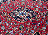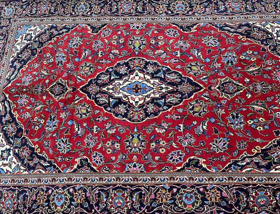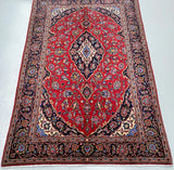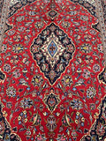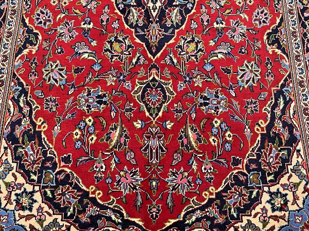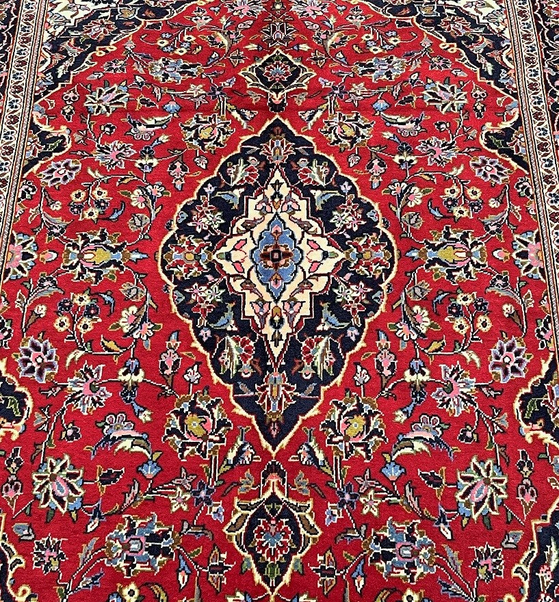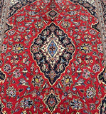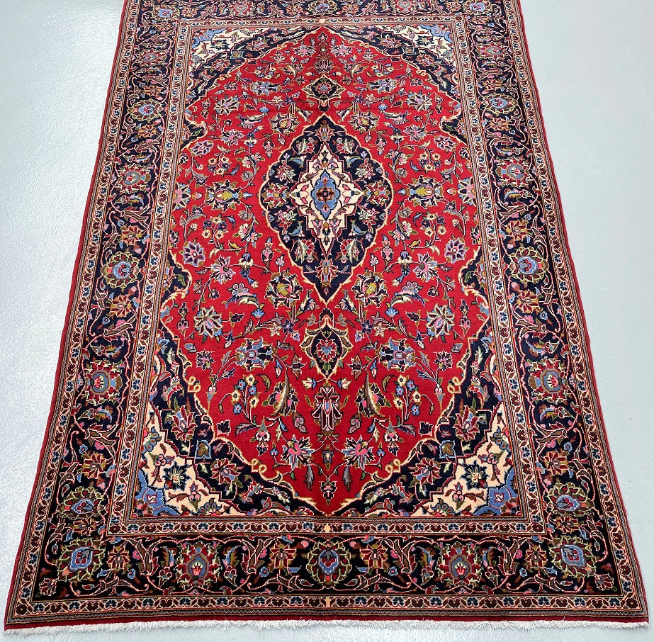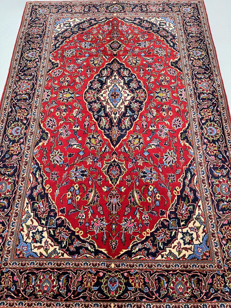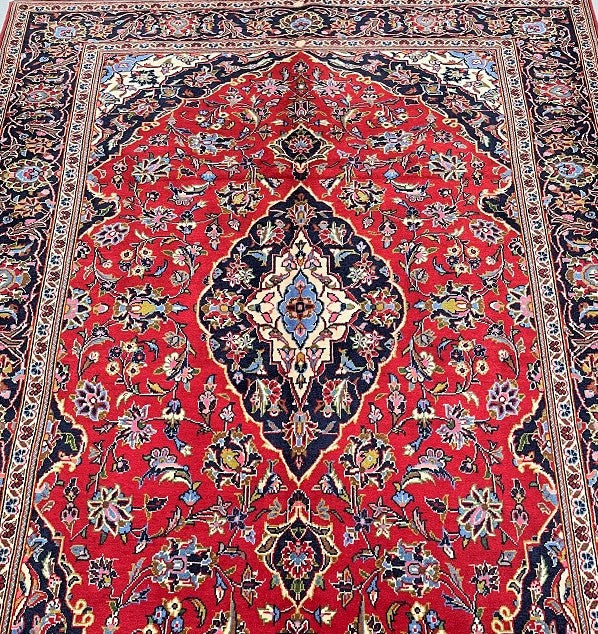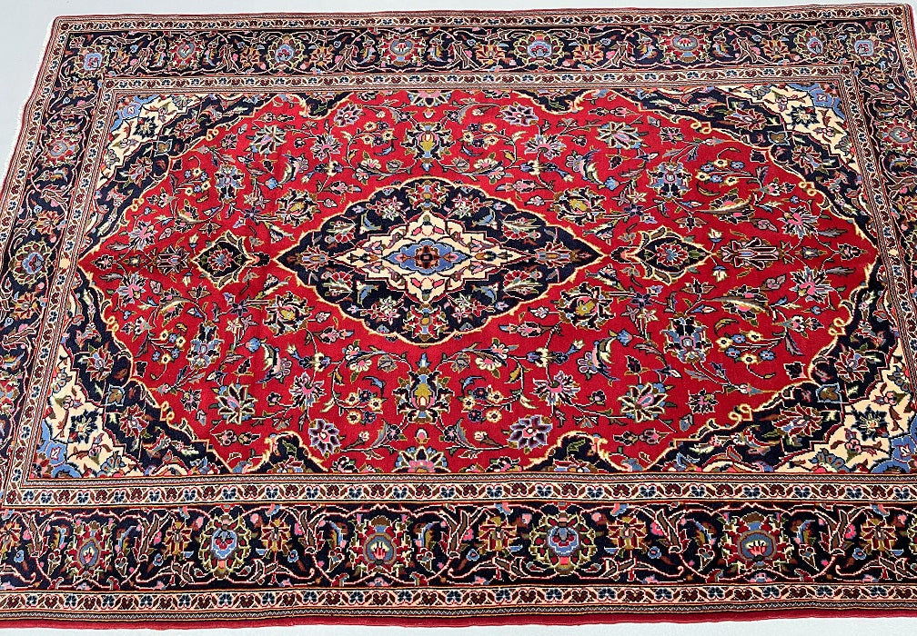 Rare Authentic Handmade Persian Kashan Rug. Above All This Is A Collectable Old Piece. Hand Woven Circa 1960’s. It Also Has A Pure Lamb’s Wool Pile On Cotton Base. It Also Has A Red And Indigo Blue Tone Dyed Using Traditional Methods.