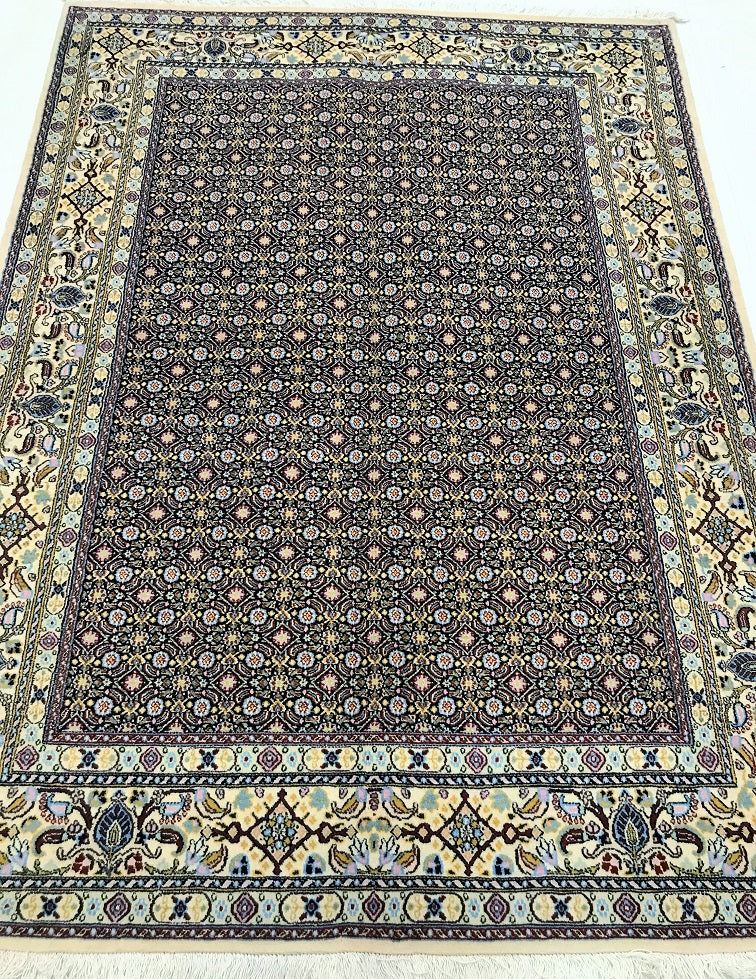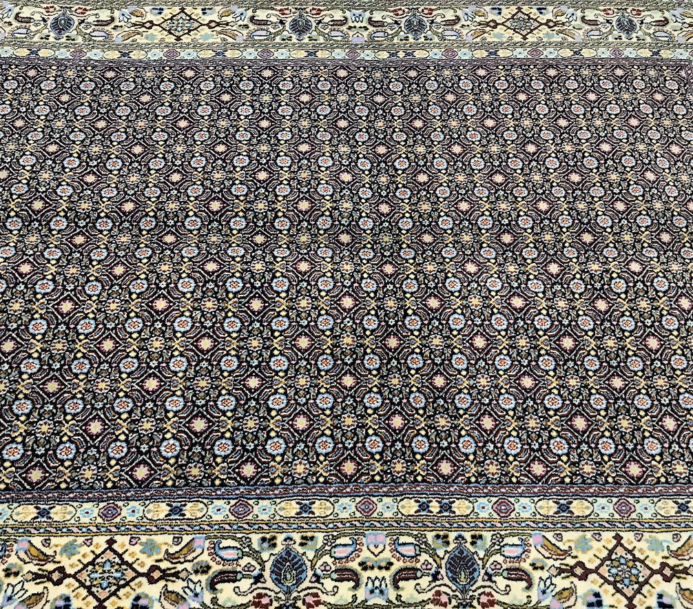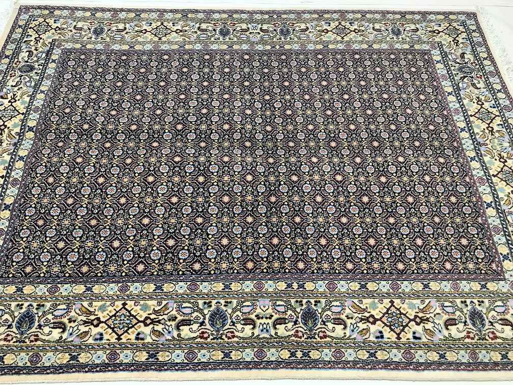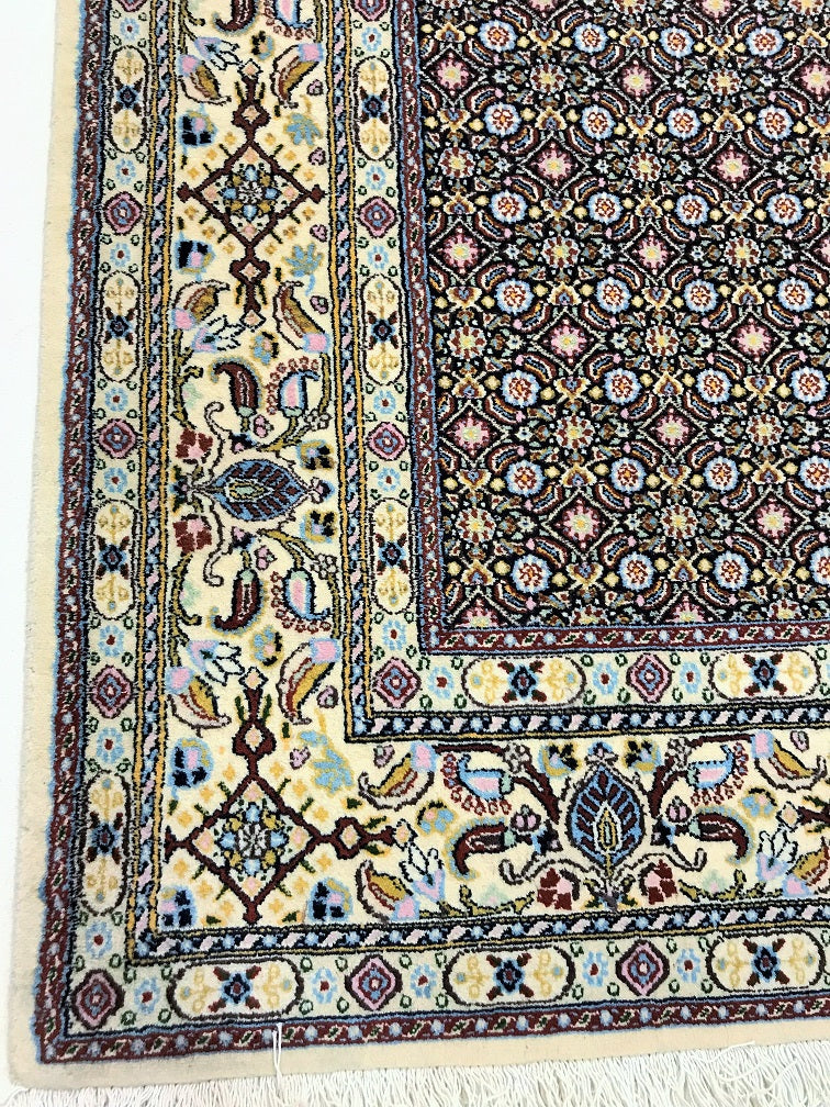 Fine Quality Authentic Handmade Persian Birjand Rug. Lamb’s Wool and Silk-Inlaid Pile on Cotton Base. It Also Has An Indigo Blue, Beige, Pink, Yellow And French Blue Tone Dyed Using Traditional Methods.