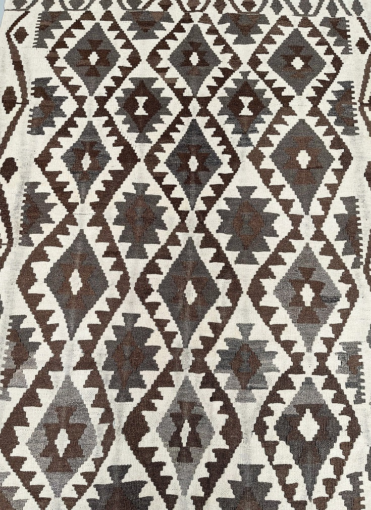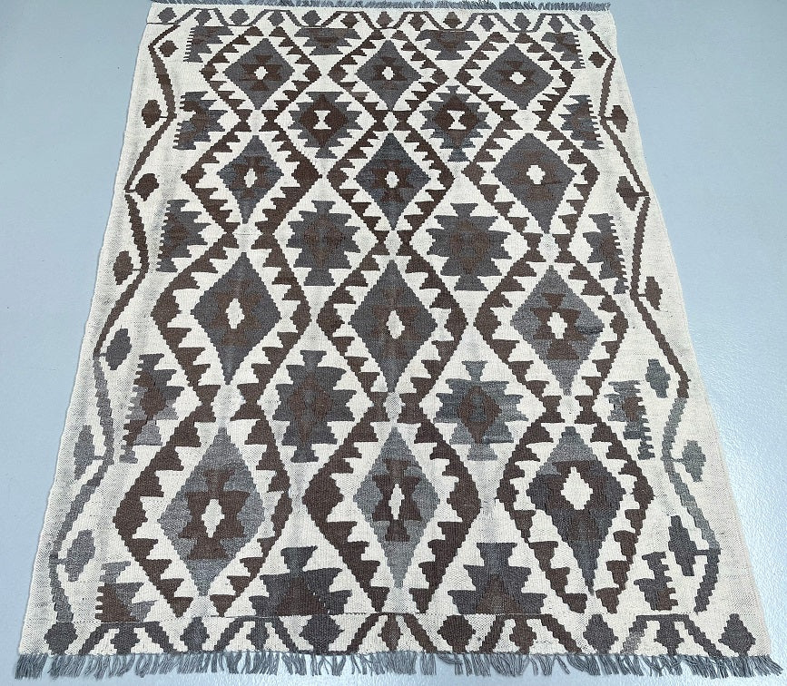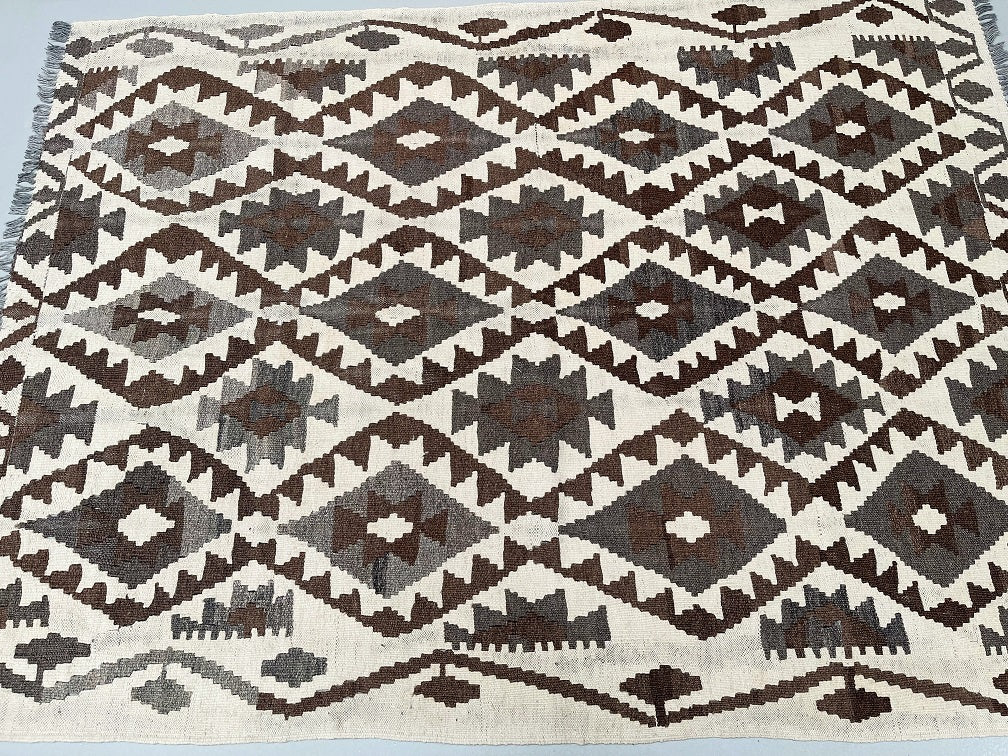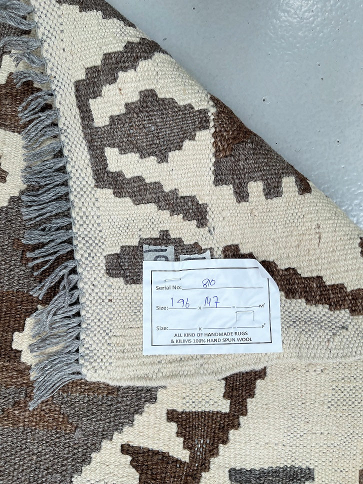 Coffee Table Size Nomadic Hand Woven Afghan Kyber Kilim Rug. Above All It Is A Very Versatile Size. It Also Has A Pure Hand Spun Wool Pile On Wool Base. Neutral Beige, Grey And Brown Tone Dyed Using Traditional Methods.