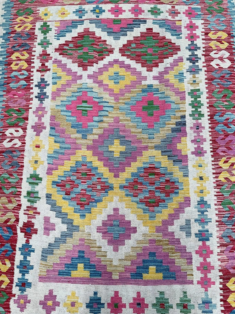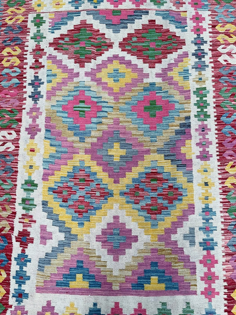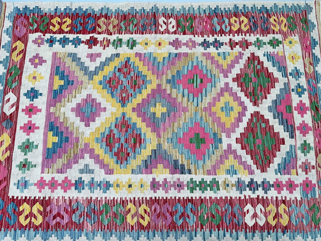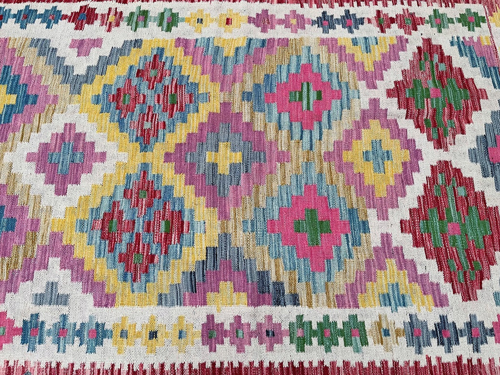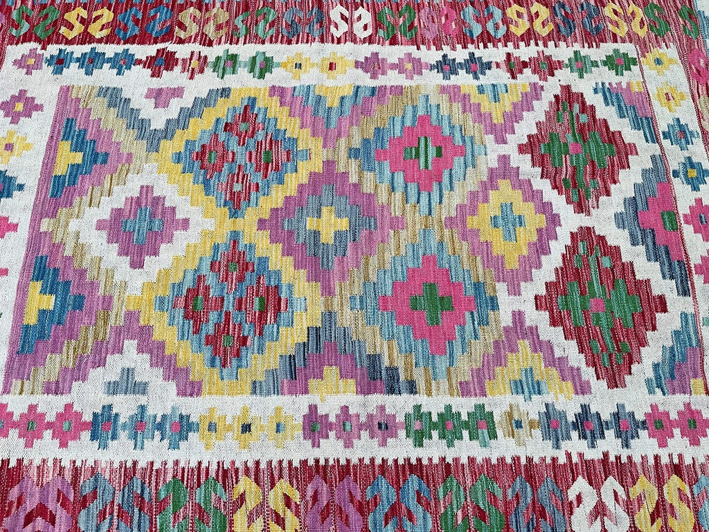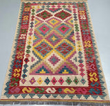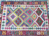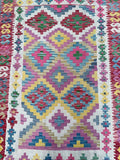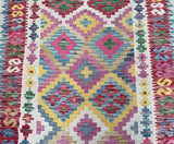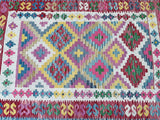 Decorative Hand Woven Vegetable Dye Boho Design Tribal Aryana Kilim Rug. Above All It Has A Pure Hand Spun Wool Pile On Wool Base. Vibrant Multi-Color Tone Dyed Using Traditional Methods.