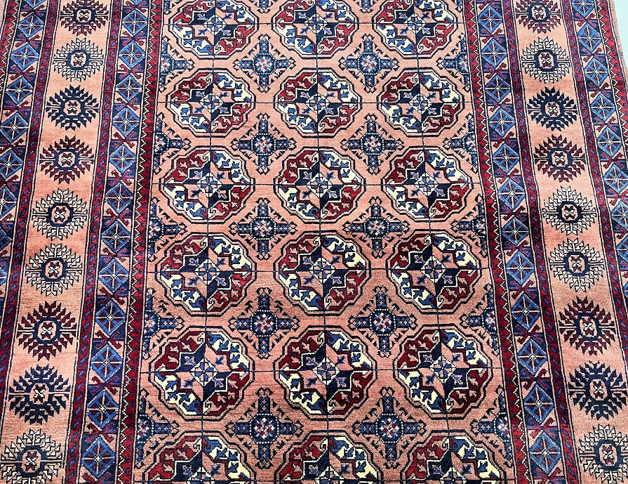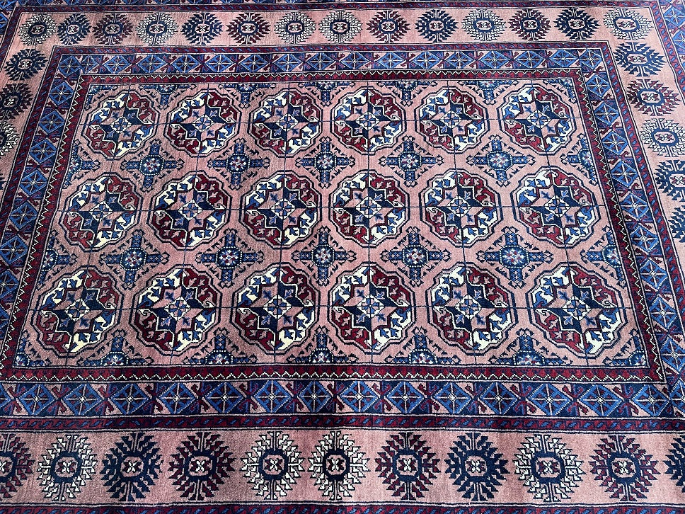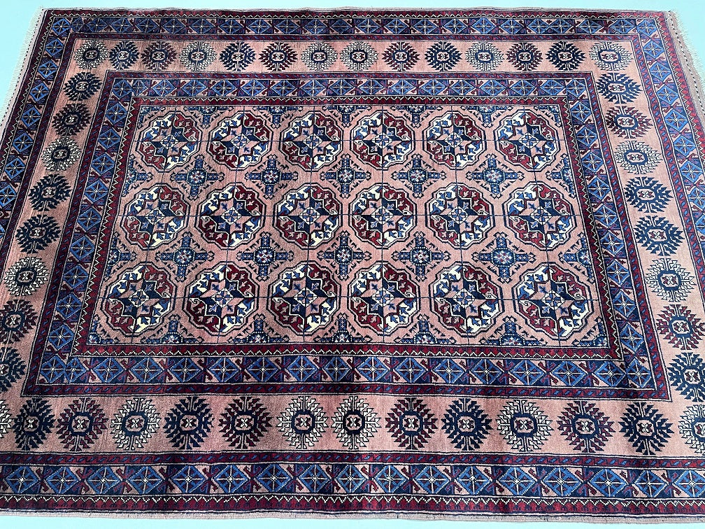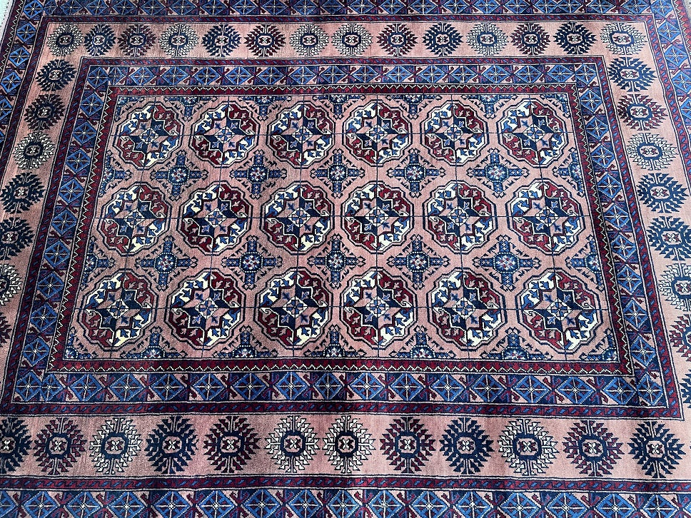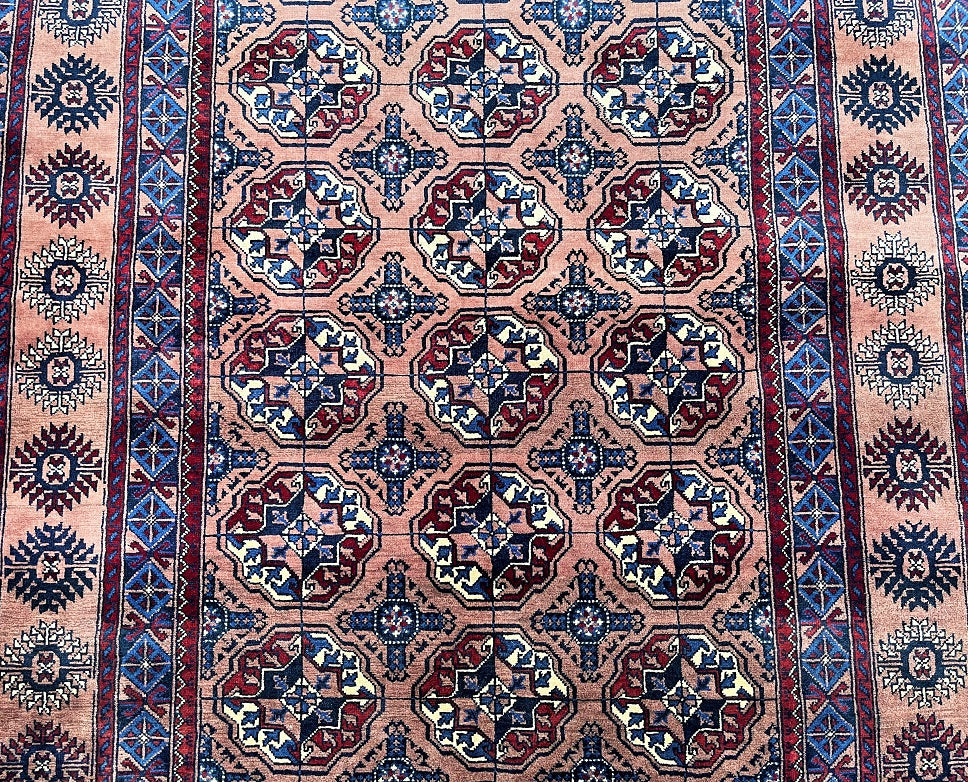 Fine Coffee Table Size Hand Knotted Bukhara Roshnai Rug. Above All It Is Pure Hand Spun Wool Pile On Cotton Base. It Also Has Caramel, Blues, Beige And Red Tone Dyed Using Traditional Methods.