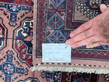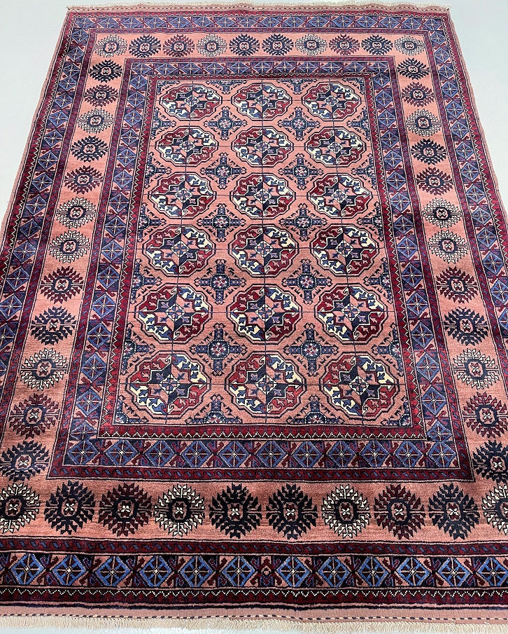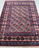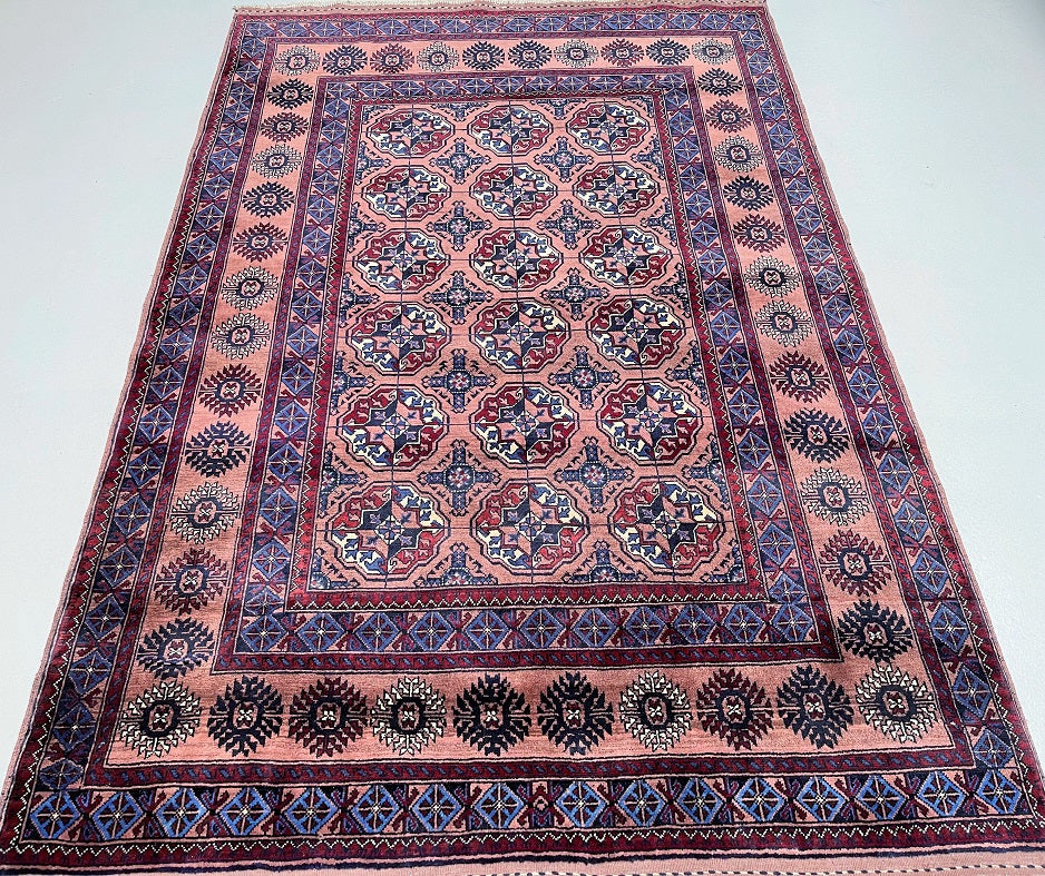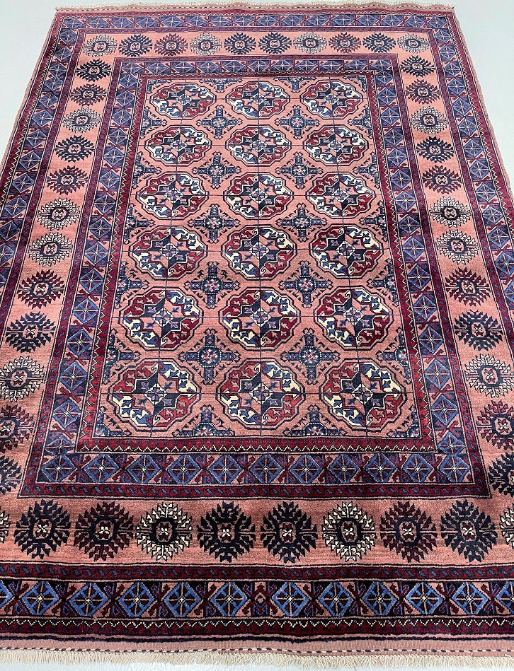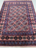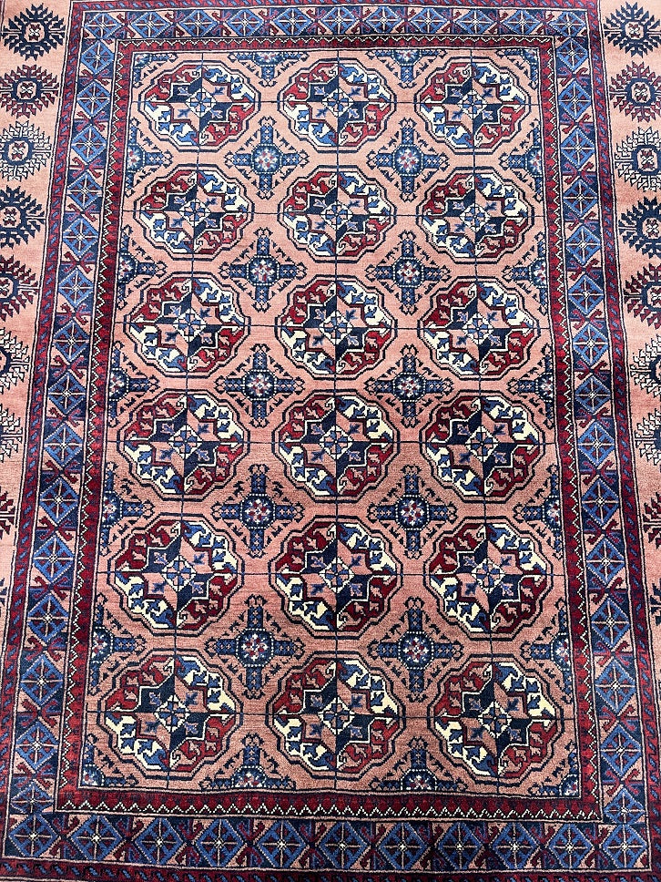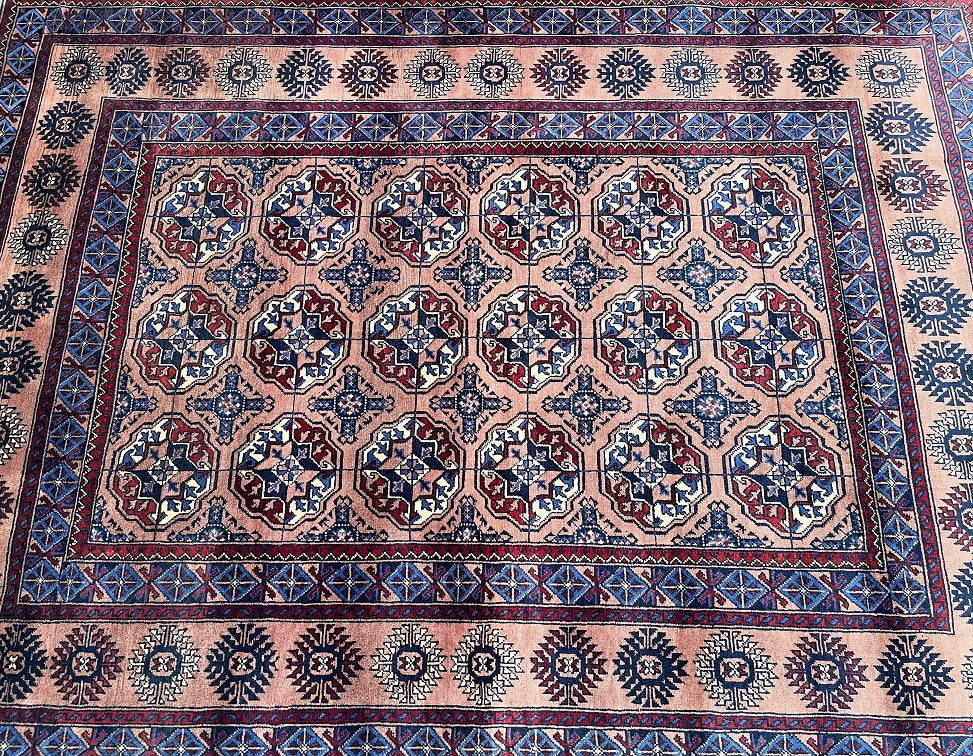 Fine Coffee Table Size Hand Knotted Bukhara Roshnai Rug. Above All It Is Pure Hand Spun Wool Pile On Cotton Base. It Also Has Caramel, Blues, Beige And Red Tone Dyed Using Traditional Methods.