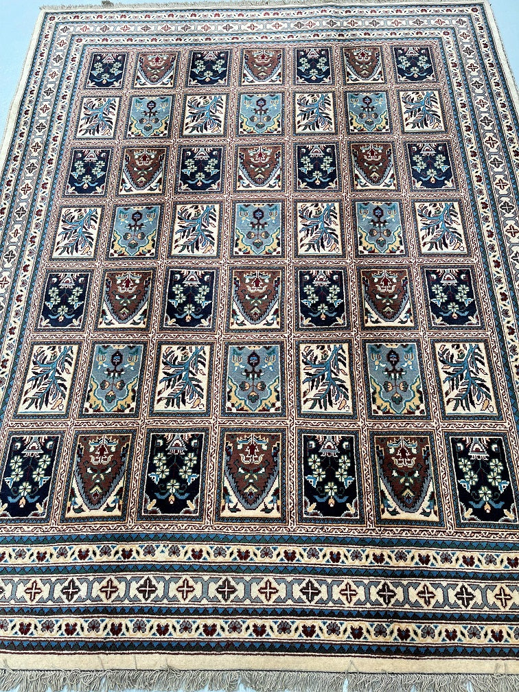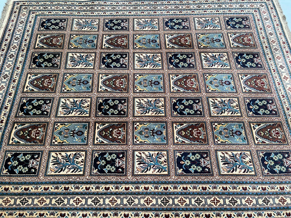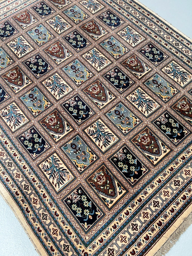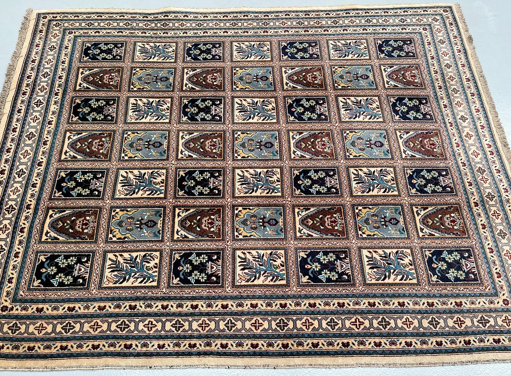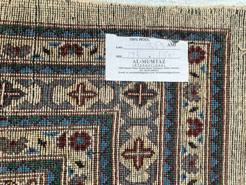 Fine Authentic Hand Knotted Afghan Roshnai Rug. Above All It Is Pure Hand Spun Wool Pile On Cotton Base. Stunning Beige, Maroon, Caramel, Blue And Gold Tone Dyed Using Traditional Methods.