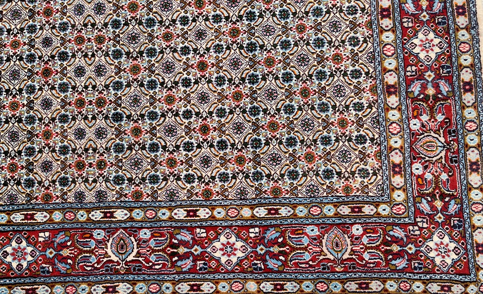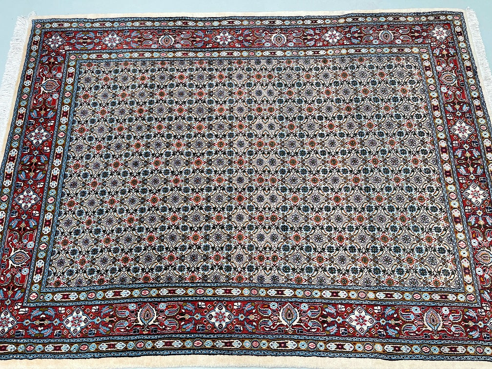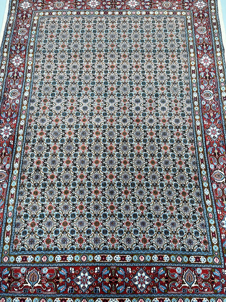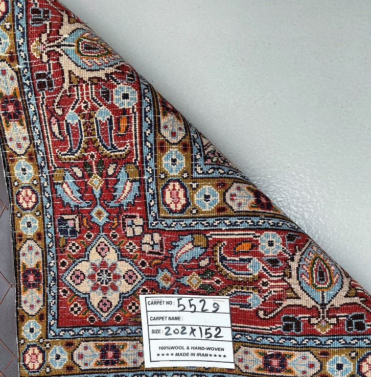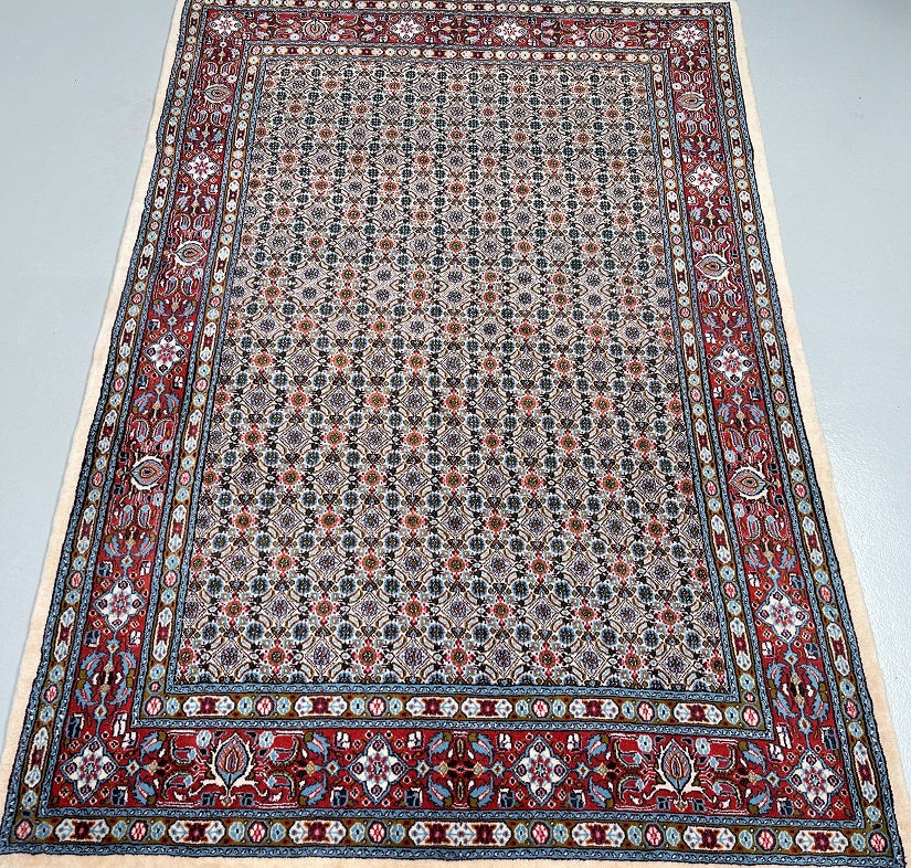 Fine Authentic Handmade Persian Birjand Mood Rug. This gorgeous rug is crafted with a blend of lamb's wool and a touch of silk, creating a luxurious and soft pile on a cotton base. The beautiful tones of beige, blues, green, pink, and orange are achieved through traditional dyeing methods, adding depth and richness to the rug's colors. Adorned with an intricate allover Herati design, also known as the Mahi pattern, this rug showcases the weaver's skill and attention to detail. Hand-woven in the city of Birjand, located in East Persia, this rug measures 202 x 152 cm and holds a gallery replacement value of $4799. It is worth noting that the weaver dedicated approximately 6 months to complete this rug.