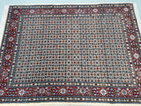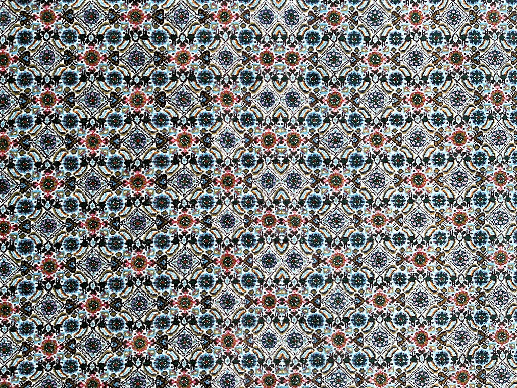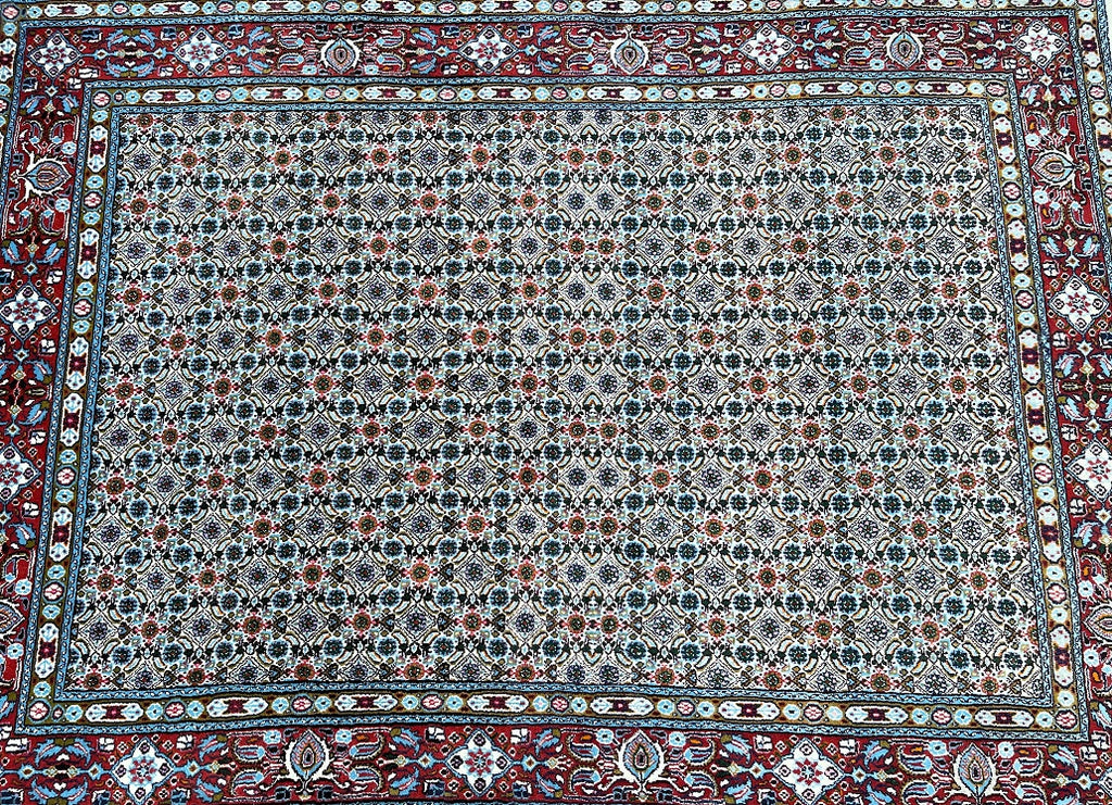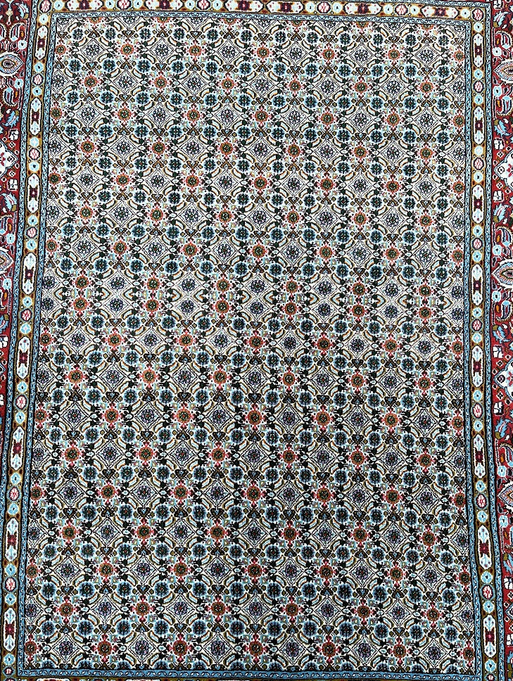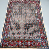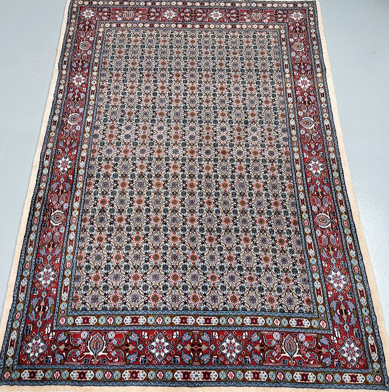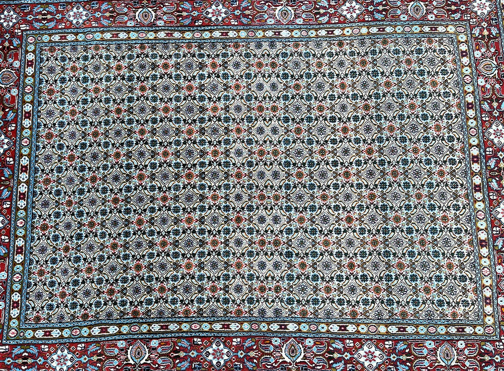 Fine Authentic Handmade Persian Birjand Mood Rug. This gorgeous rug is crafted with a blend of lamb's wool and a touch of silk, creating a luxurious and soft pile on a cotton base. The beautiful tones of beige, blues, green, pink, and orange are achieved through traditional dyeing methods, adding depth and richness to the rug's colors. Adorned with an intricate allover Herati design, also known as the Mahi pattern, this rug showcases the weaver's skill and attention to detail. Hand-woven in the city of Birjand, located in East Persia, this rug measures 202 x 152 cm and holds a gallery replacement value of $4799. It is worth noting that the weaver dedicated approximately 6 months to complete this rug.