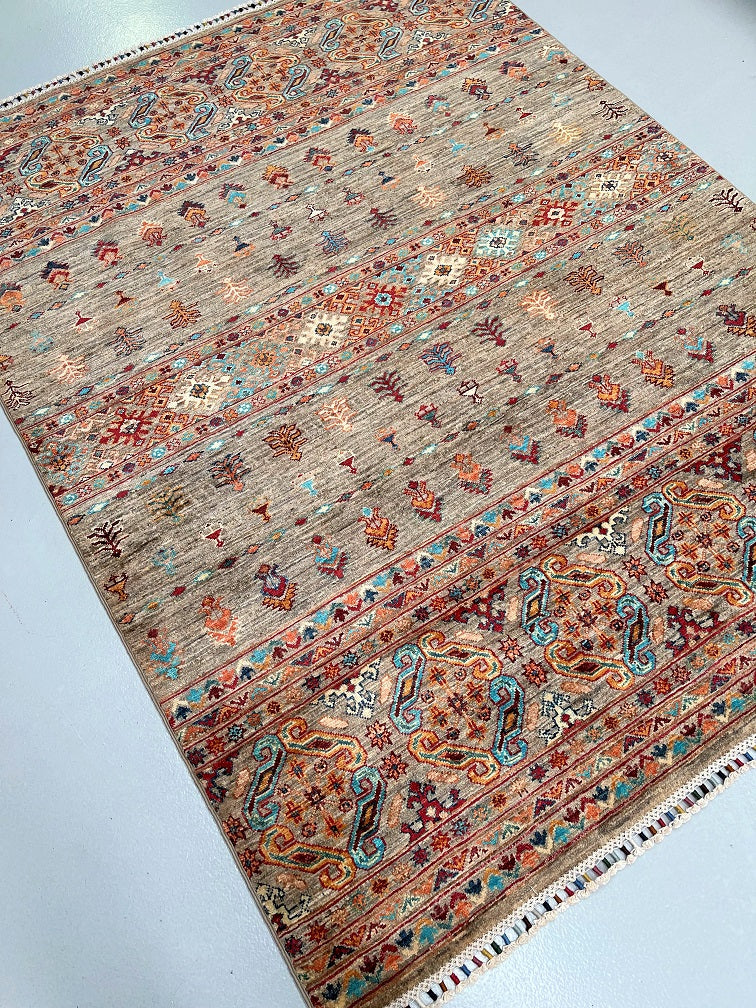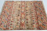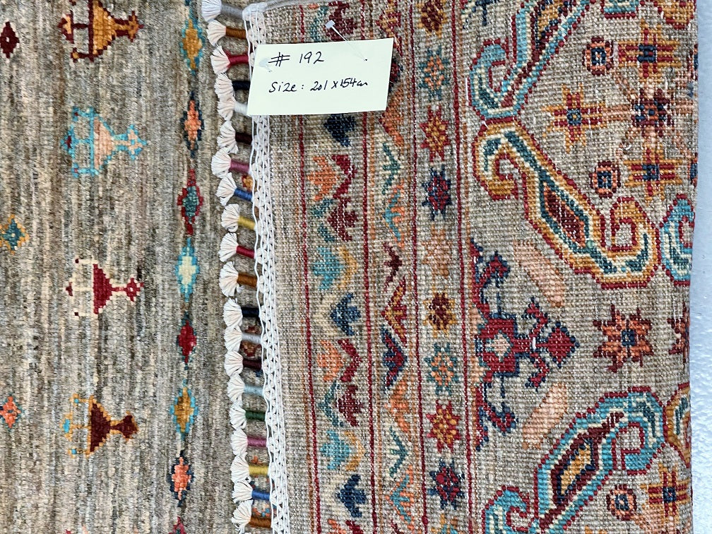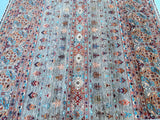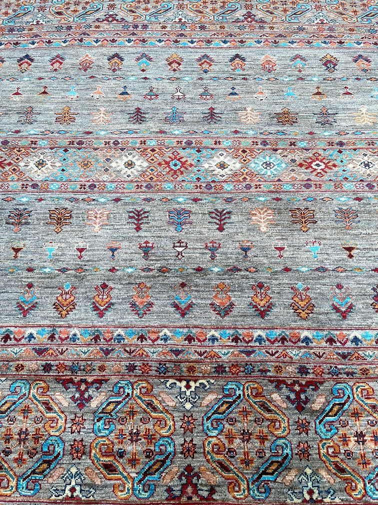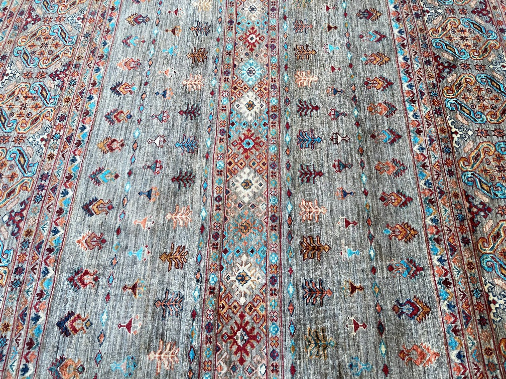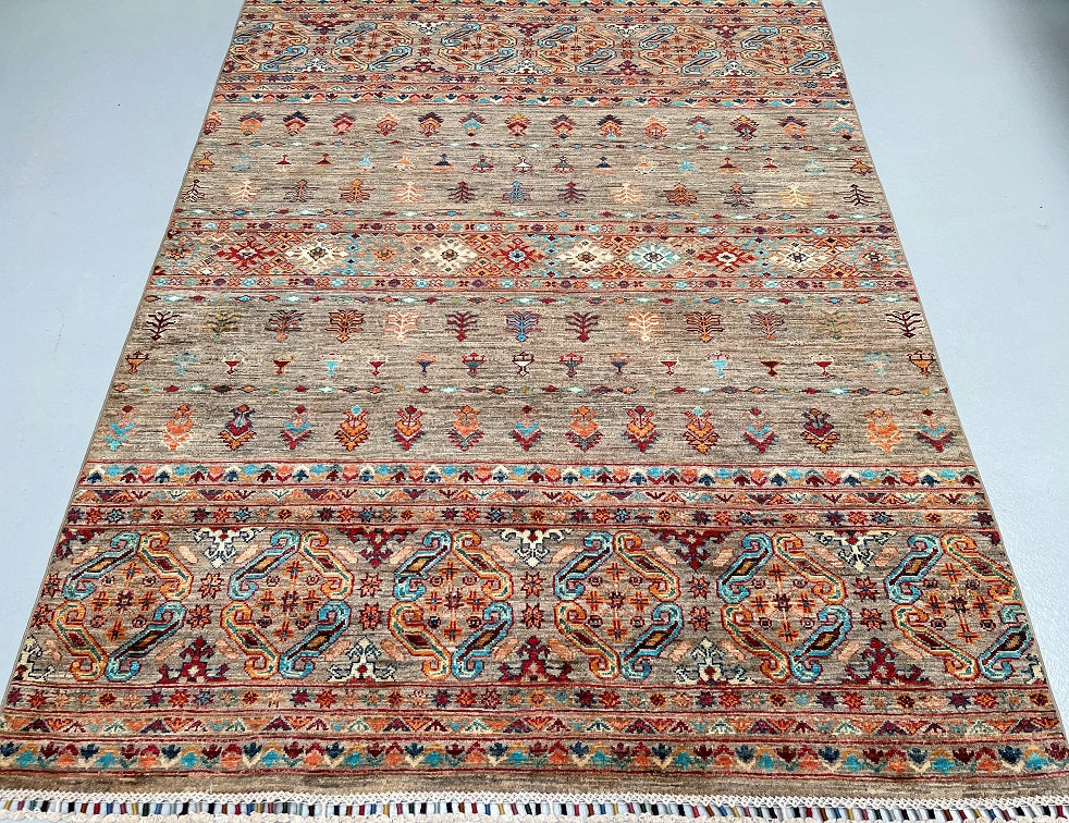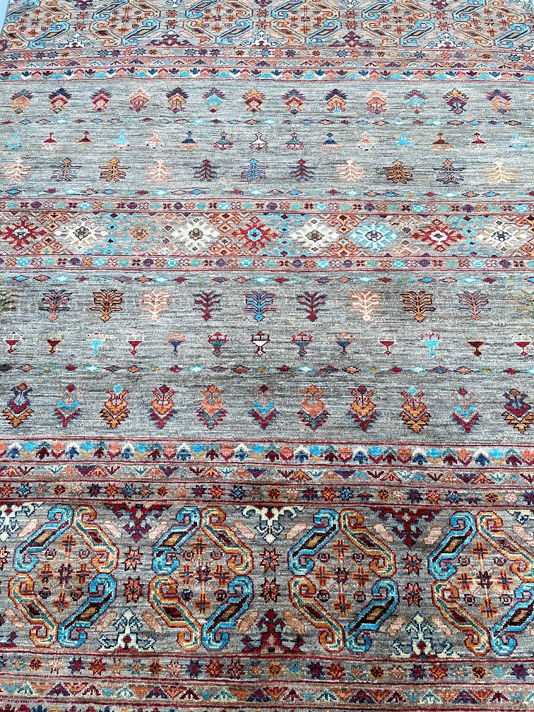 Unique Coffee Table To Room Size Hand Knotted Afghan Super Kazak Rug. Above All It Has A Pure Hand Spun Wool Pile On Cotton Base. Olive Green, Grey, Beige, Aqua Blue, Orange And Terracotta Tone Dyed Using Traditional Methods (Vegetable Dyes). Last of True Woven Nomadic Art.