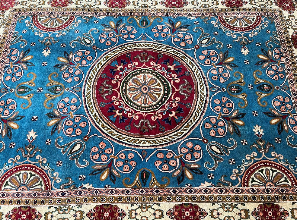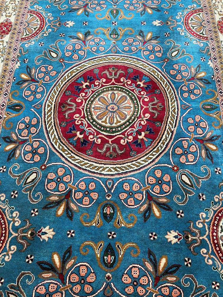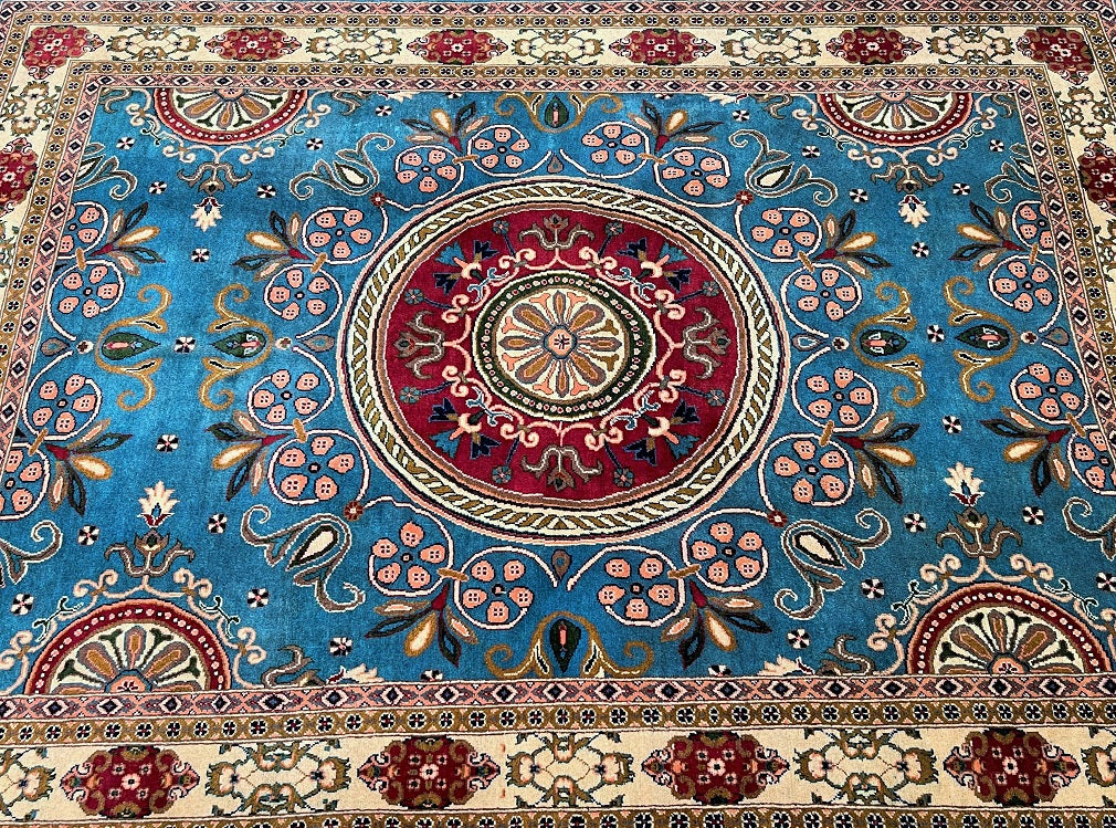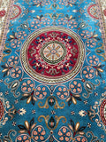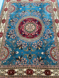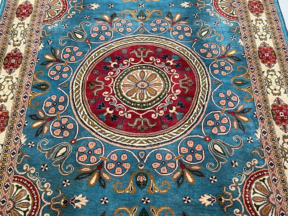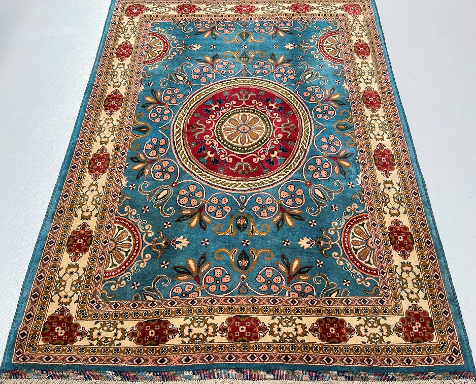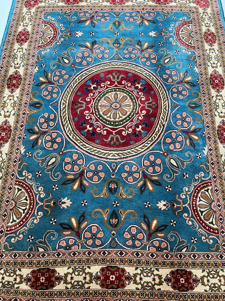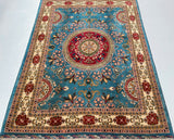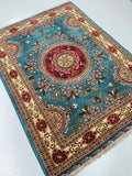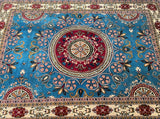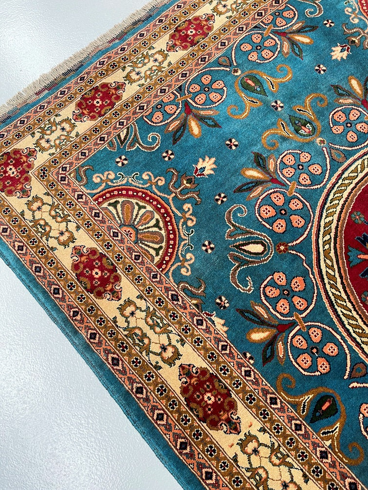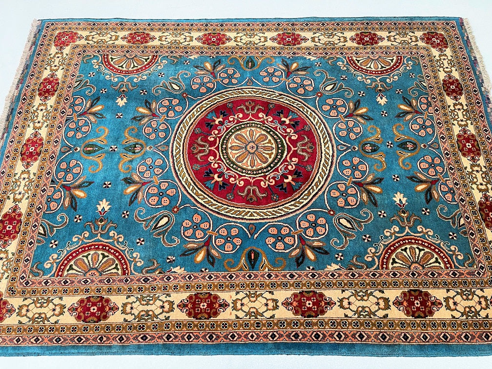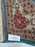 Fine Coffee Table Size Hand Knotted Afghan Roshnai Rug. Above All It Has A Pure Hand Spun Merino Wool Pile On Wool Base. It Also Has A turquoise Tone Dyed Using Traditional Methods.