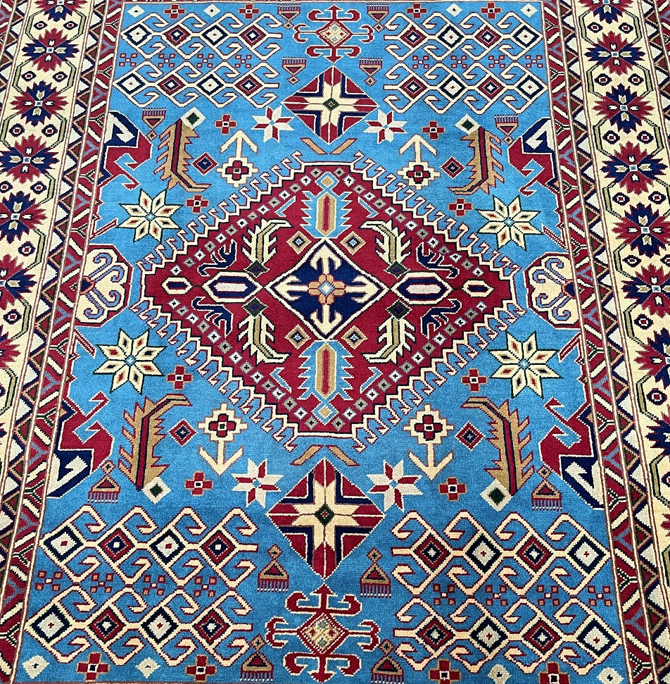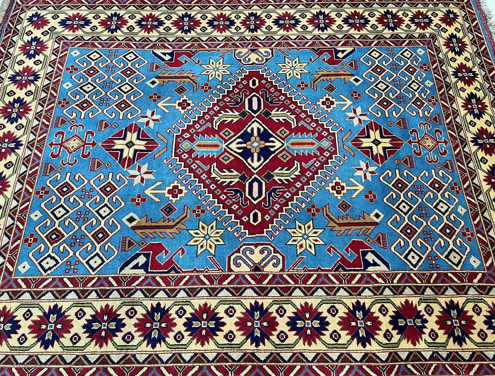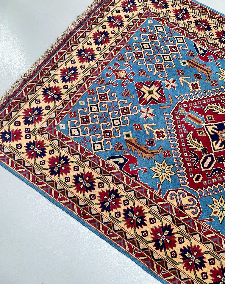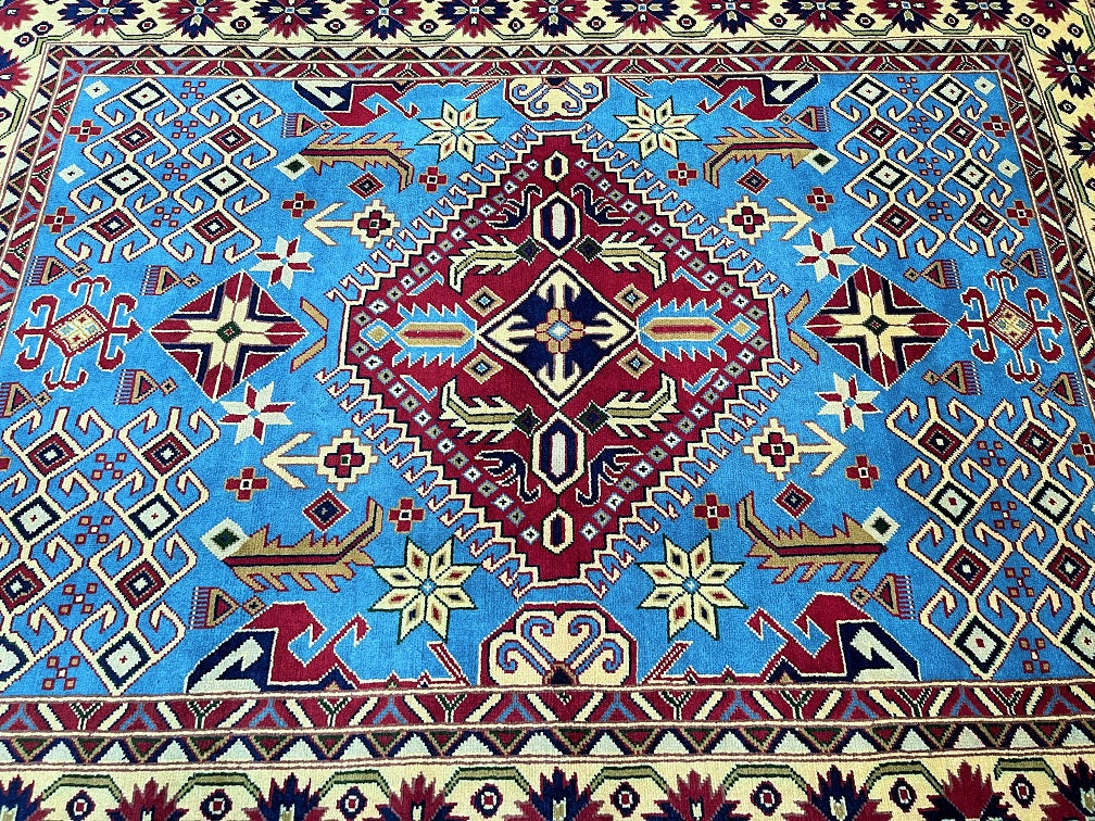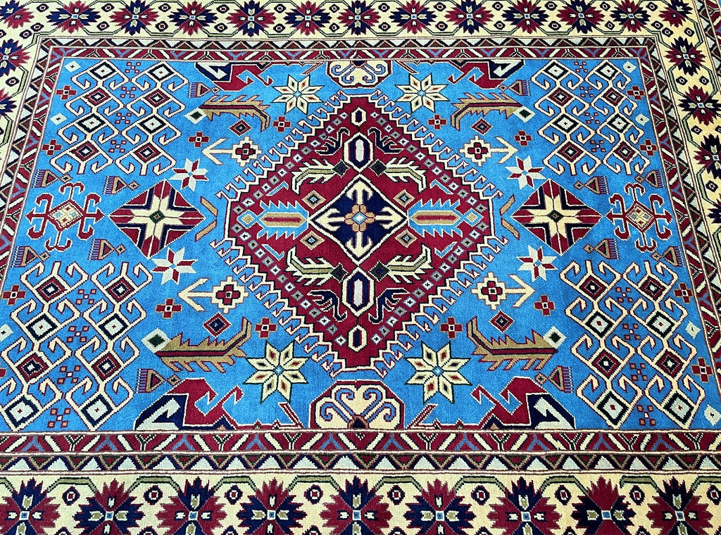 Fine Coffee Table Size Authentic Hand Knotted Afghan Roshnai Rug. Above All It Is Pure Hand Spun Merino Wool Pile On Cotton Base. It Also Has A French Blue Background Dyed Using Traditional Methods.