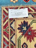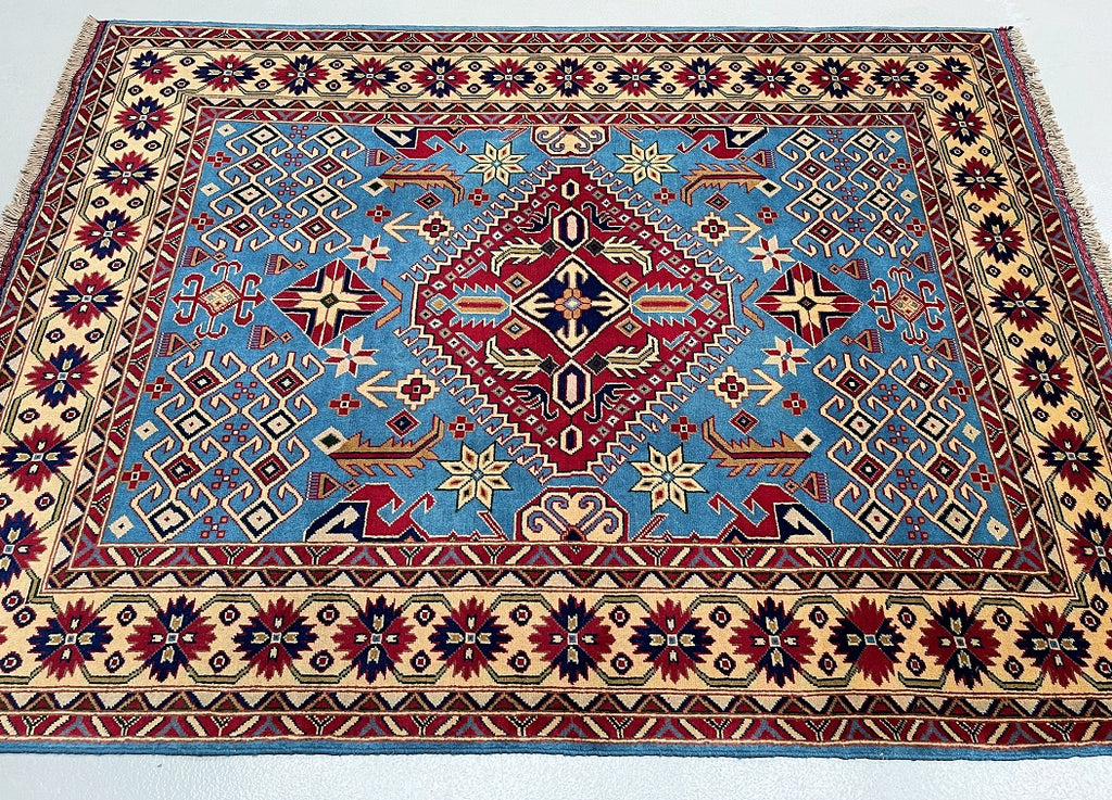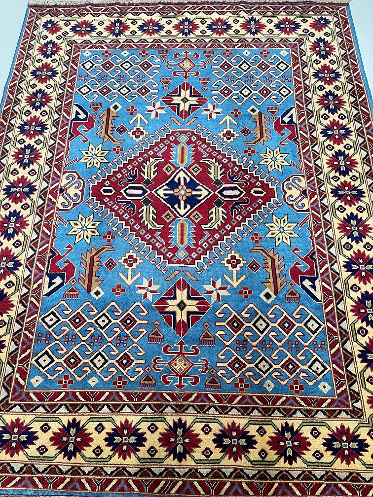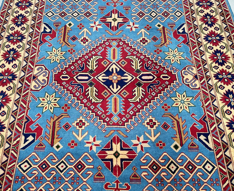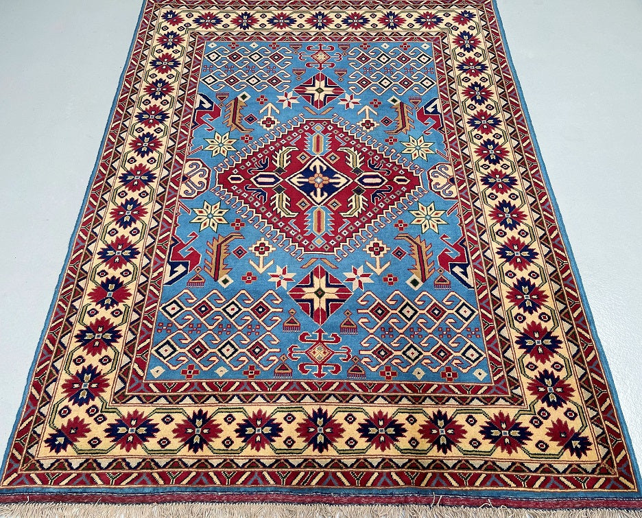 Fine Coffee Table Size Authentic Hand Knotted Afghan Roshnai Rug. Above All It Is Pure Hand Spun Merino Wool Pile On Cotton Base. It Also Has A French Blue Background Dyed Using Traditional Methods.