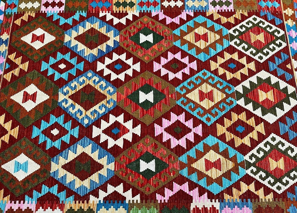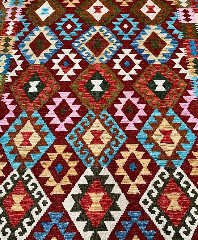 Bohemian Hand Woven Afghan Meymaneh Kilim Rug. Above All It Has A Pure Hand Spun Wool Pile On Wool Base. Vibrant Tone Dyed Using Vegetable Roots.