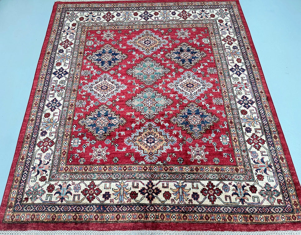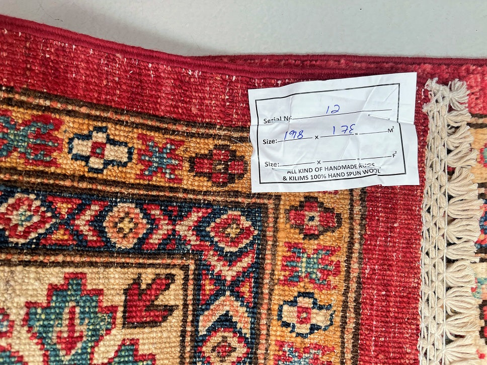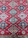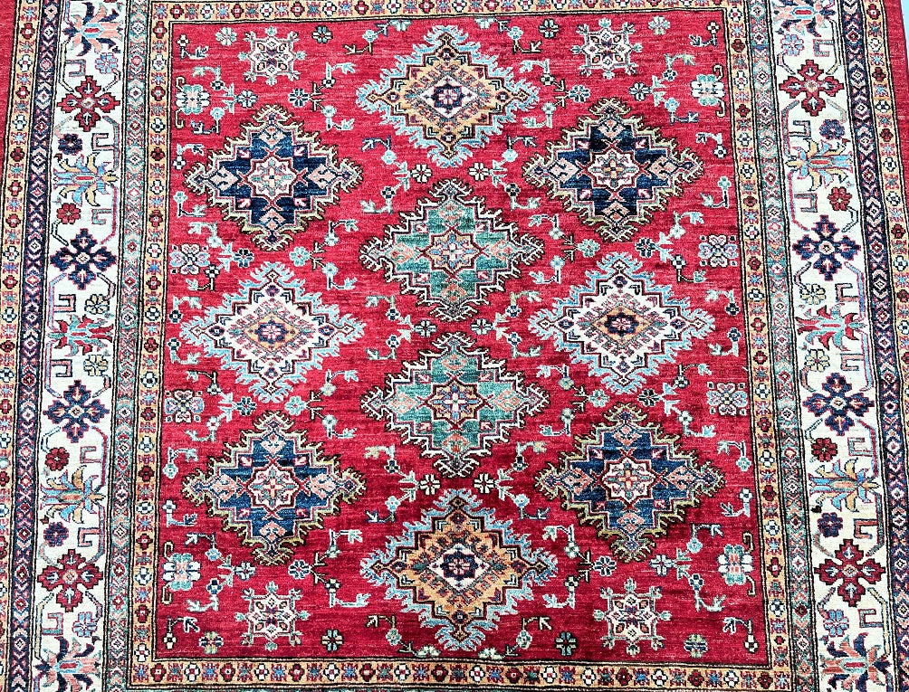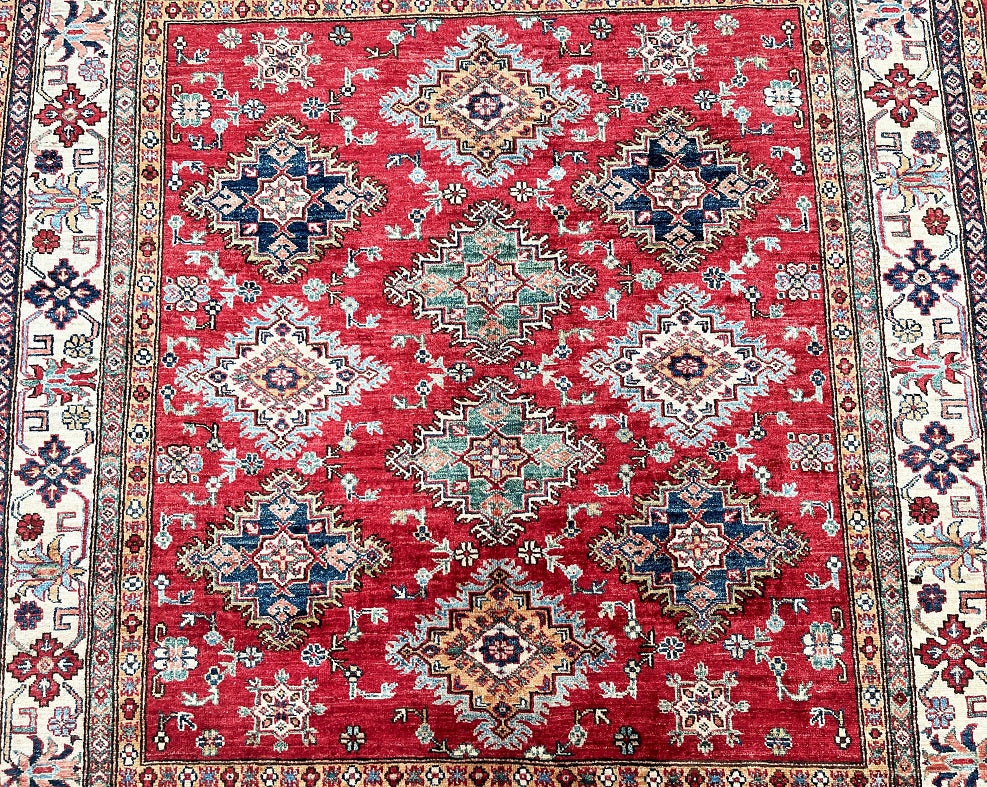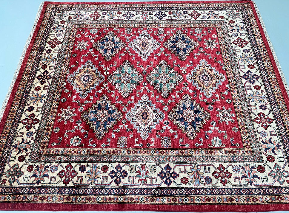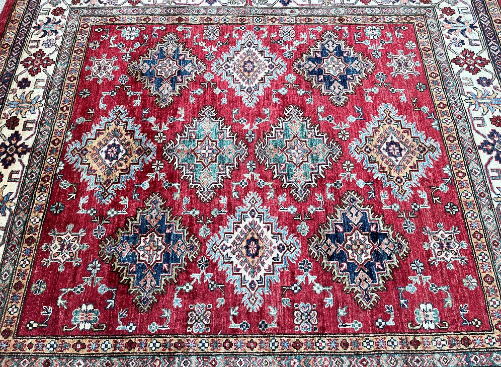 Gorgeous Square Room Size Authentic Handmade Super Kazak Rug. Above All You Would Rarely Find A Kazak Rug In a Square Size. It Also Has a Pure Hand Spun Wool Pile On Cotton Base. Stunning Red, Beige, Blue, Green And Orange Tone Dyed Using Traditional Methods (Vegetable Dyes). Last Of True Woven Tribal Art.