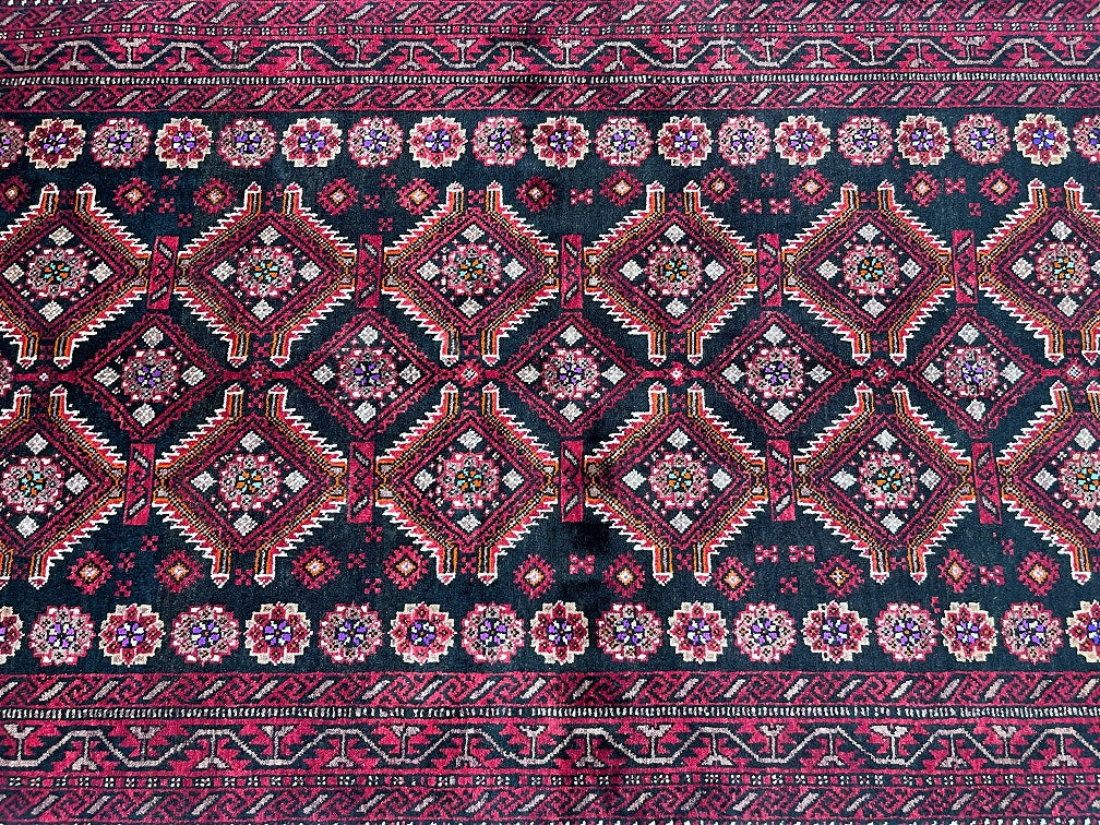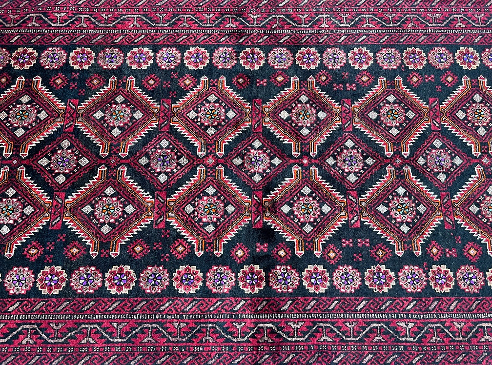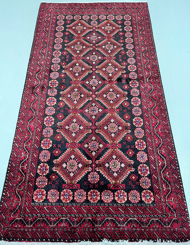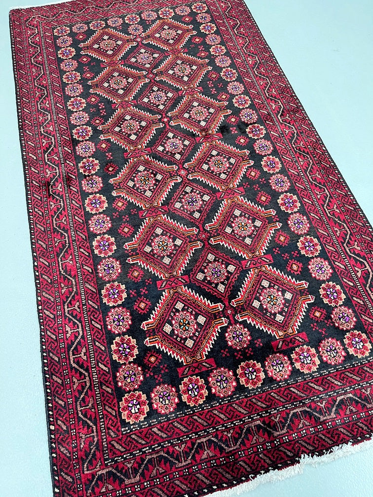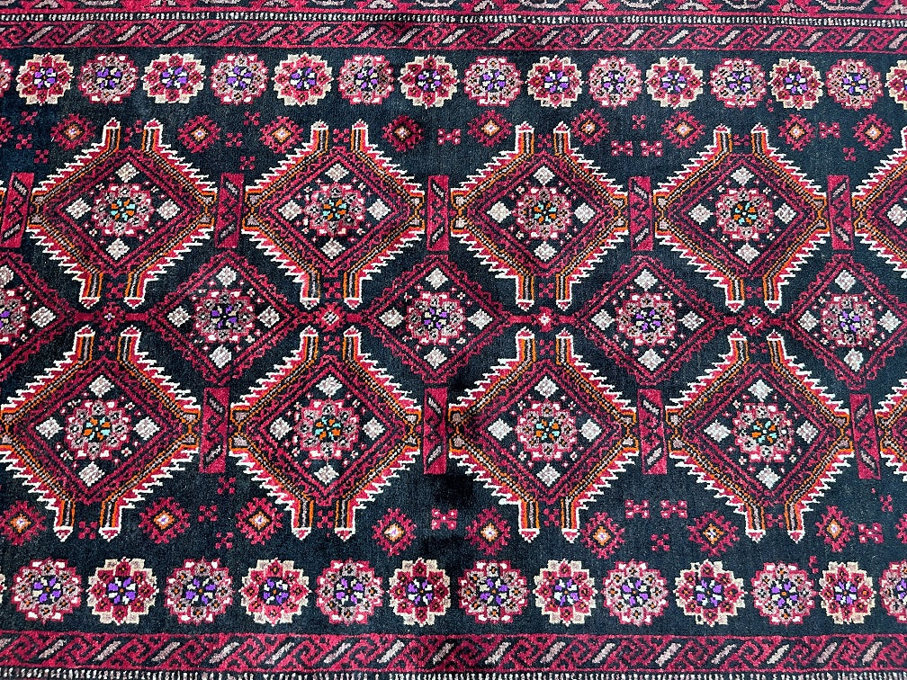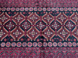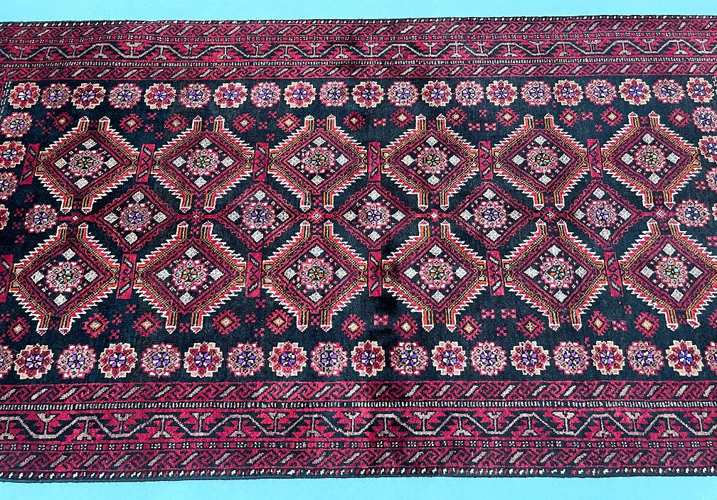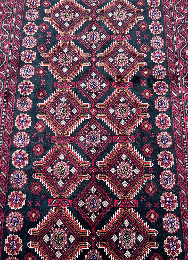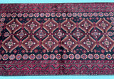Collectable Coffee Table Size Authentic Handmade Persian Balouchi Rug Which Also Can Be Used As A Runner. It Has A Pure Hand Spun Wool Pile On Cotton Base. Black, Beige, Maroon, Orange And Touch Of Purple Tone Dyed Using Traditional Methods.