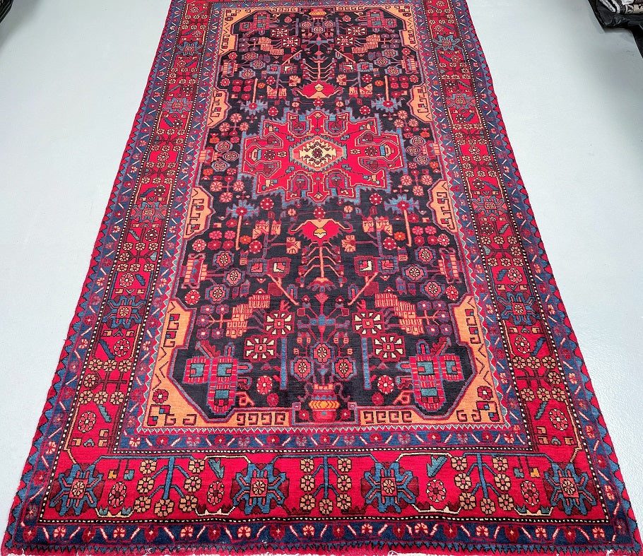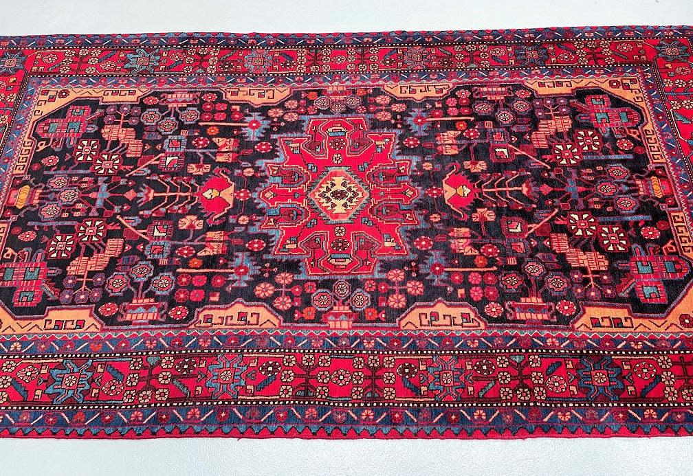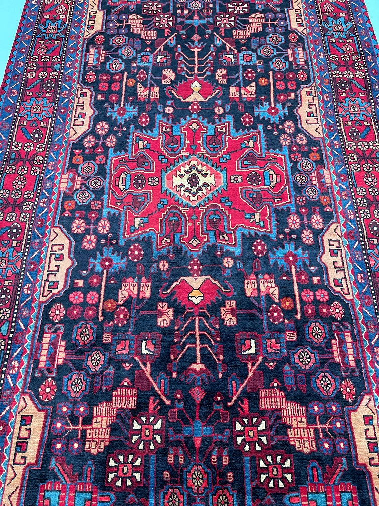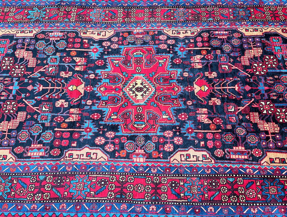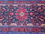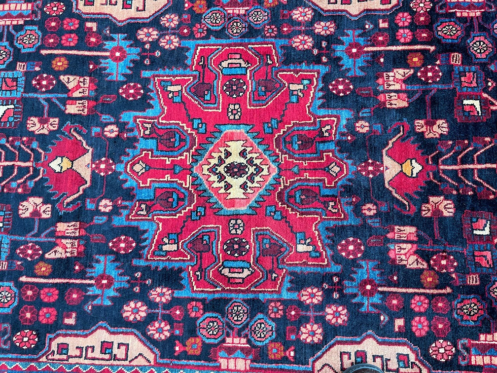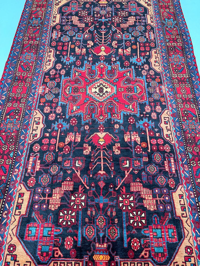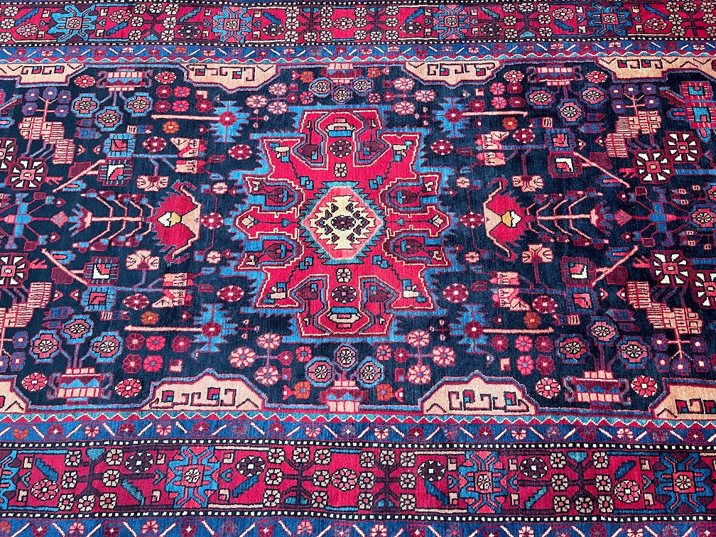 Full Room Size Authentic Handmade Tribal Persian Nahavand Rug. Above All It Is Hard To Find Tribal Design Handmade In Larger Sizes. Pure Hand Spun Wool Pile On Cotton Base. It Also Has a Deep Indigo Blue Tone Dyed Using Traditional Methods.