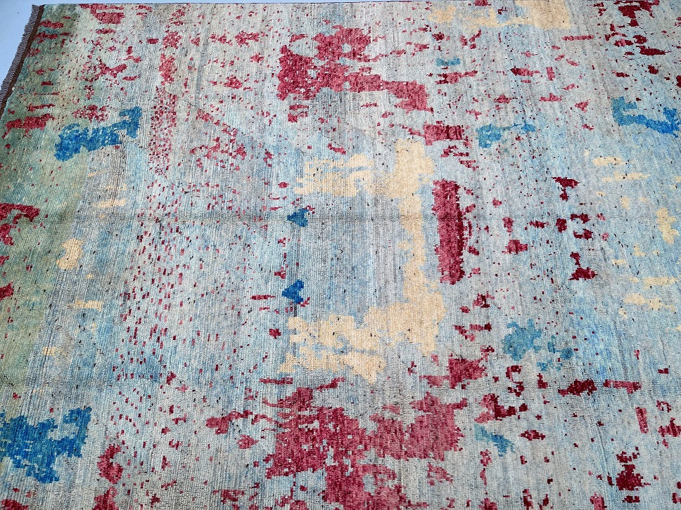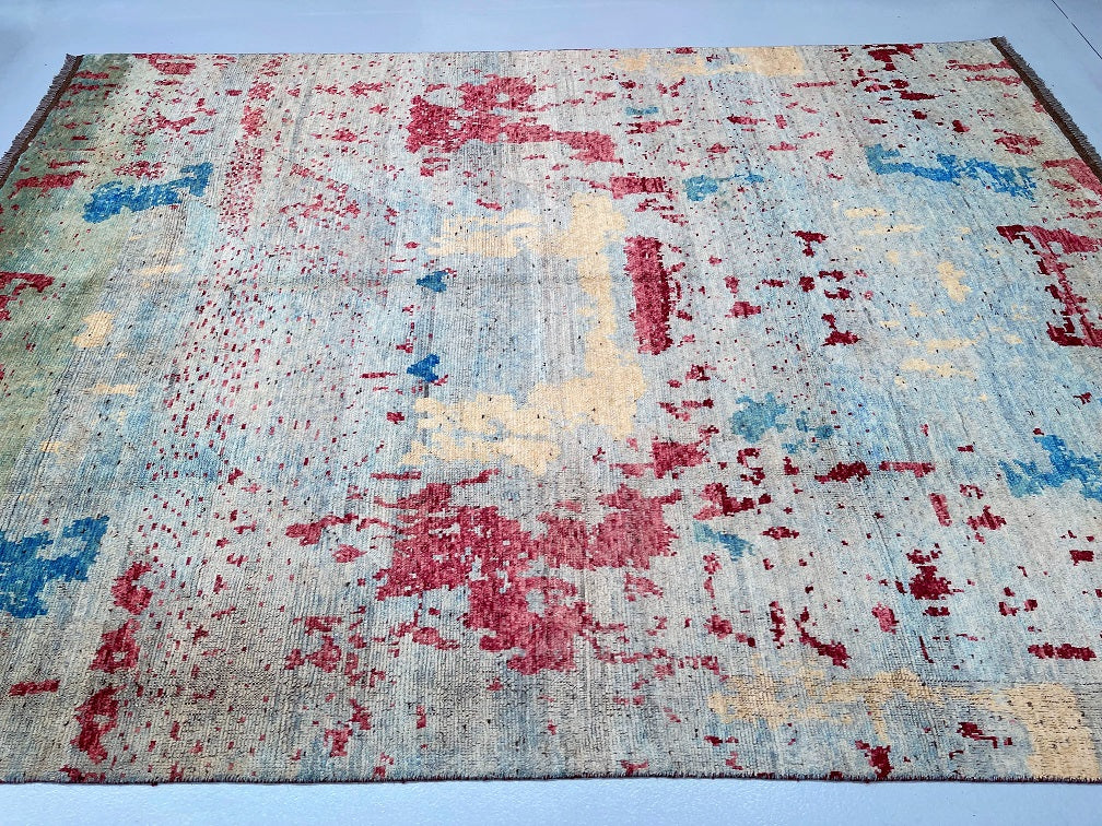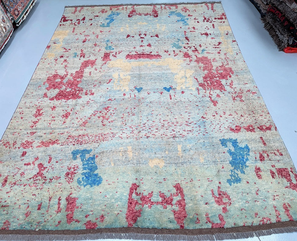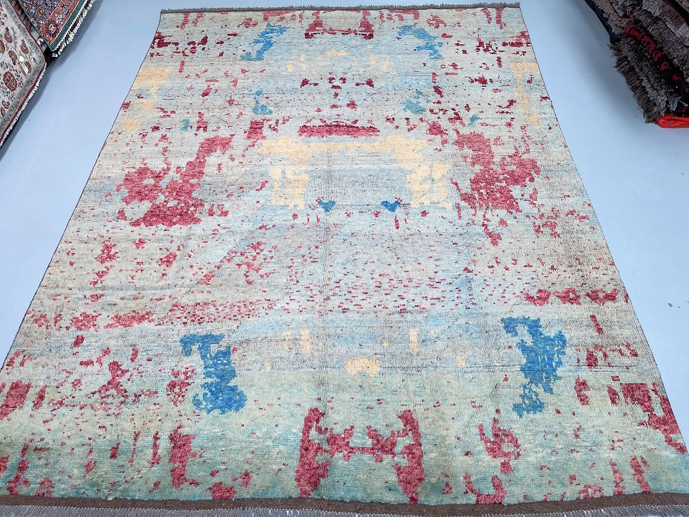 Large Room Size Contemporary Hand Knotted Afghan Gabbeh Rug. Above All It Has A Thick Wool Pile On Wool Base. Beige, Aqua And Red Tone Dyed Using Traditional Methods. Last of True Woven Nomadic Art.