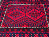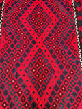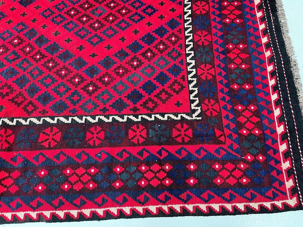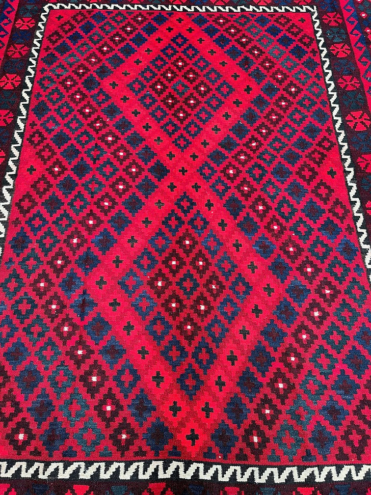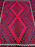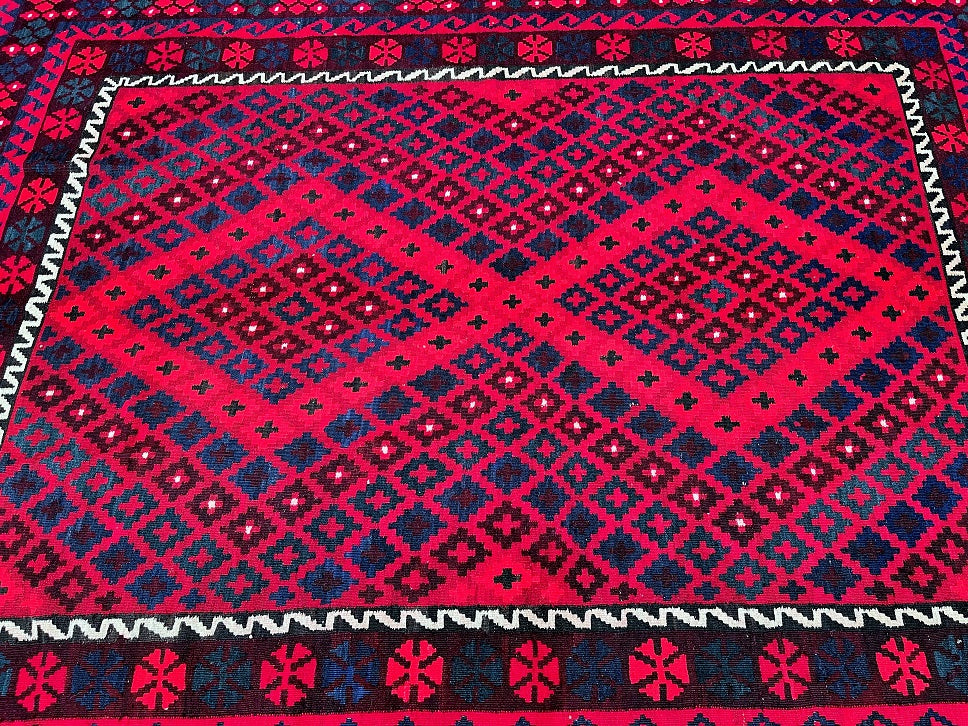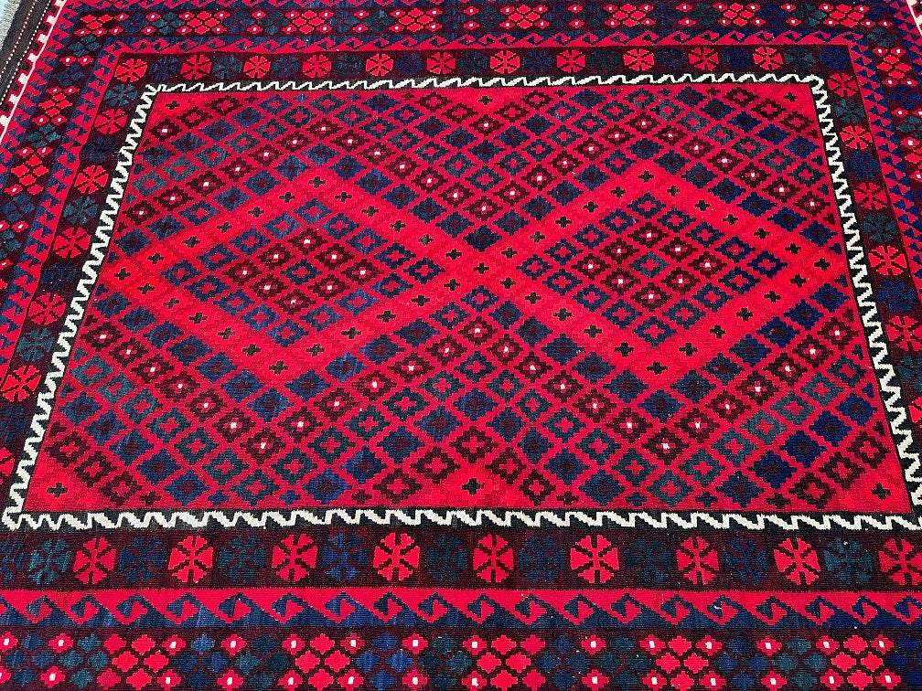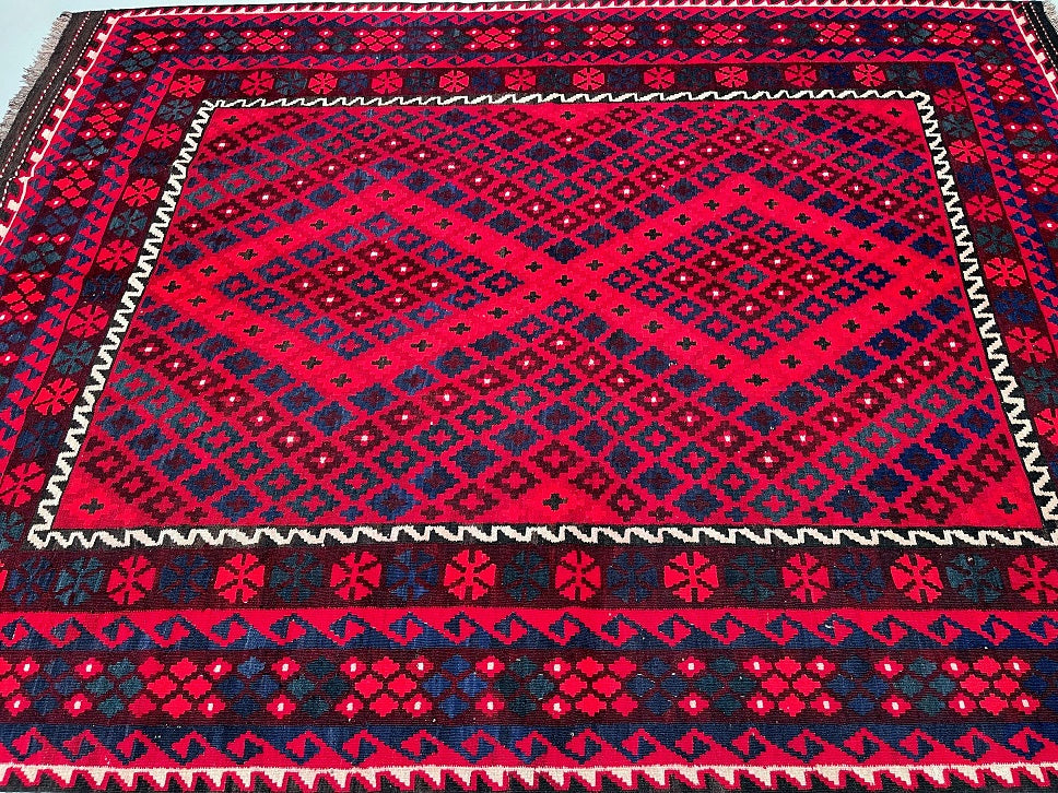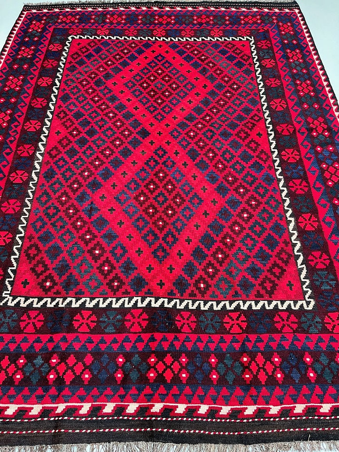 Large Room Size Tribal Design Hand Woven Afghan Meymaneh Kilim Rug. Above All It Has A Pure Hand Spun Wool Pile On Wool Base. Red, Indigo Blue, White And Black Tone Dyed Using Traditional Methods.