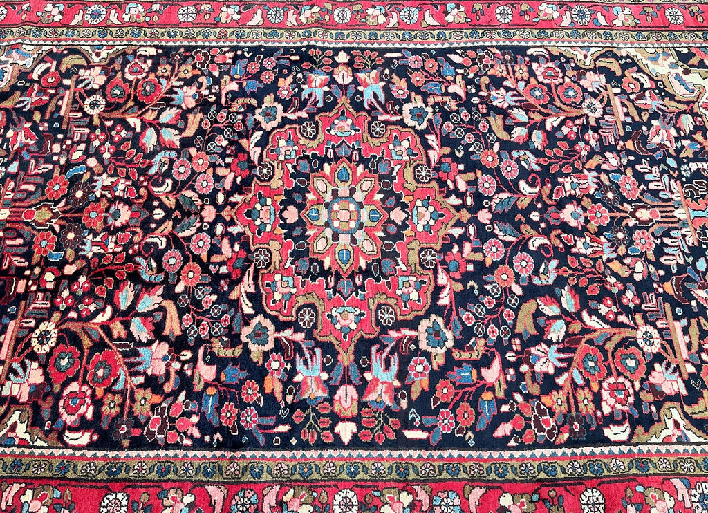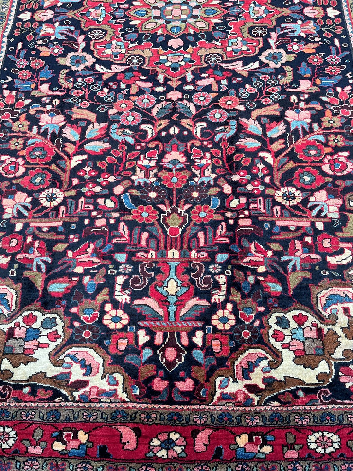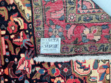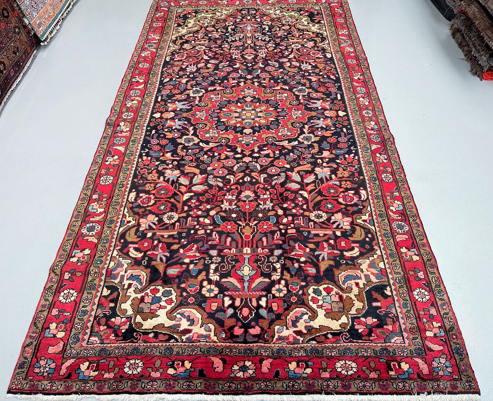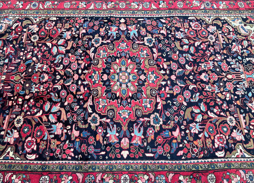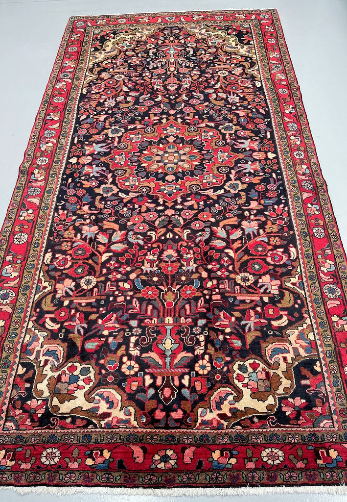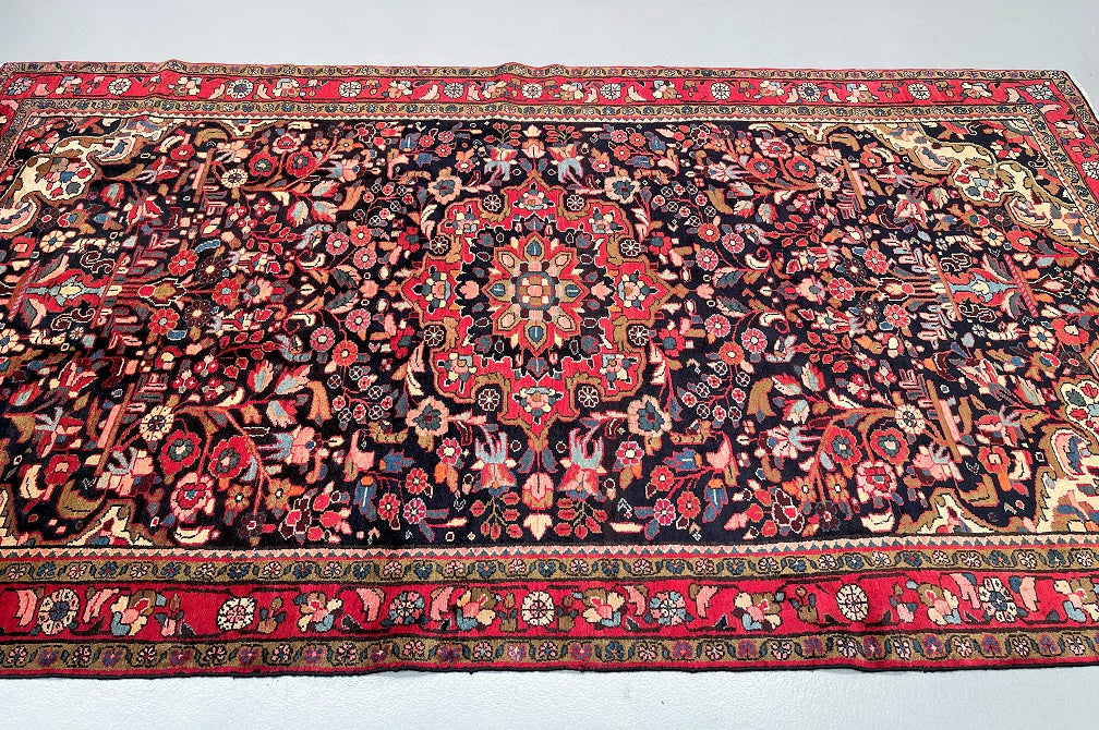 Full Room Size Handmade Persian Nanaj Rug. This village piece is not only a rare handmade tribal gem but also features a pure hand-spun wool pile on a cotton base, ensuring its superior craftsmanship. The vibrant Black, blues, red, orange, pink, green, and brown tones are achieved through traditional dyeing methods, adding a captivating allure to this rug. Adorned with a central medallion floral design, it serves as a stunning centre piece for any room. The dedication and skill of a weaver are evident, as it took approximately 6 months to complete this rug. Hand-woven in the Hamadan region of Central West Persia, this rug measures 325 x 181 cm and holds a gallery replacement value of $5500.
