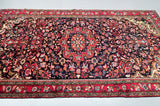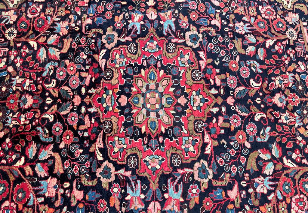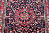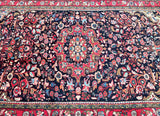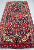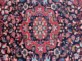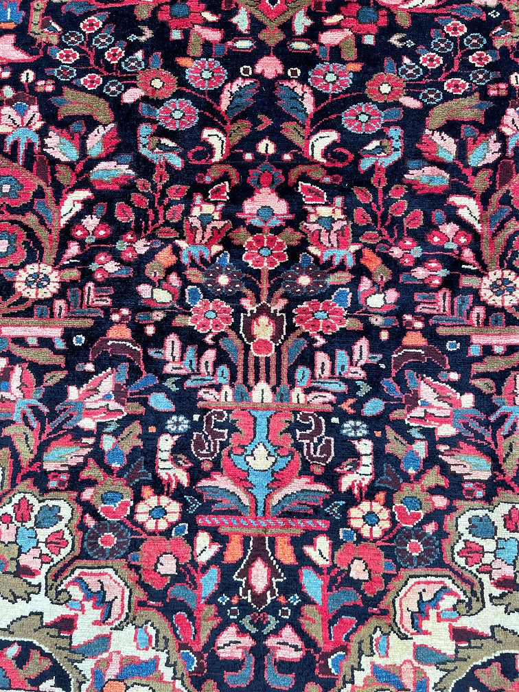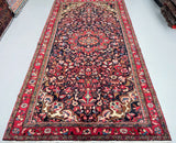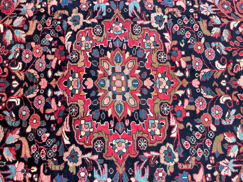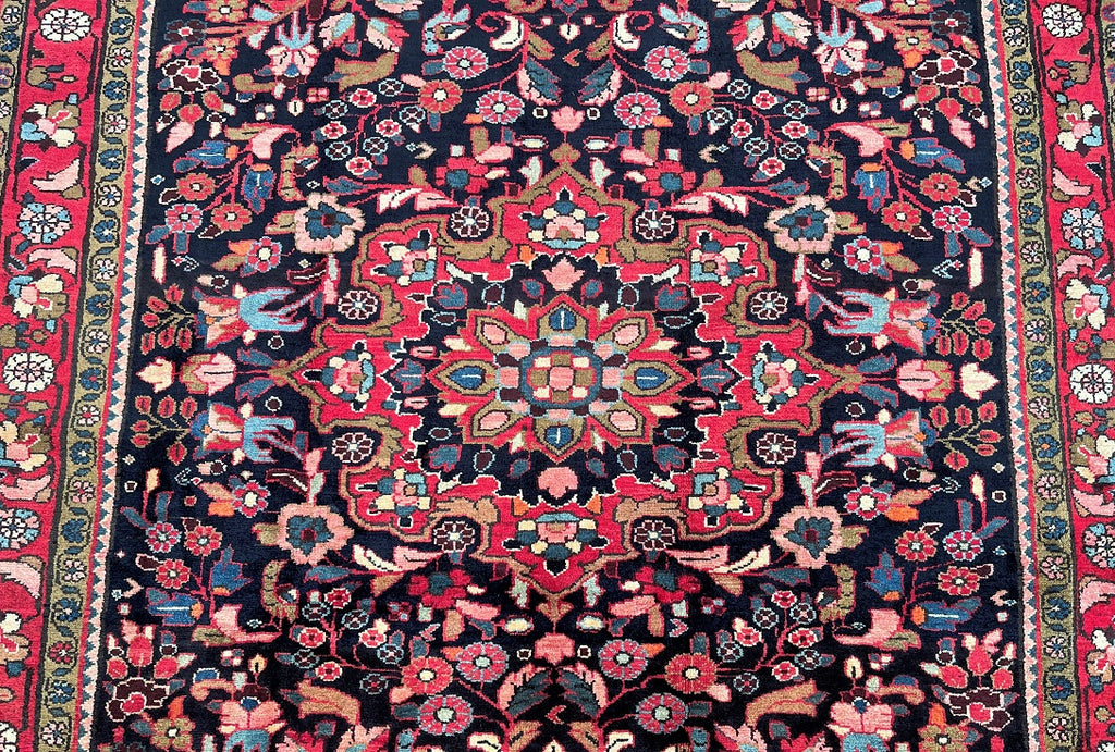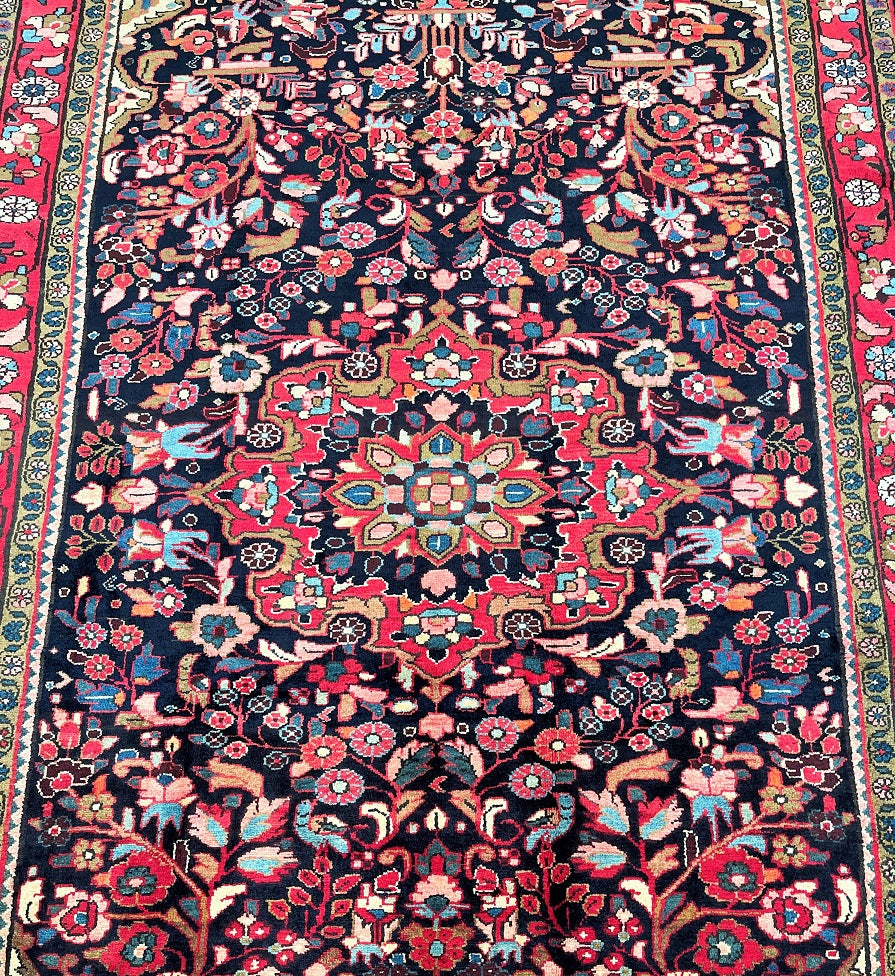 Full Room Size Handmade Persian Nanaj Rug. This village piece is not only a rare handmade tribal gem but also features a pure hand-spun wool pile on a cotton base, ensuring its superior craftsmanship. The vibrant Black, blues, red, orange, pink, green, and brown tones are achieved through traditional dyeing methods, adding a captivating allure to this rug. Adorned with a central medallion floral design, it serves as a stunning centre piece for any room. The dedication and skill of a weaver are evident, as it took approximately 6 months to complete this rug. Hand-woven in the Hamadan region of Central West Persia, this rug measures 325 x 181 cm and holds a gallery replacement value of $5500.