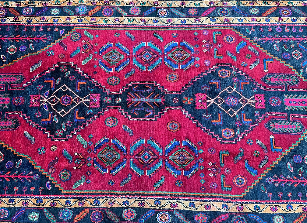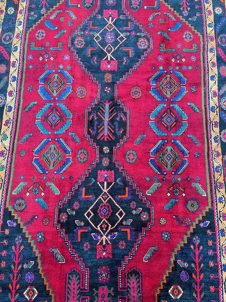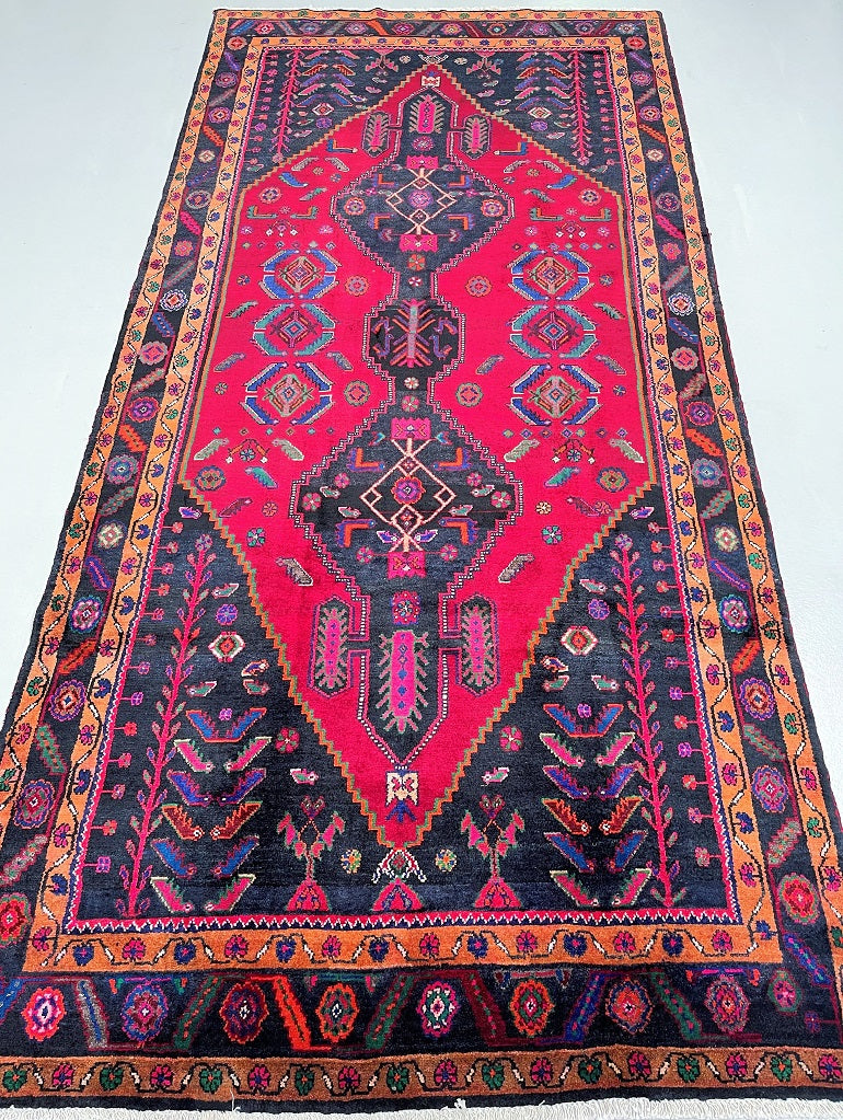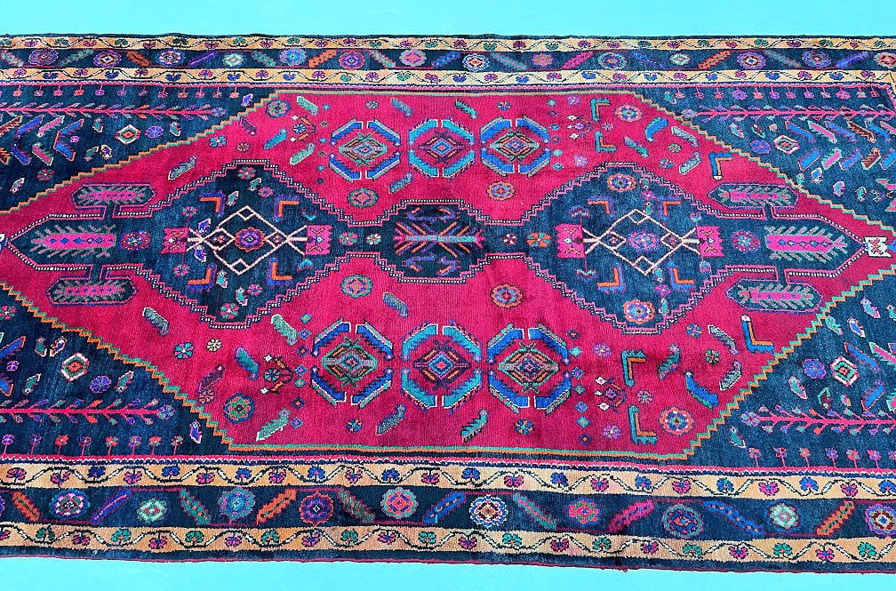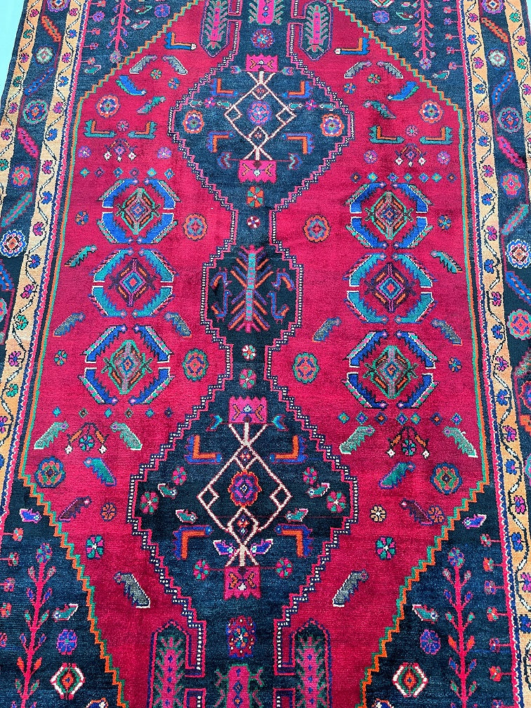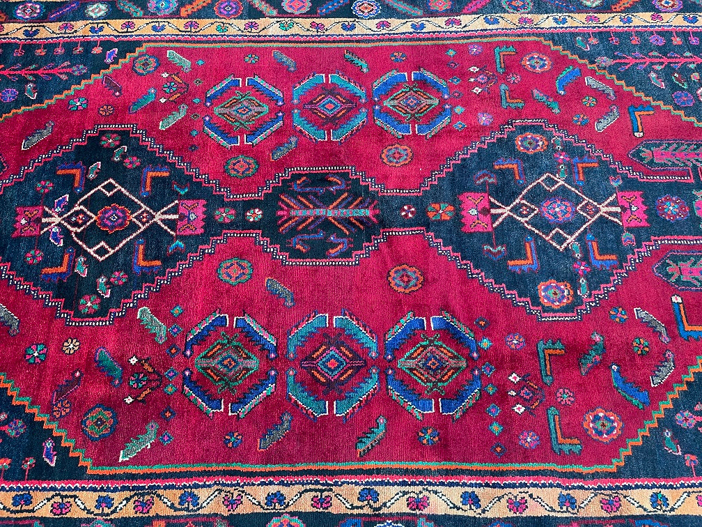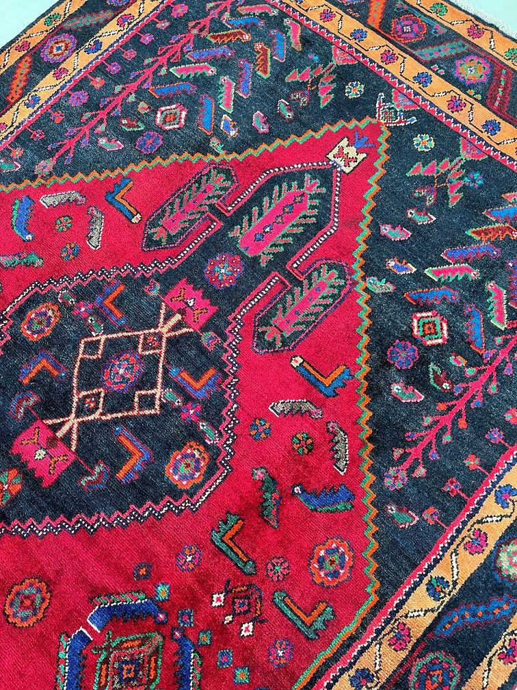Rare Full Room Size Genuine Handmade Tribal Persian Luri Rug. Above All it is A Hand Spun Wool Which Feels Really Nice To Walk on. It Is Also Ideal For Every Day Usage. Pure Hand Spun Wool Pile On Fine Cotton Base. Maroon Red, Pink, Indigo Blue/Black And Orange Tone Dyed Using Traditional Methods.