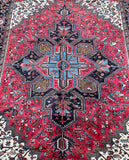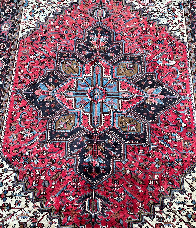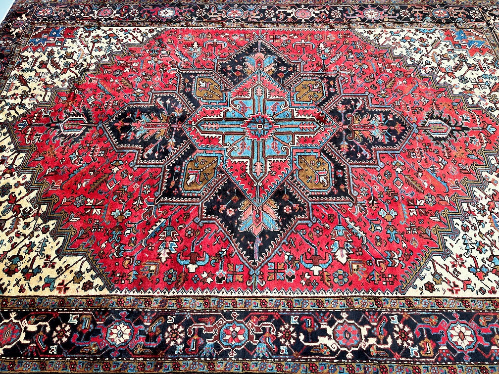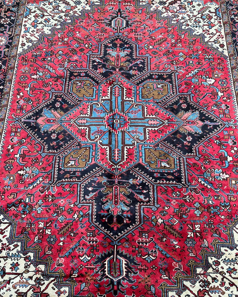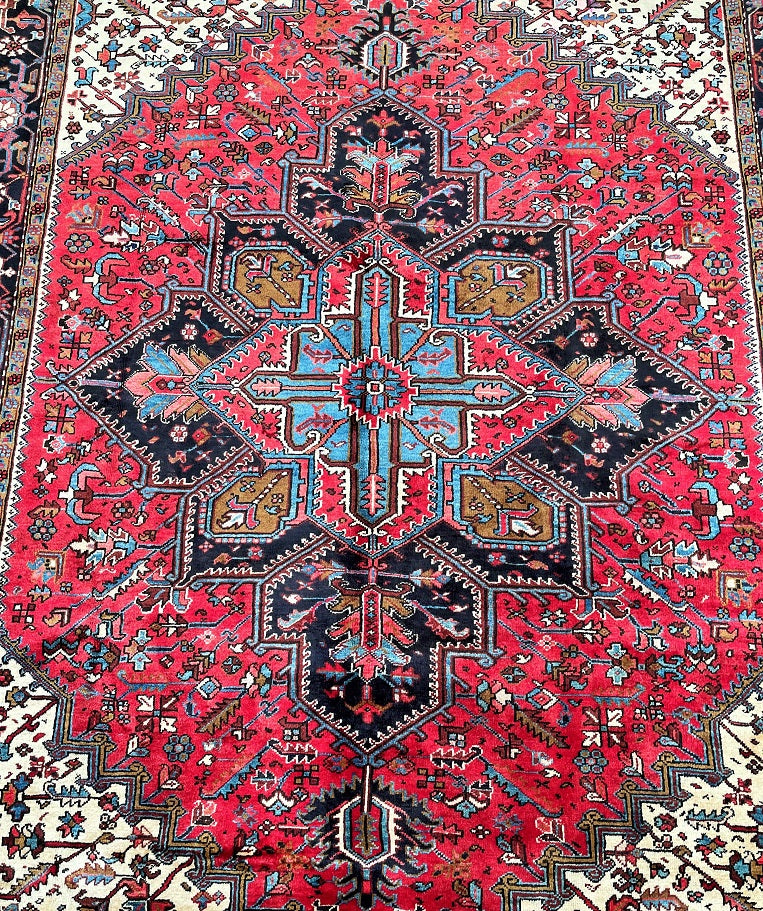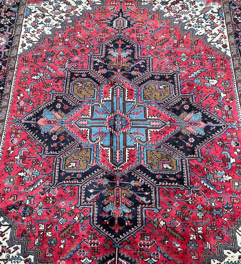 Large Room Size Authentic Handmade Persian Heriz Rug. Above All It Is Hard To Find This Quality Original Handmade Carpet From This Region. It Also Has A Pure Wool Pile On Cotton Base. Pinkish Red, Beige, Blue, Black, Brown And Pink Tone Dyed Using Traditional Methods.