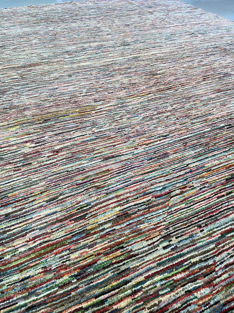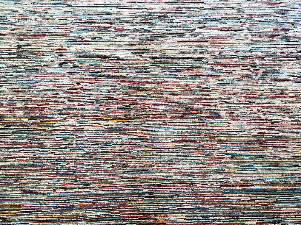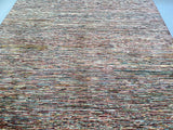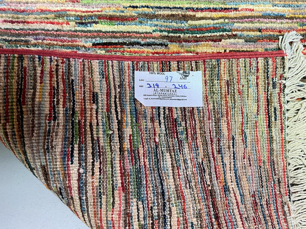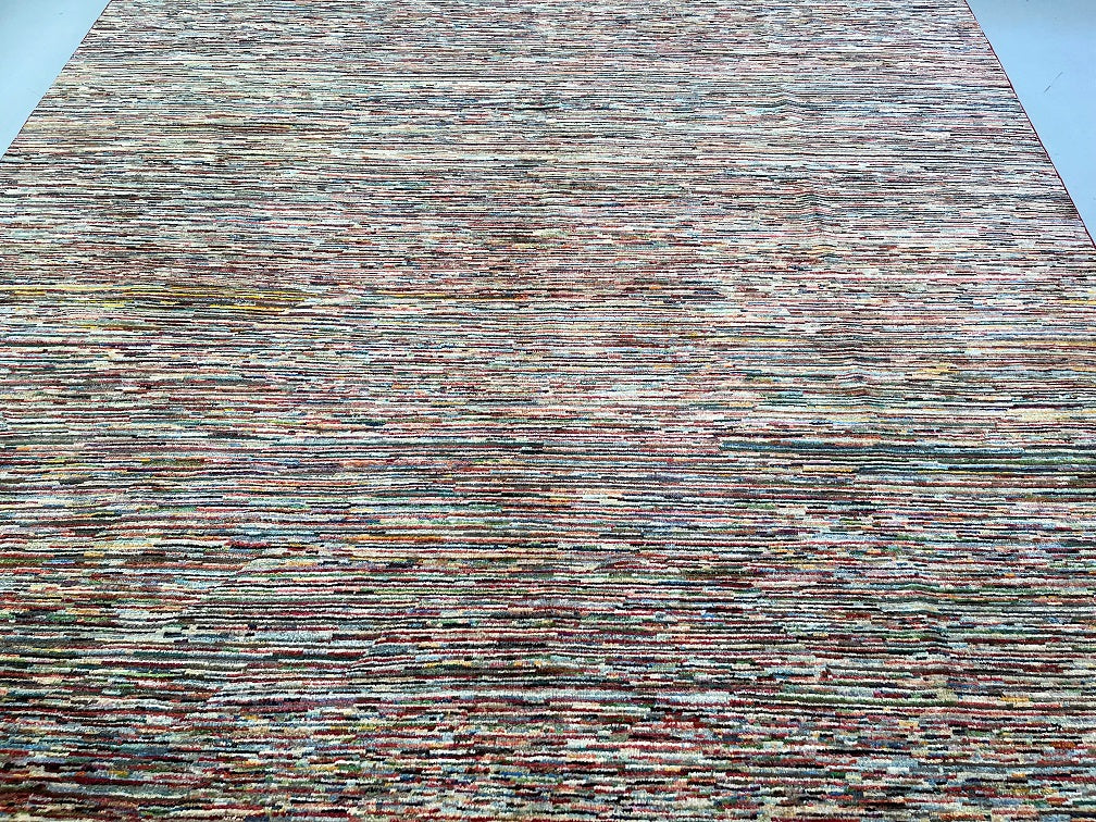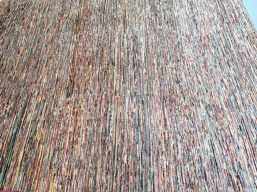 This stunning large room size contemporary Gabbeh Chobi rug is a true work of art, boasting an authentic hand-knotted craftsmanship. It features a luxurious pile made of pure hand-spun wool, skillfully woven onto a cotton base. The color palette is breathtaking, showcasing beautiful autumn tones that have been dyed using traditional methods with vegetable dyes. This rug represents the last of true woven nomadic art, capturing the essence of cultural heritage. The decorative allover contemporary linear design adds a touch of modern elegance to any space. The level of dedication involved in creating this masterpiece is evident, as it would have taken two skilled weavers approximately 6-9 months to complete. Hand-woven in Afghanistan, this rug measures 319 x 246 cm and holds a gallery replacement value of $7500.