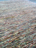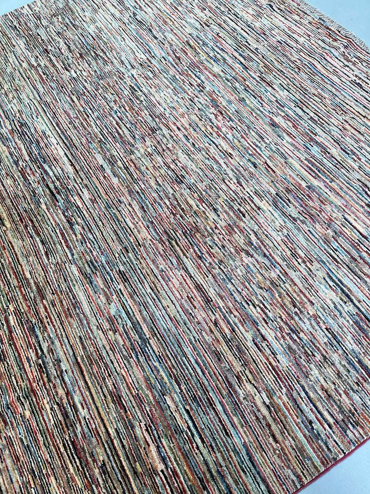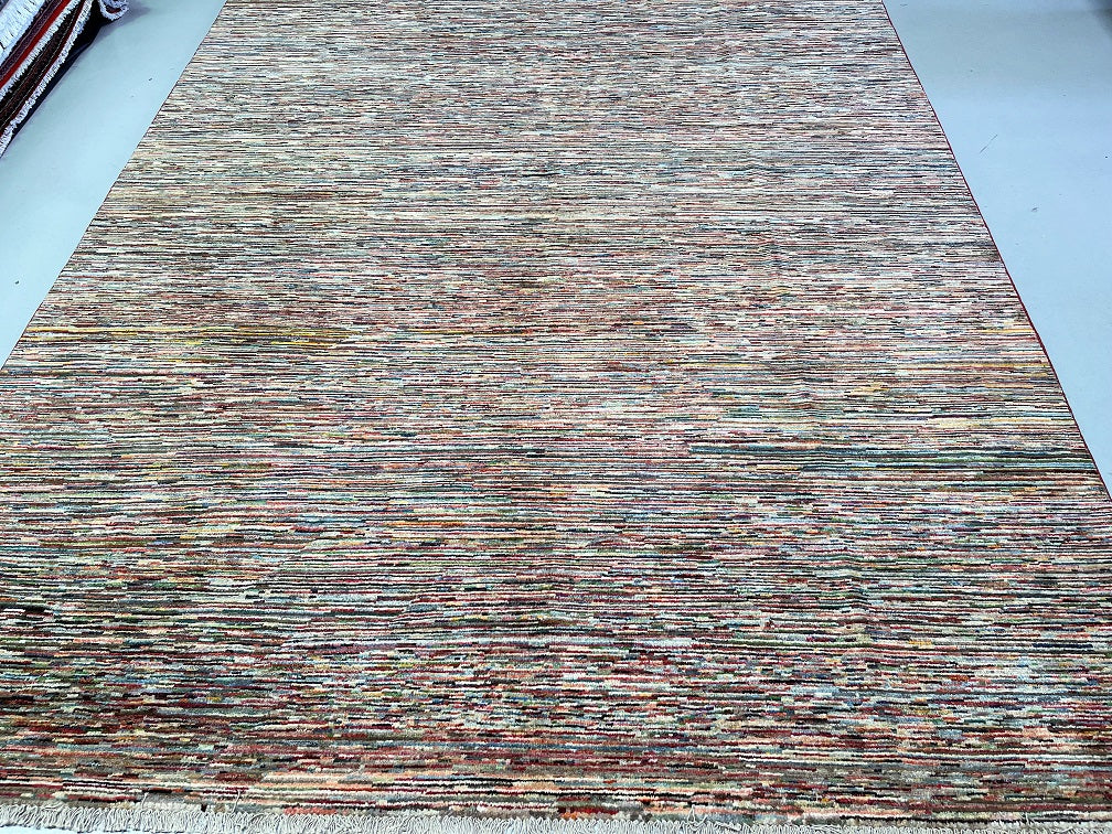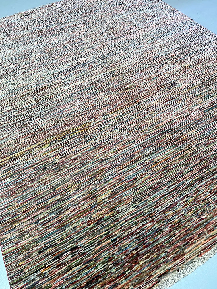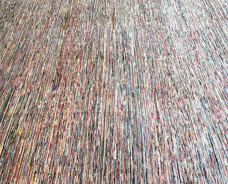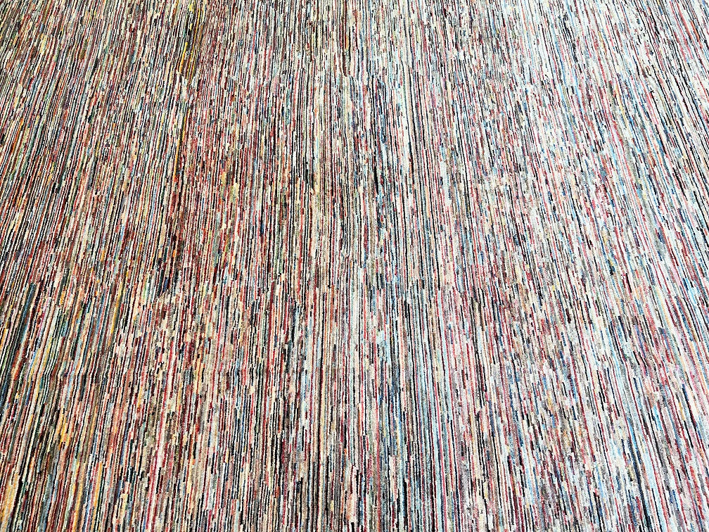 This stunning large room size contemporary Gabbeh Chobi rug is a true work of art, boasting an authentic hand-knotted craftsmanship. It features a luxurious pile made of pure hand-spun wool, skillfully woven onto a cotton base. The color palette is breathtaking, showcasing beautiful autumn tones that have been dyed using traditional methods with vegetable dyes. This rug represents the last of true woven nomadic art, capturing the essence of cultural heritage. The decorative allover contemporary linear design adds a touch of modern elegance to any space. The level of dedication involved in creating this masterpiece is evident, as it would have taken two skilled weavers approximately 6-9 months to complete. Hand-woven in Afghanistan, this rug measures 319 x 246 cm and holds a gallery replacement value of $7500.