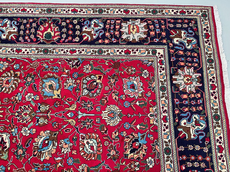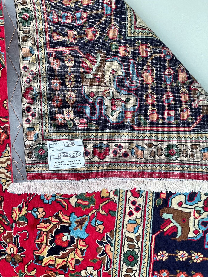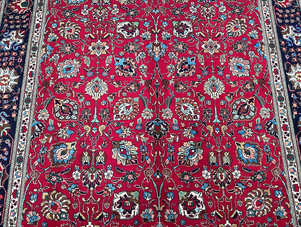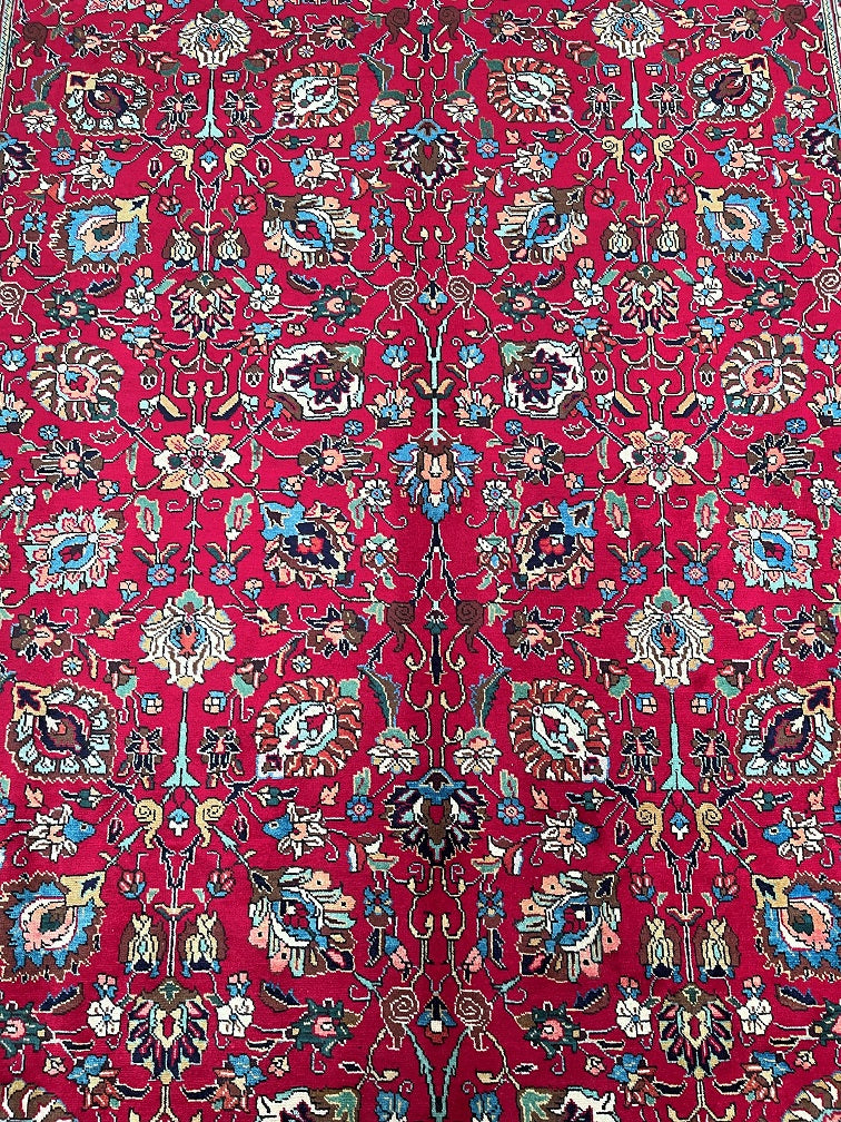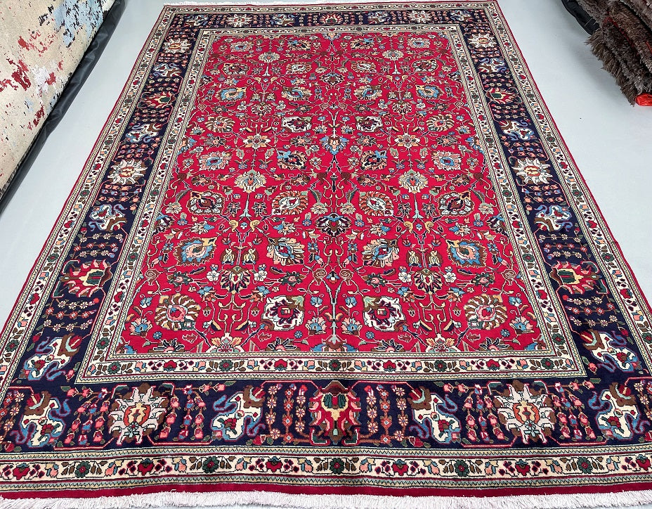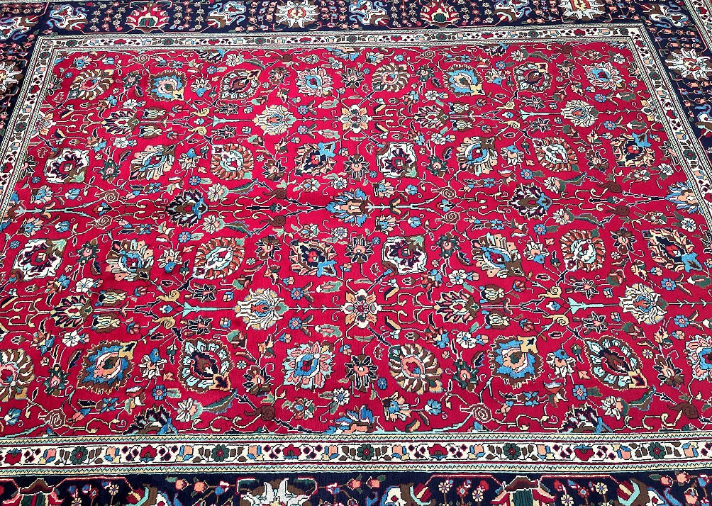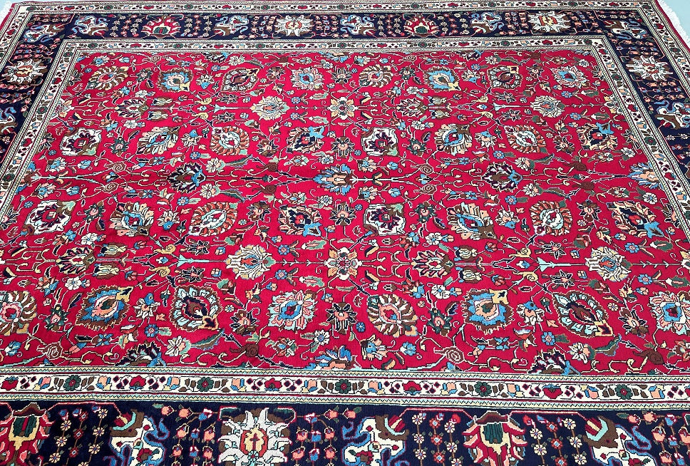 Large Room Size Authentic Handmade Persian Azarshahr Tabriz Rug. Above All It Has A Pure Wool Pile On Cotton Base. It Also Has A Beautiful Red, Beige, Blue, Green, Brown, Peach And Pink Tones Dyed Using Traditional Methods.