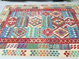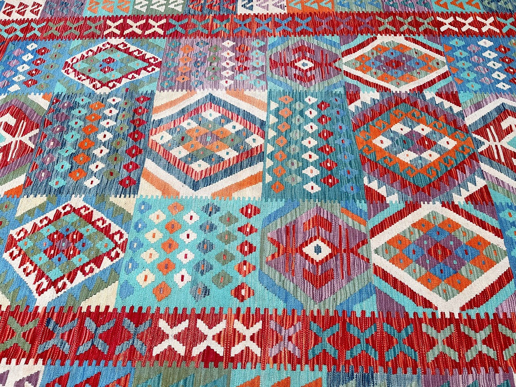 Large Room Size Bohemian Hand Woven Afghan Ariana Kilim Rug. Above All It Is Reversible. It Also Has A Pure Hand Spun Wool Pile On Wool Base. Vibrant Tone Dyed Using Vegetable Roots.