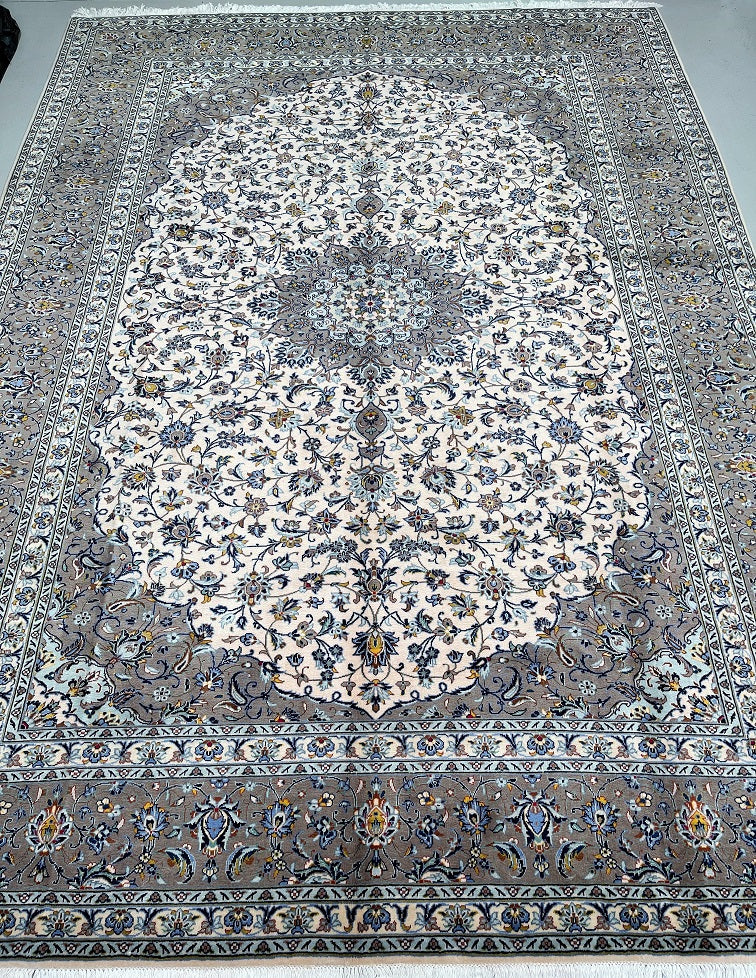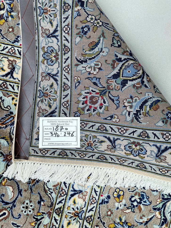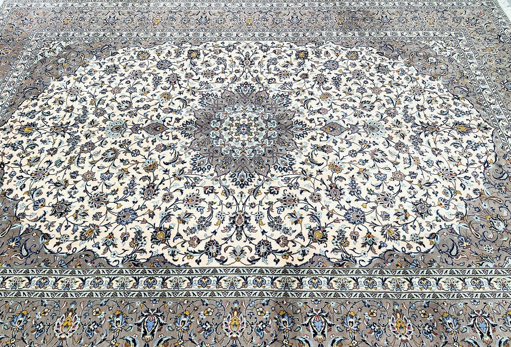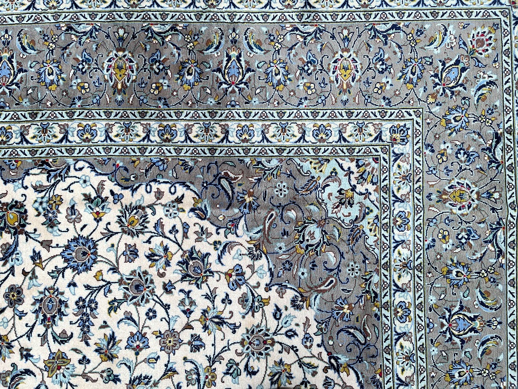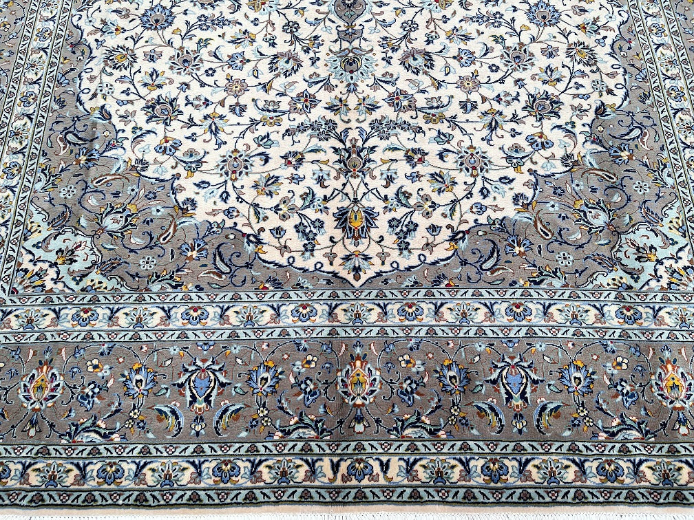 Superb Large Room Size Authentic Handmade Vintage Persian Kashan Rug. Above All It Has A Goat Hair Pile (Kork Wool) on Cotton Base. Beige, Aqua, Olive Green, Blue, With Hint Of Grey And Light Brown Tone Dyed Using Traditional Methods. Fine Quality Piece That Would Last You a Life Time.