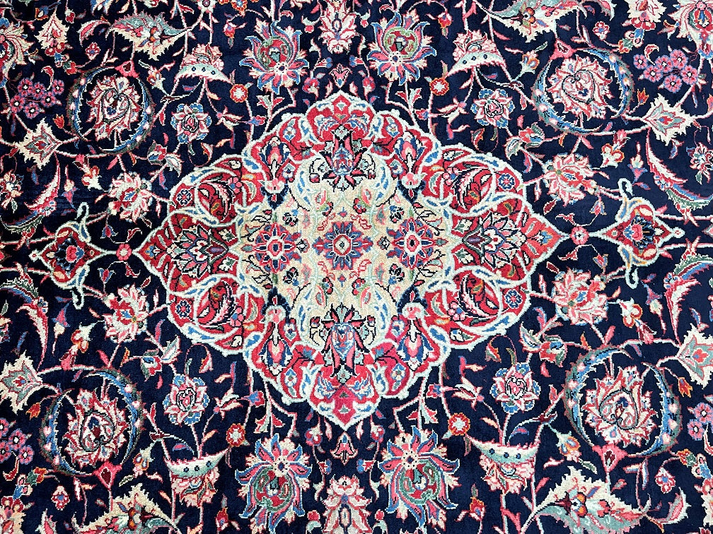 Rare Large Room Size Authentic Vintage Persian Sarough Rug. Above All It Is Hard To Get This Quality Original Handmade Rug From This Region (Mohajeran). It Also Has Pure Lamb’s Wool Pile On Cotton Base. Indigo Blue, Red, Beige, French Blue, Orange And Pink Dyed Using Traditional Methods.