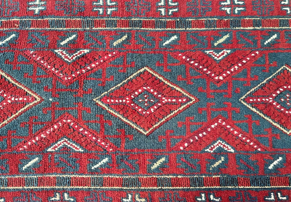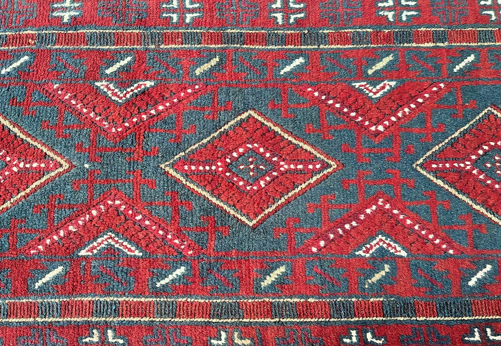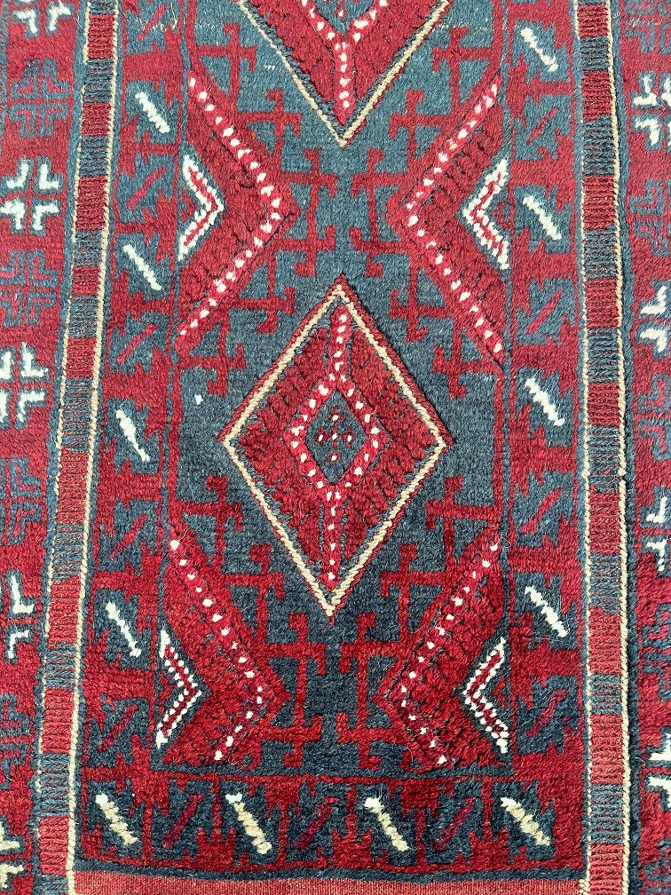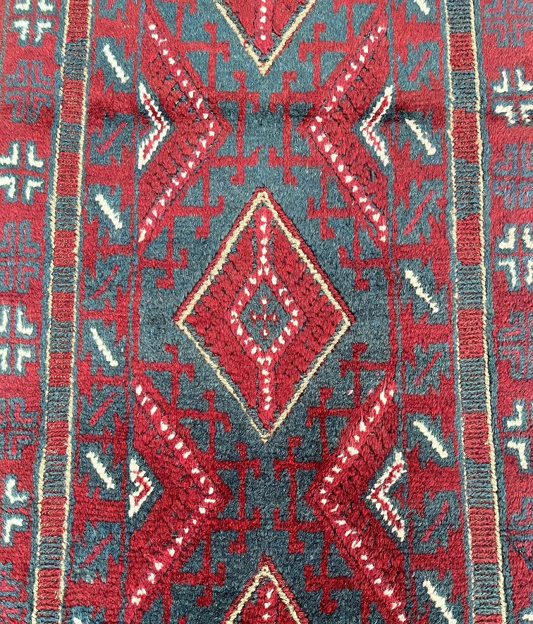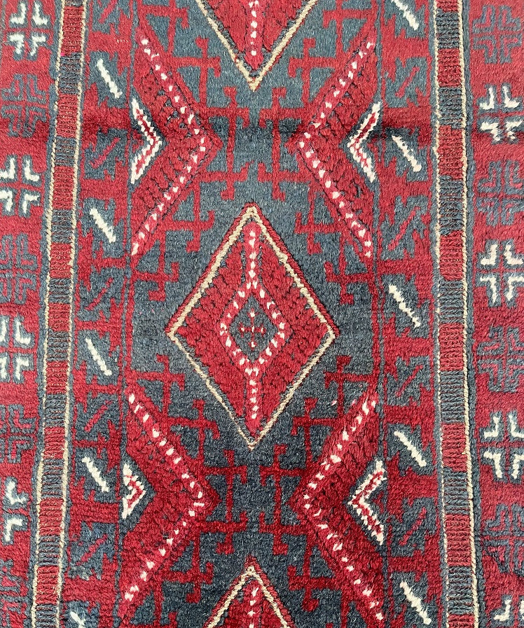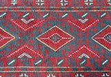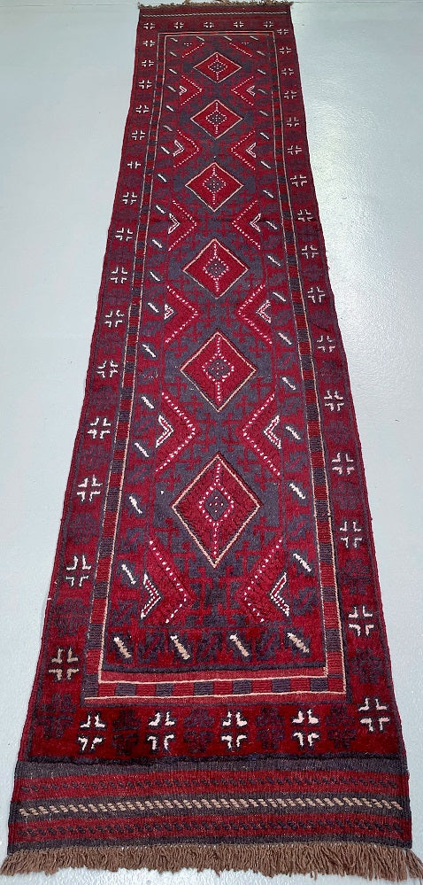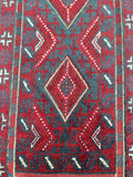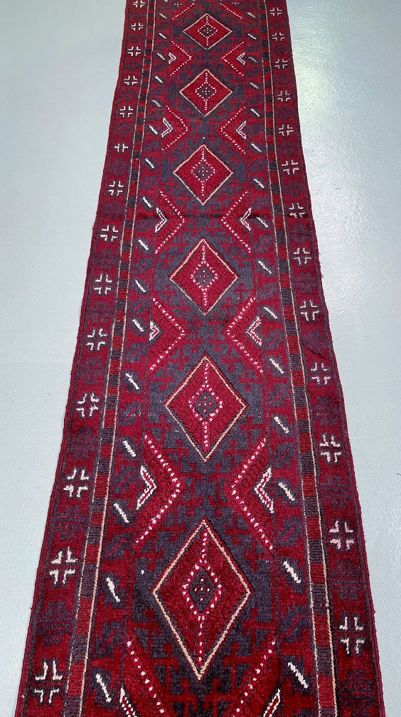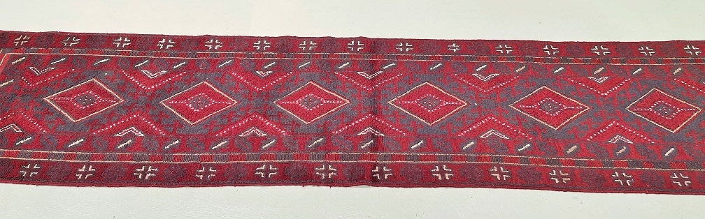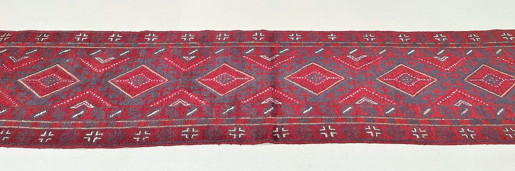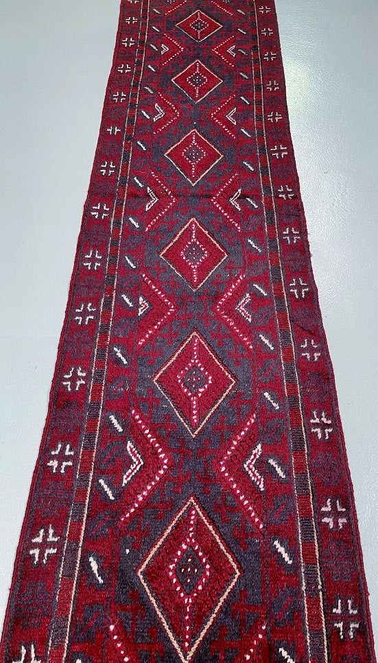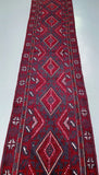 Hand Woven Afghan Mishwani Balouchi Hall Runner. Above All Three Weaving Technique Used To Make This Runner. It also Has A Pure Hand Spun Wool Pile On Wool Base. Red, Beige And Blue Tone Dyed Using Traditional Methods.
