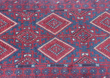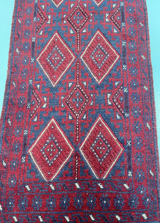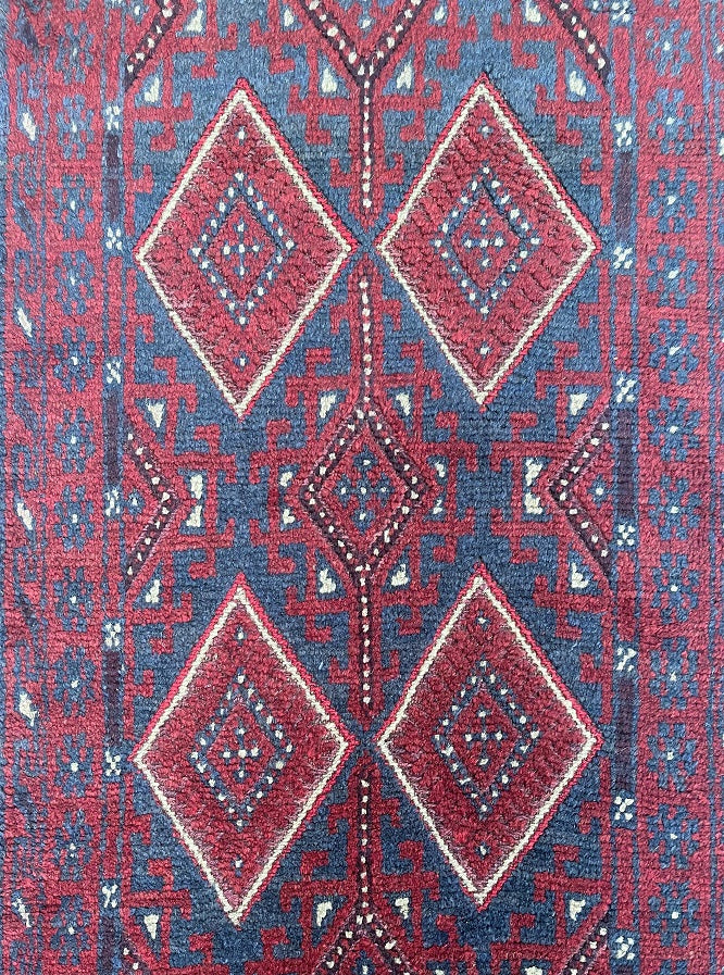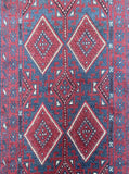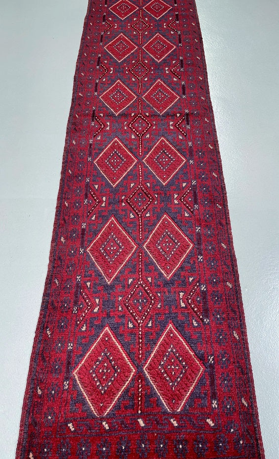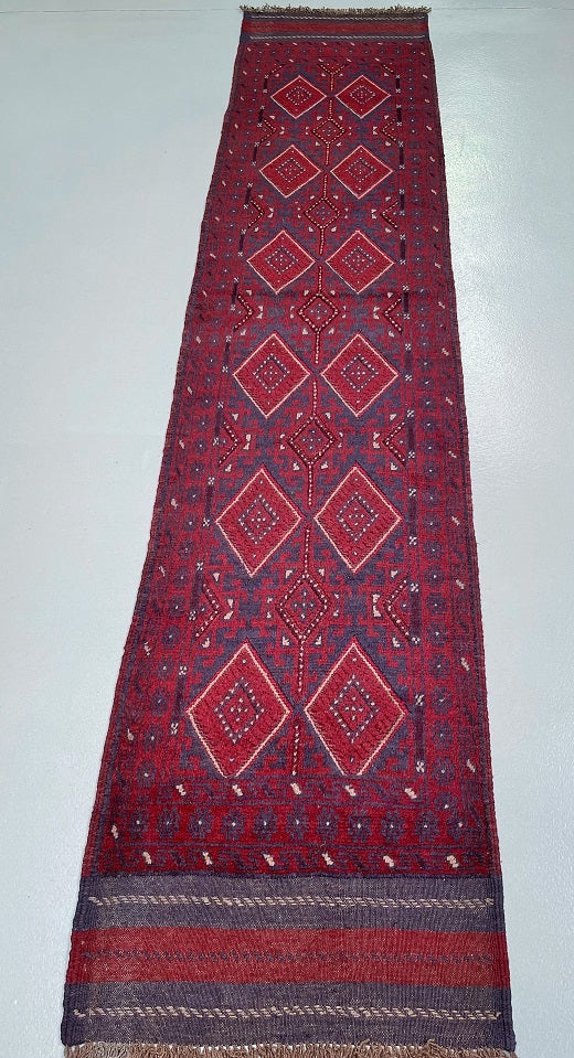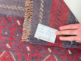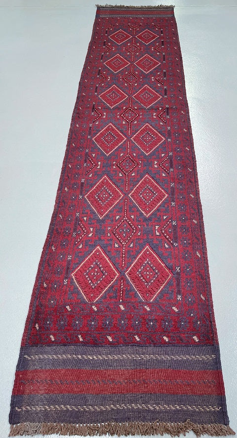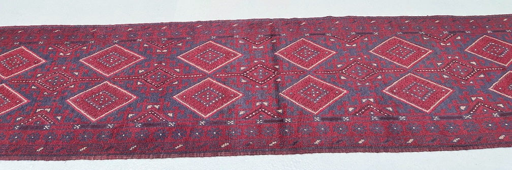 Hand Woven Afghan Mishwani Balouchi Hall Runner. Above All Three Weaving Technique Used To Make This Runner. It also Has A Pure Hand Spun Wool Pile On Wool Base. Red, Beige And Charcoal Blue Tones Dyed Using Traditional Methods.