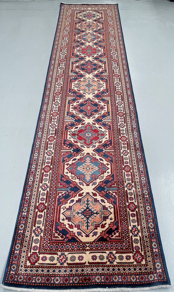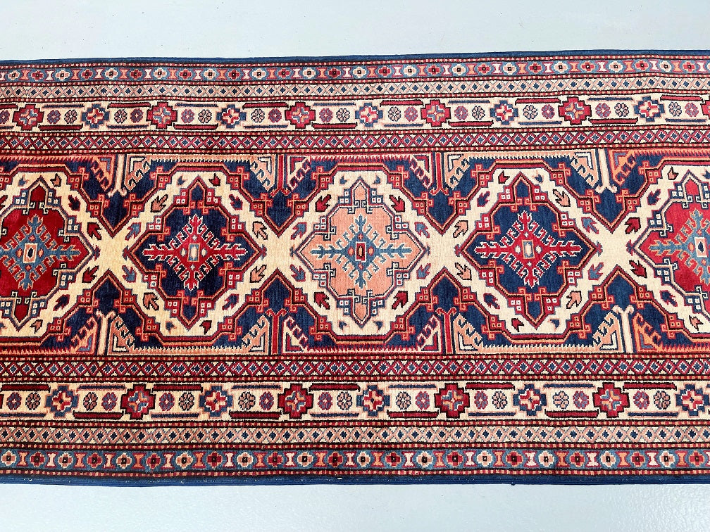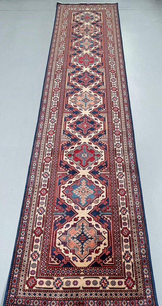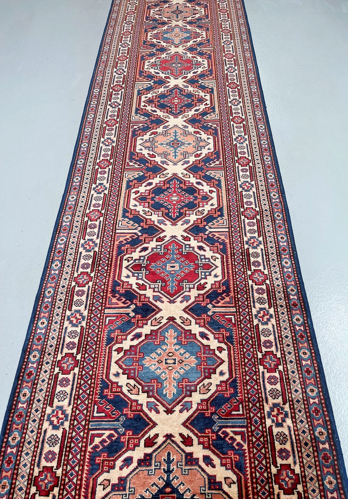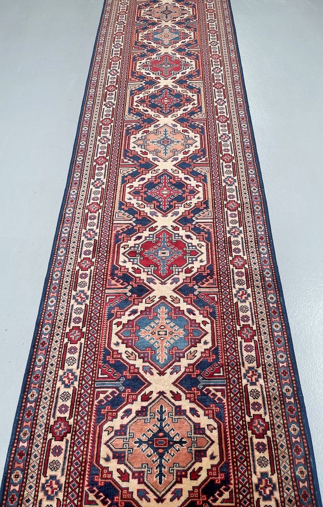 Superb Authentic Handmade Afghan Royal Kazak Hall Runner. Above All It Is Pure Hand Spun Wool Pile On Cotton Base. Unique Beige, Blue, Burgundy, Peach And Orange Tone Dyed Using Traditional Methods (Vegetable Dyes). Last Of True Woven Tribal Art.