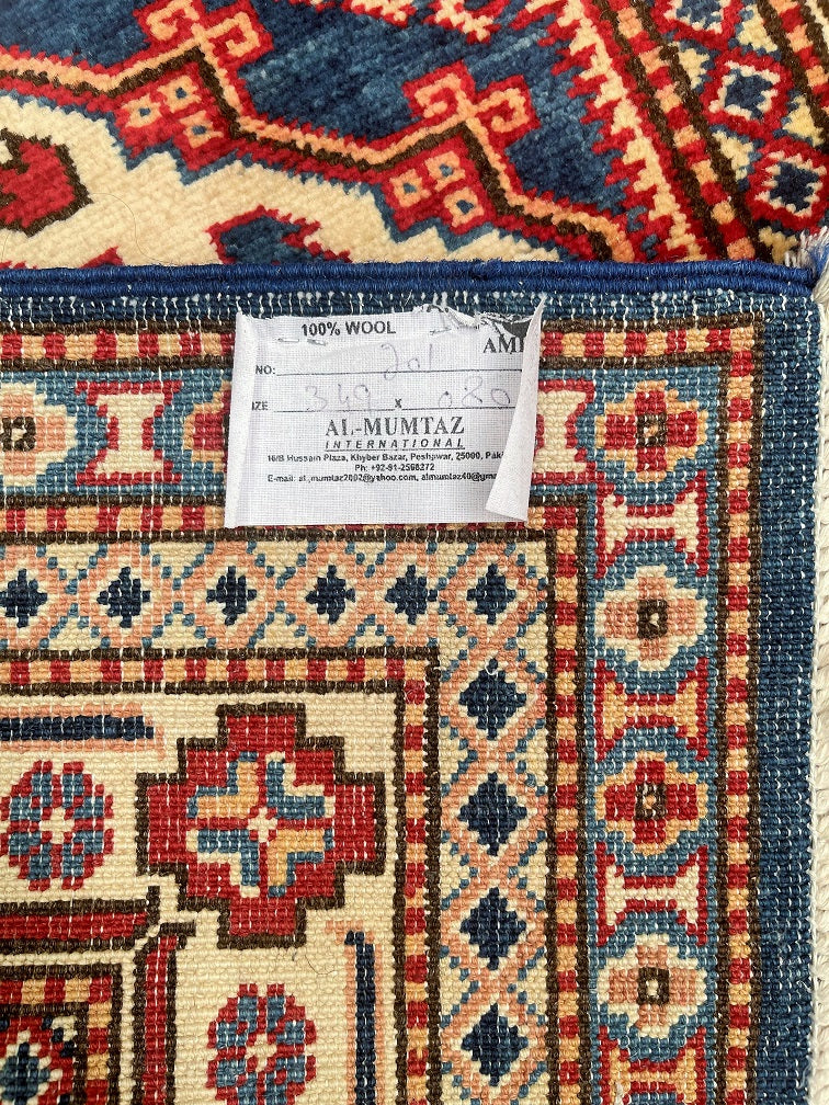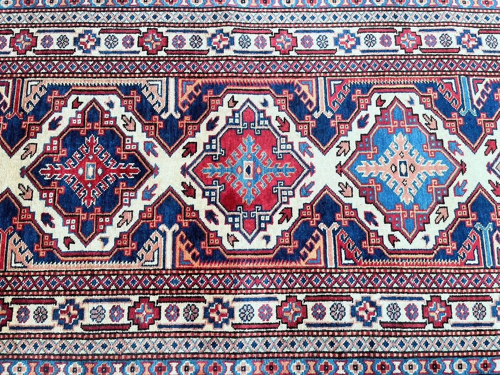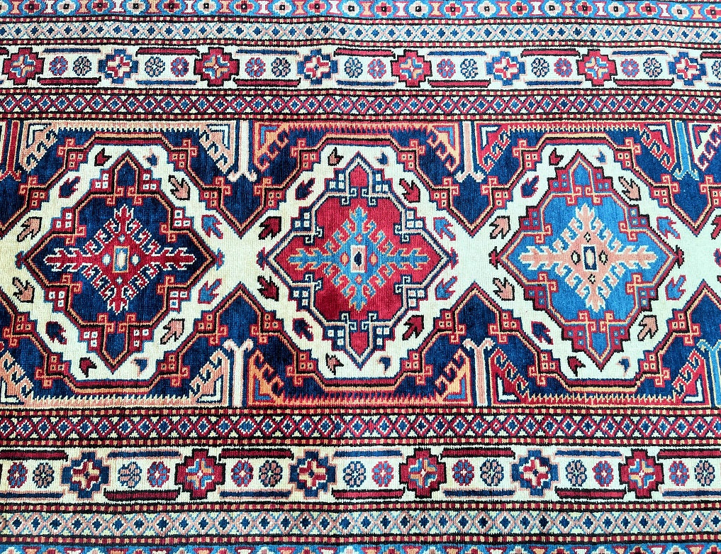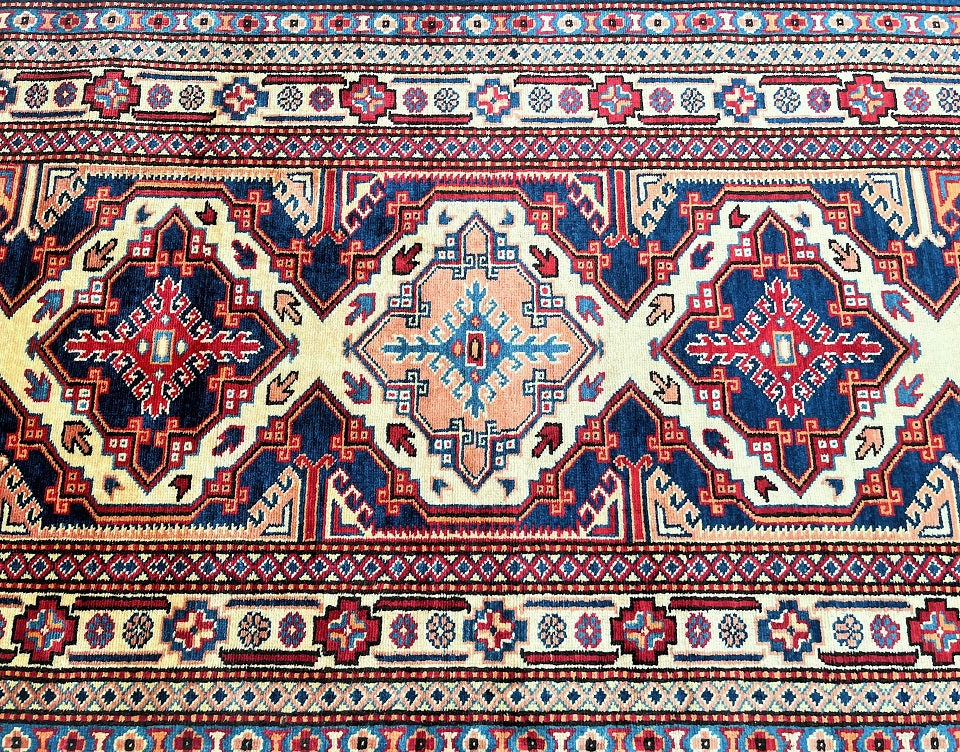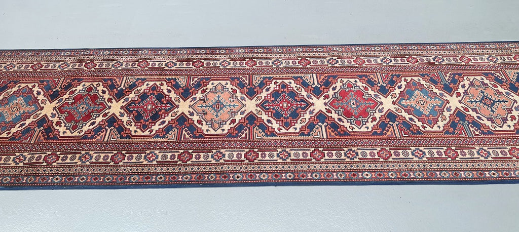 Superb Authentic Handmade Afghan Royal Kazak Hall Runner. Above All It Is Pure Hand Spun Wool Pile On Cotton Base. Unique Beige, Blue, Burgundy, Peach And Orange Tone Dyed Using Traditional Methods (Vegetable Dyes). Last Of True Woven Tribal Art.