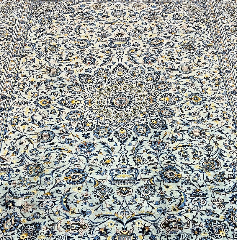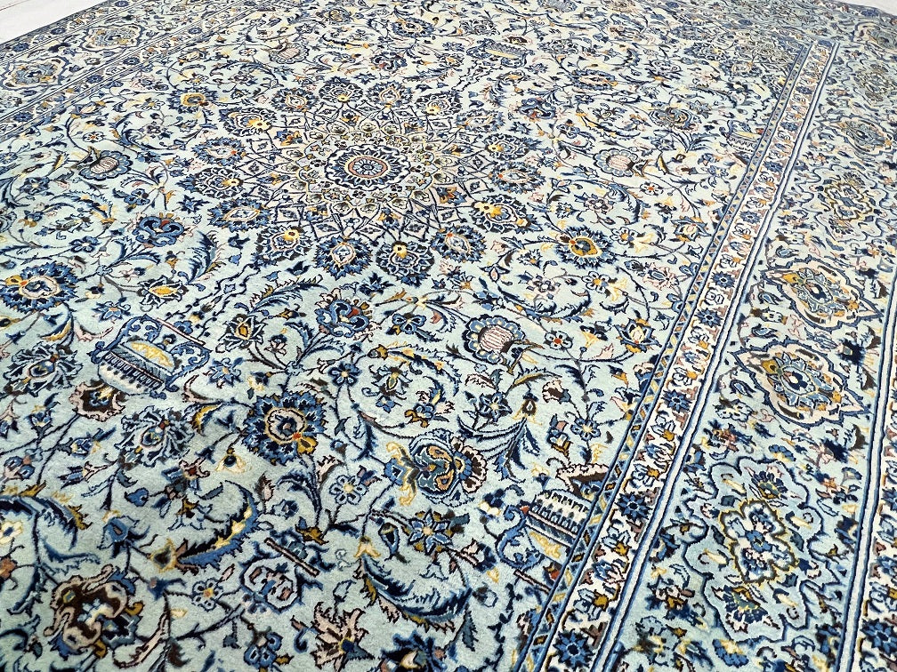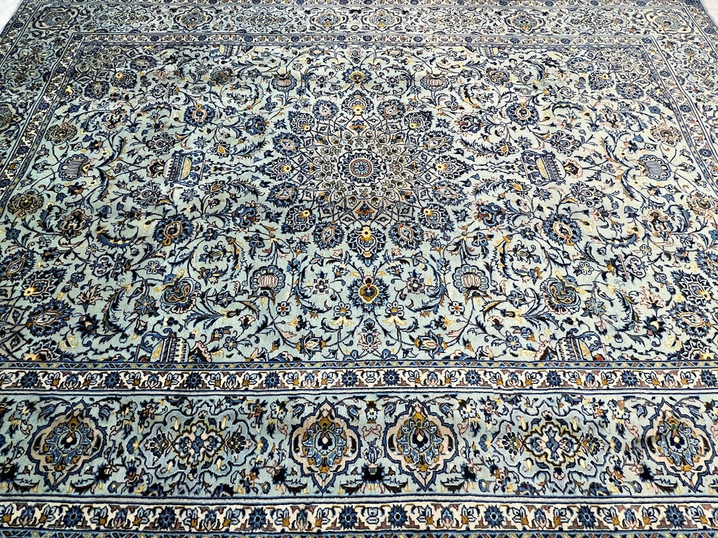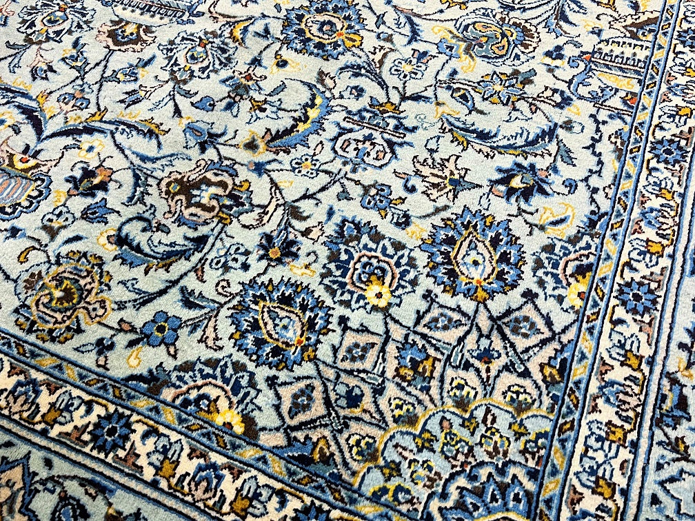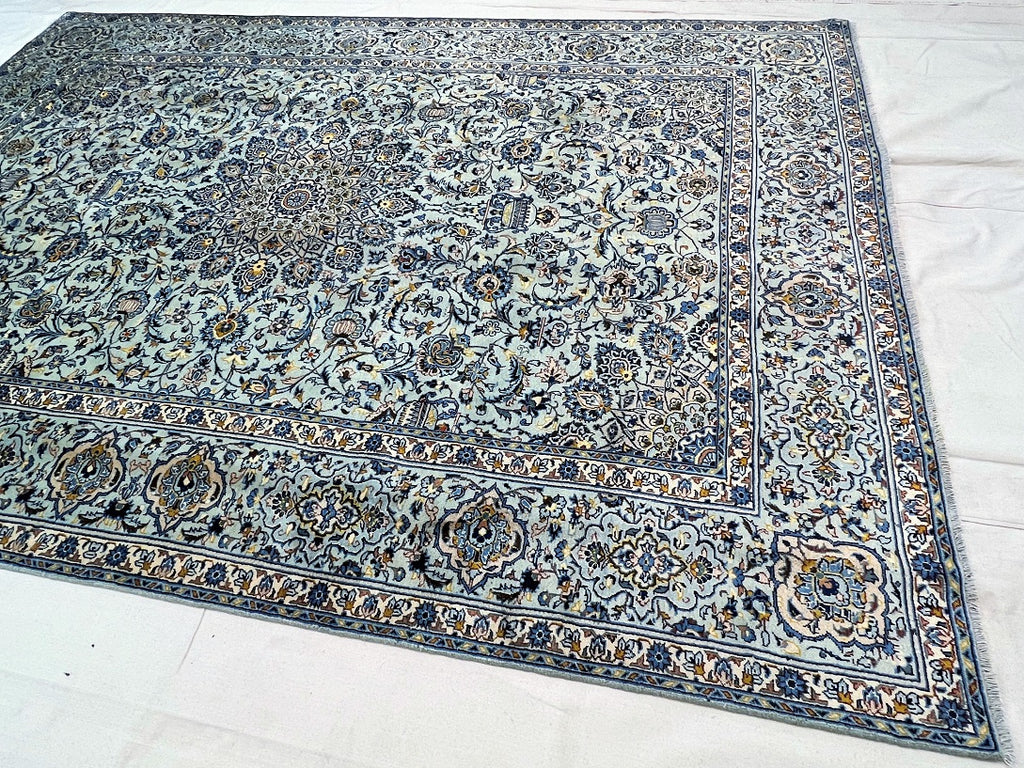 Large Room Size Pistachio Tone Handmade Authentic Persian Kashan Rug. Above All It Is Hard To Get This Quality Original Handmade Rug In This Colour. It Is Also Pure Lamb’s Wool Pile on Cotton Base. Pistachio Green, Blue, Beige And Touch Of Yellow Tone Dyed Using Traditional Methods.